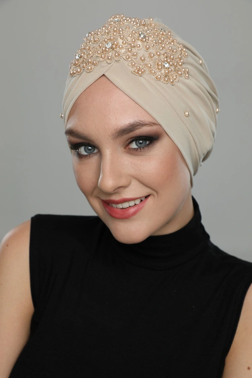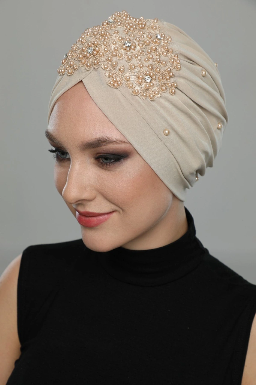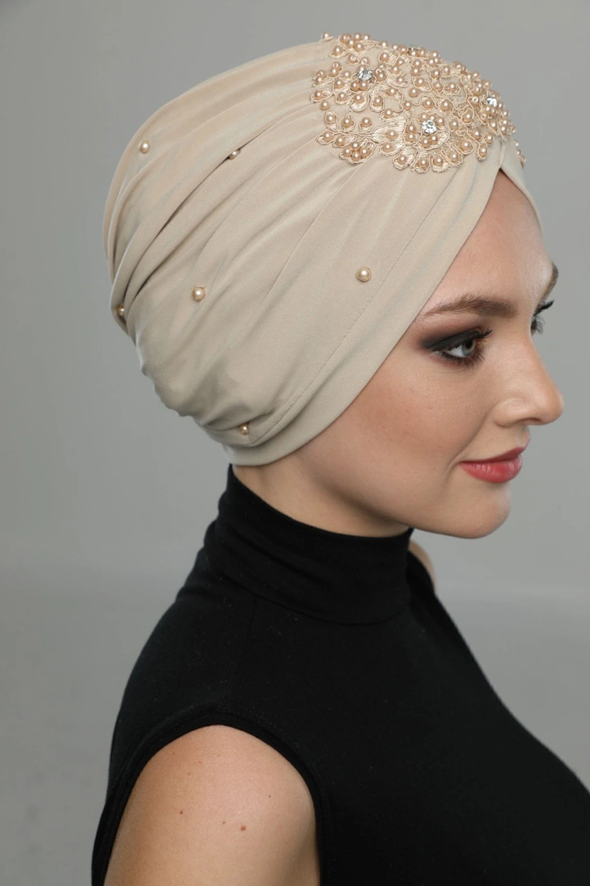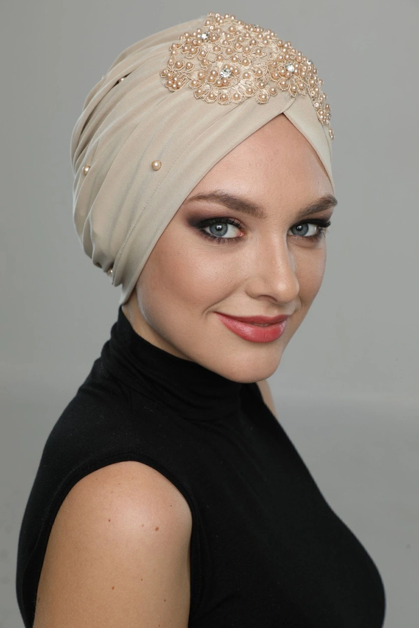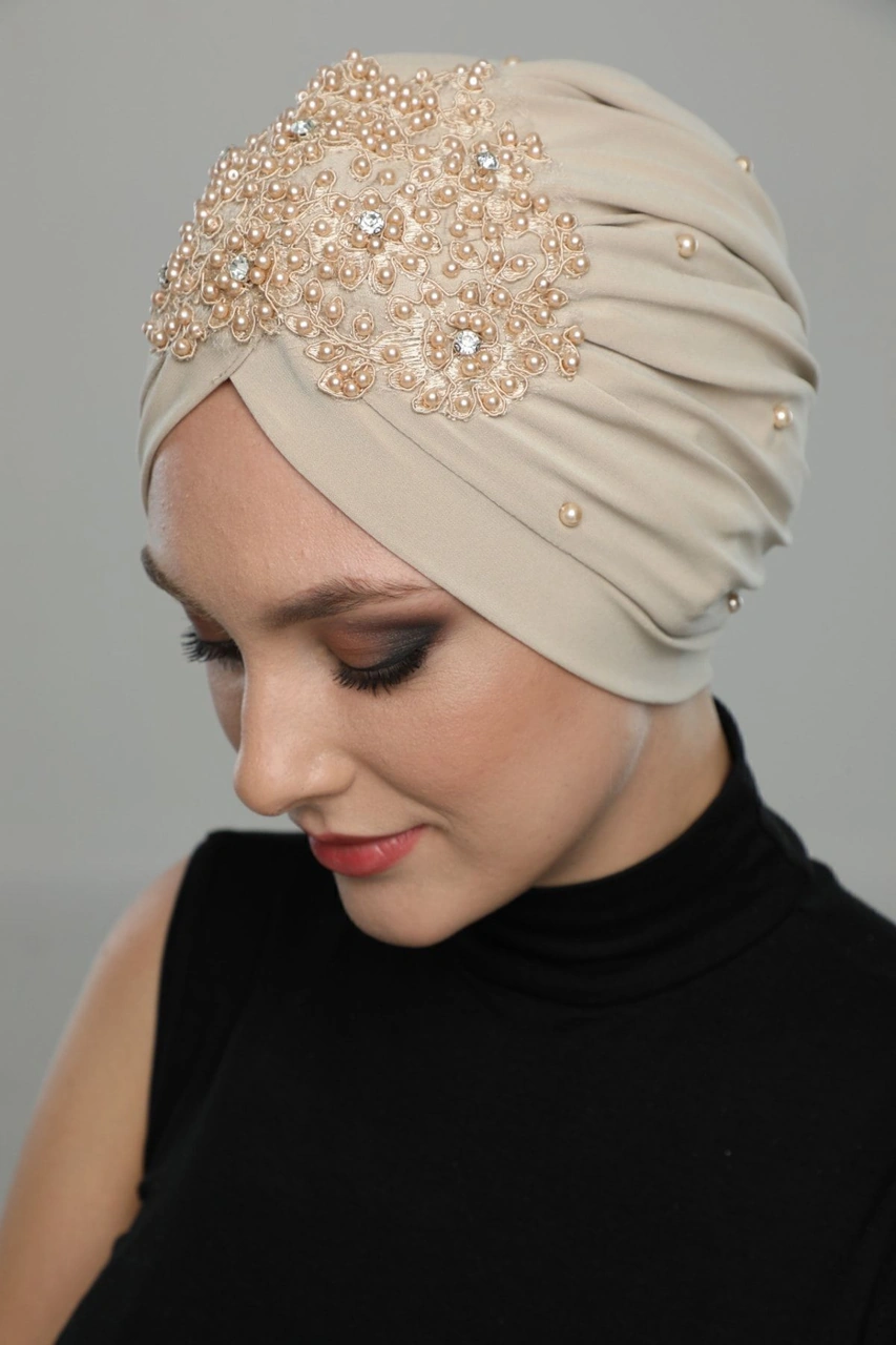 Kopma Astarlı Işlemeli Bej Dantel Motifli Hazır Türban Tesettür Abiye Bone Bej Dantel