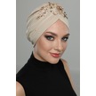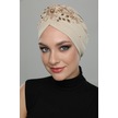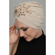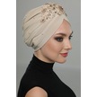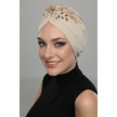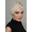 Kopma Astarlı İşlemeli Bej Sırma Motifli Hazır Türban Tesettür Abiye Bone Bej