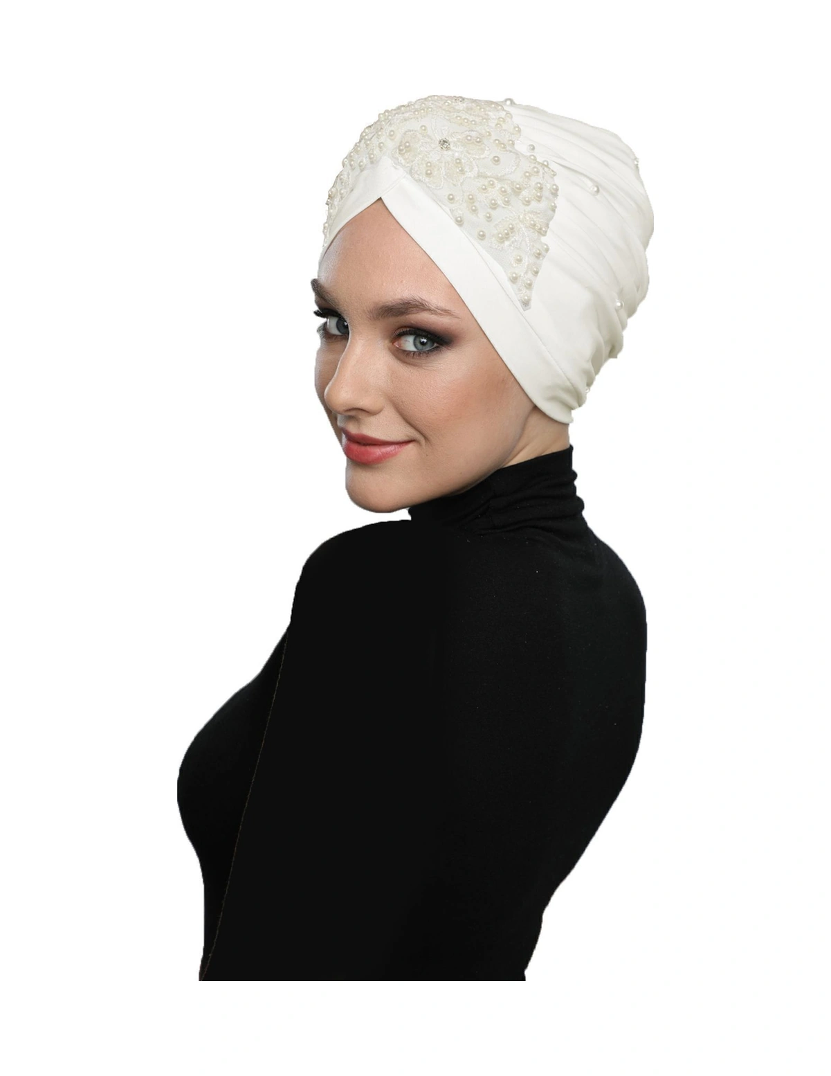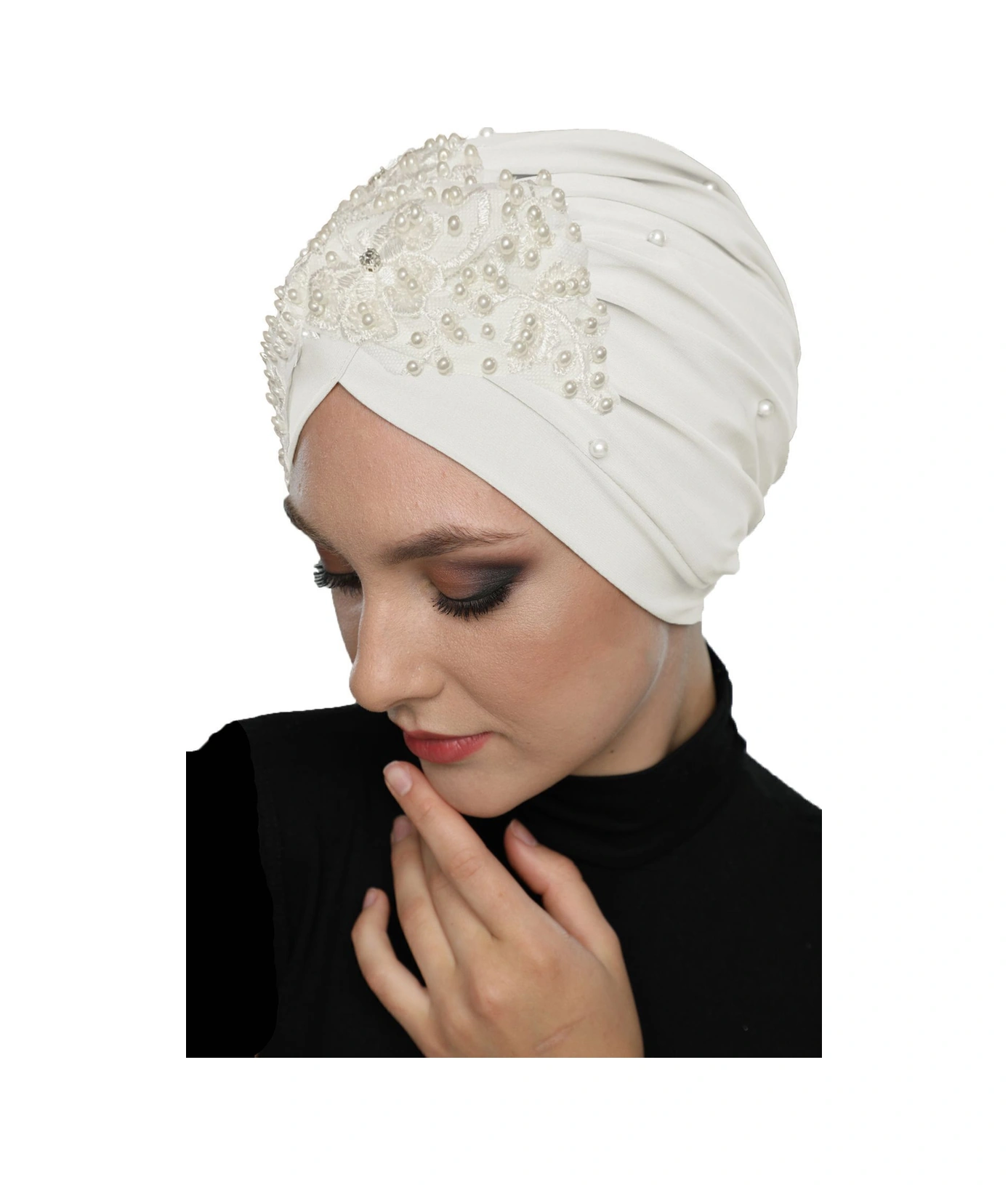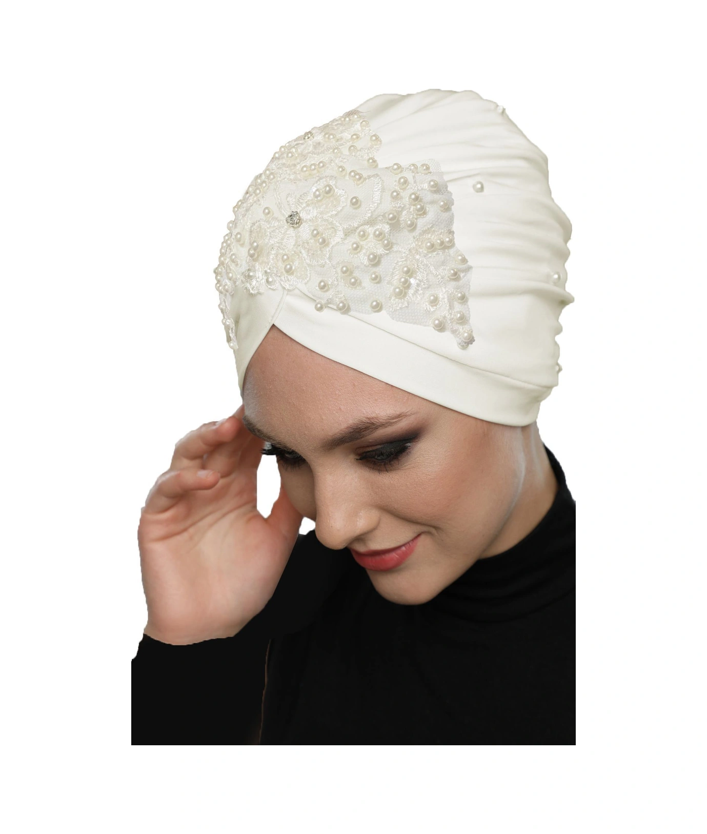 Kopma Astarlı İşlemeli Krem Çiçek Dantel Motifli Hazır Türban Tesettür Abiye Bone Krem-çiçek