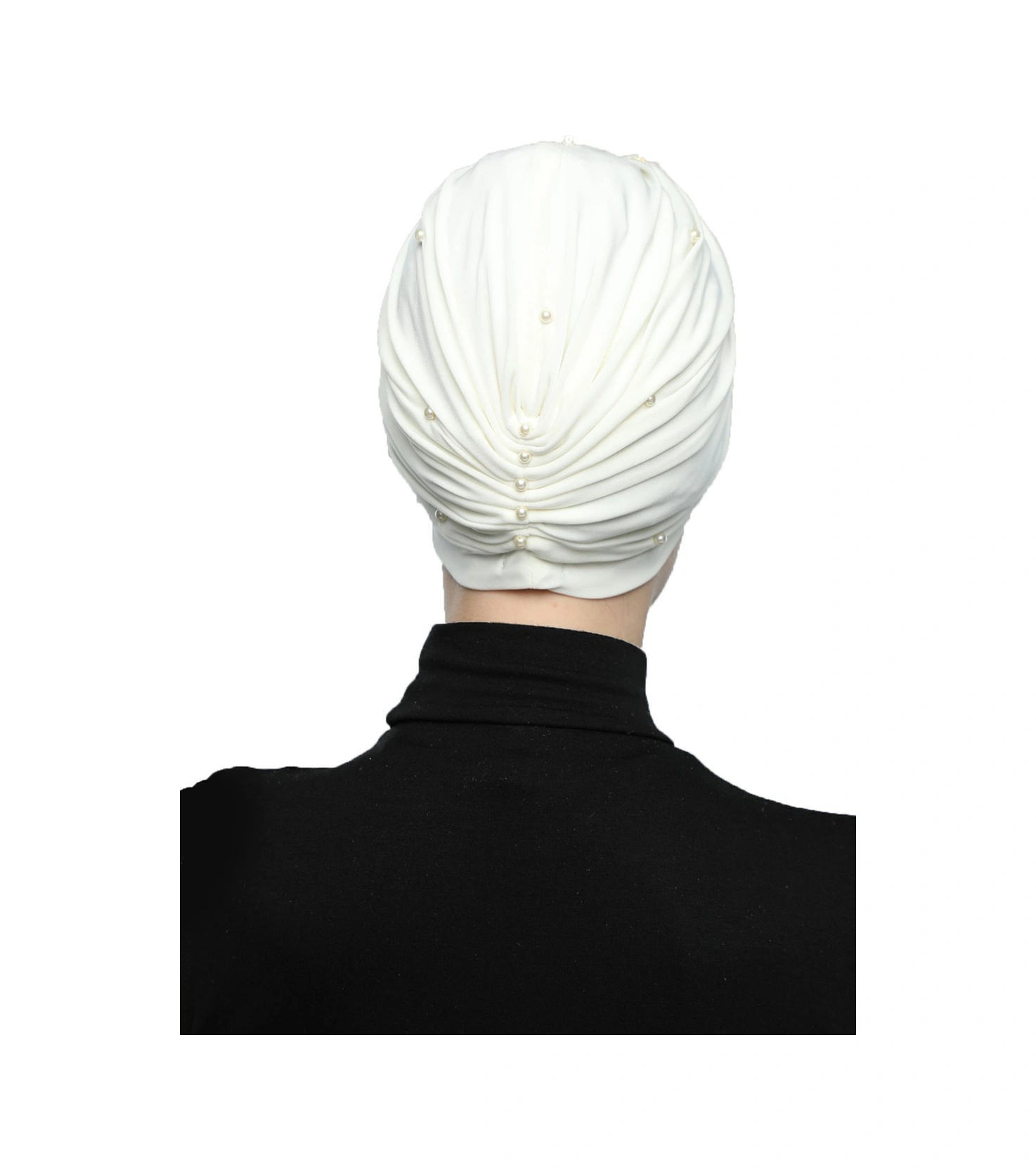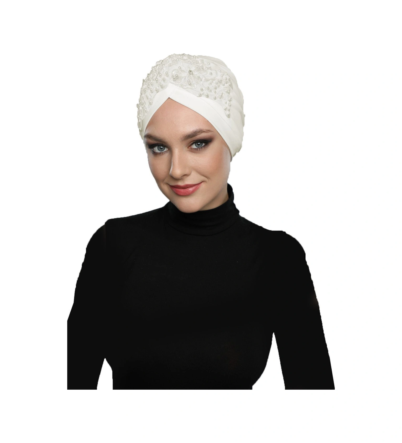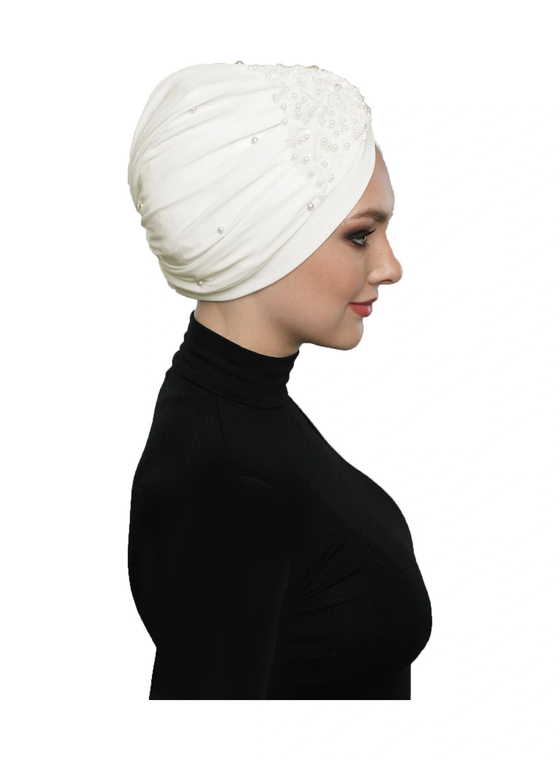 Kopma Astarlı İşlemeli Krem Çiçek Dantel Motifli Hazır Türban Tesettür Abiye Bone Krem-çiçek