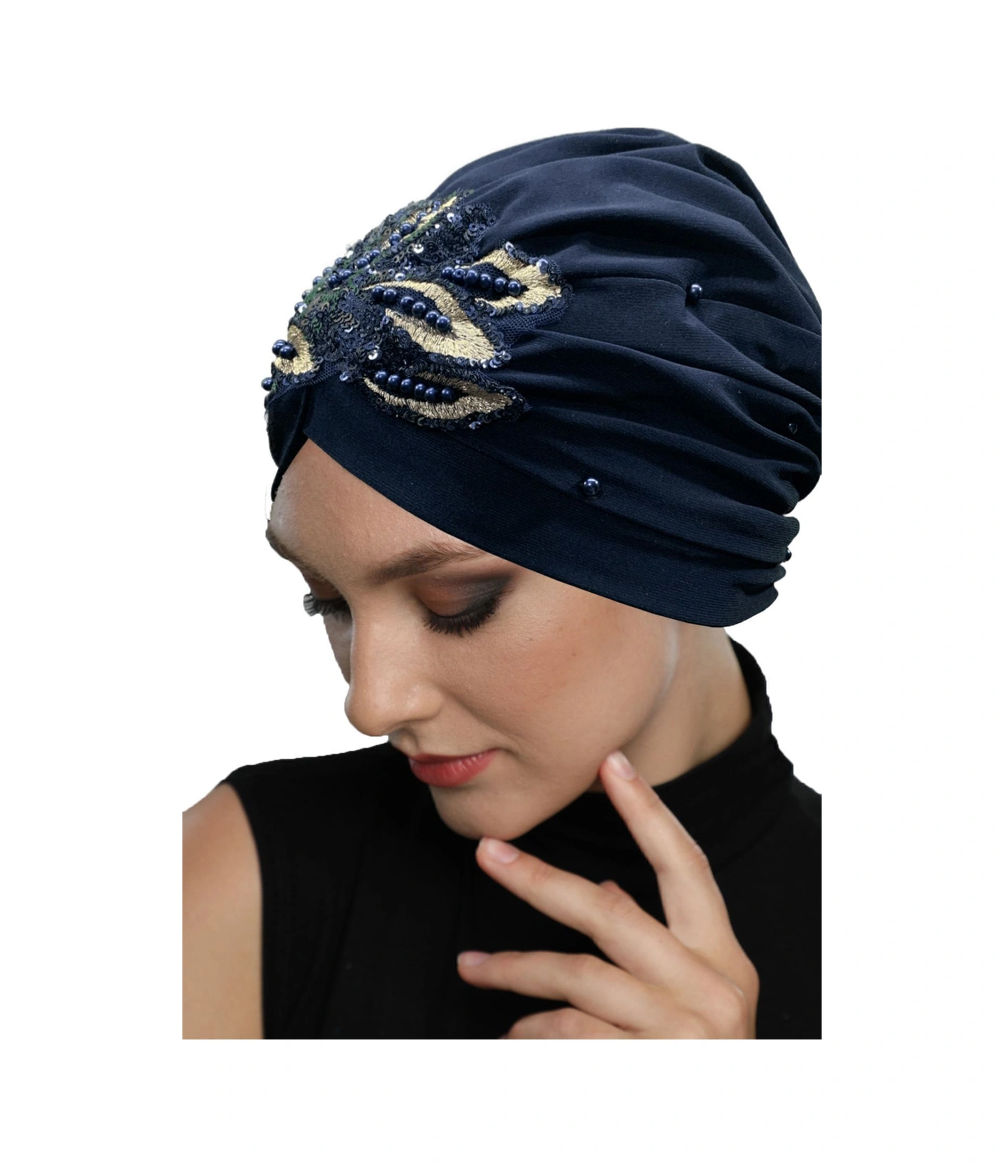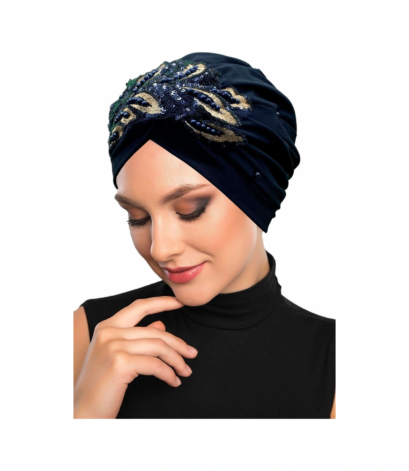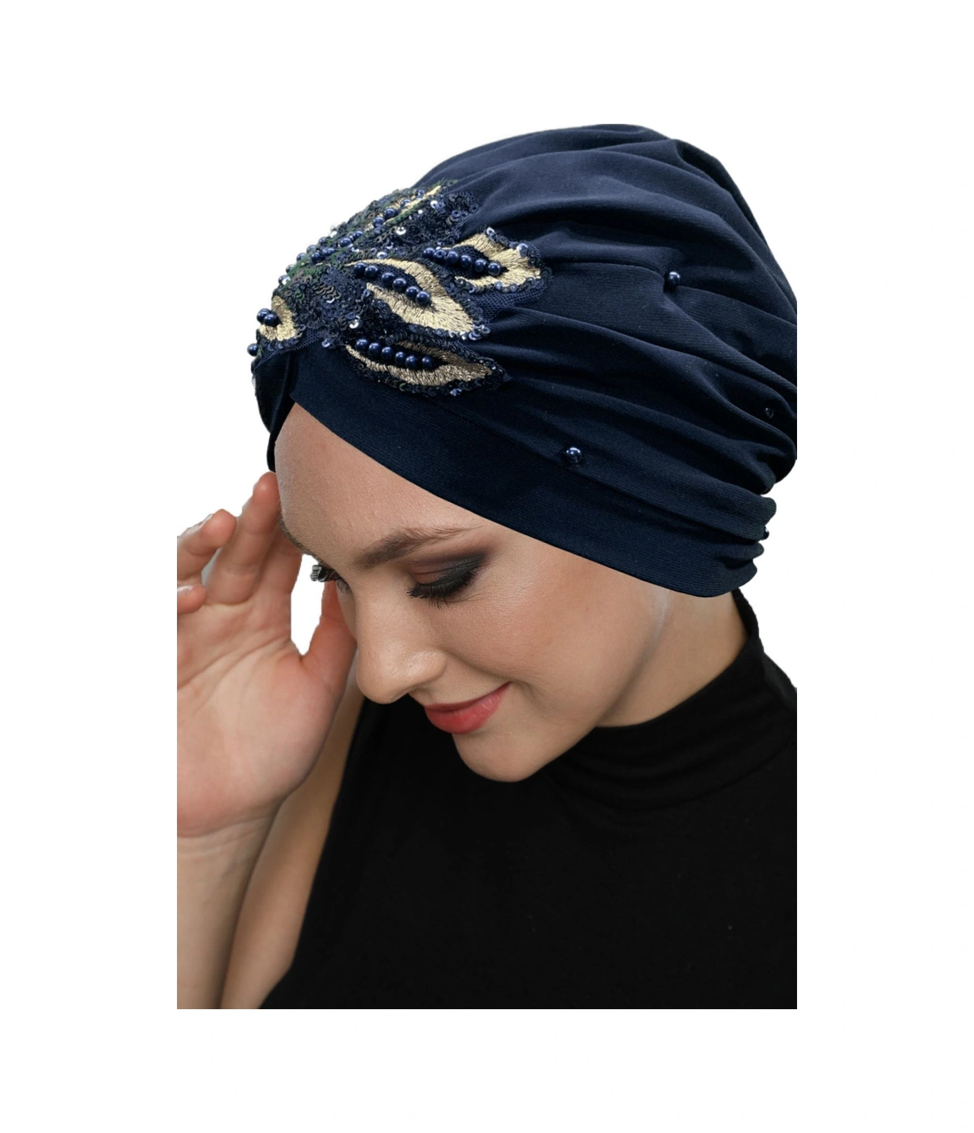 Kopma Astarlı Işlemeli Lacivert Payetli Yaprak Motifli Hazır Türban Tesettür Abiye Bone Lacivert Yaprak