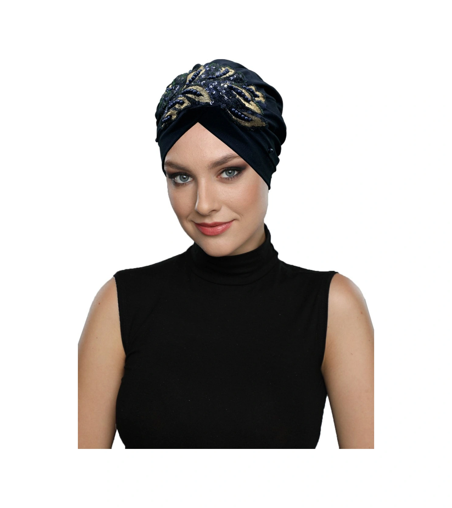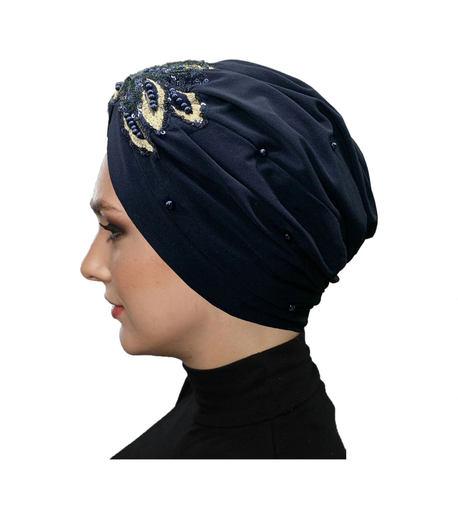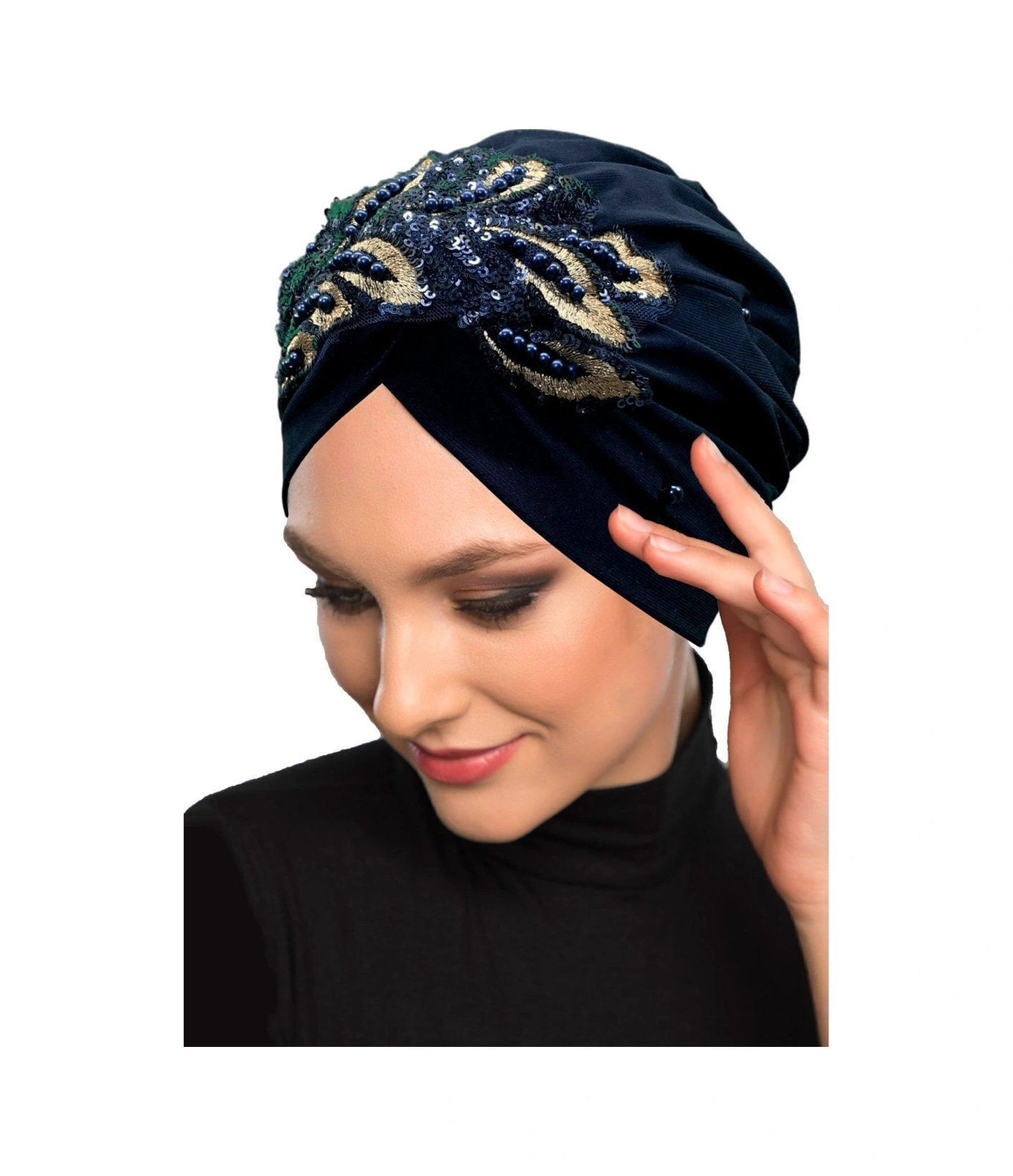 Kopma Astarlı Işlemeli Lacivert Payetli Yaprak Motifli Hazır Türban Tesettür Abiye Bone Lacivert Yaprak