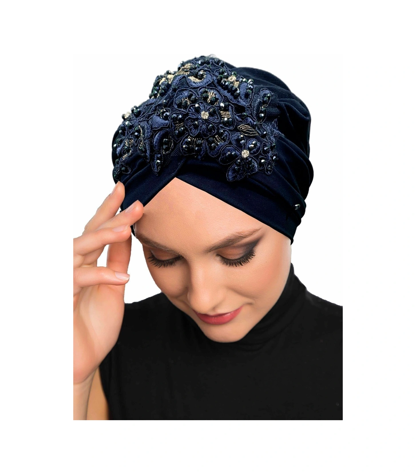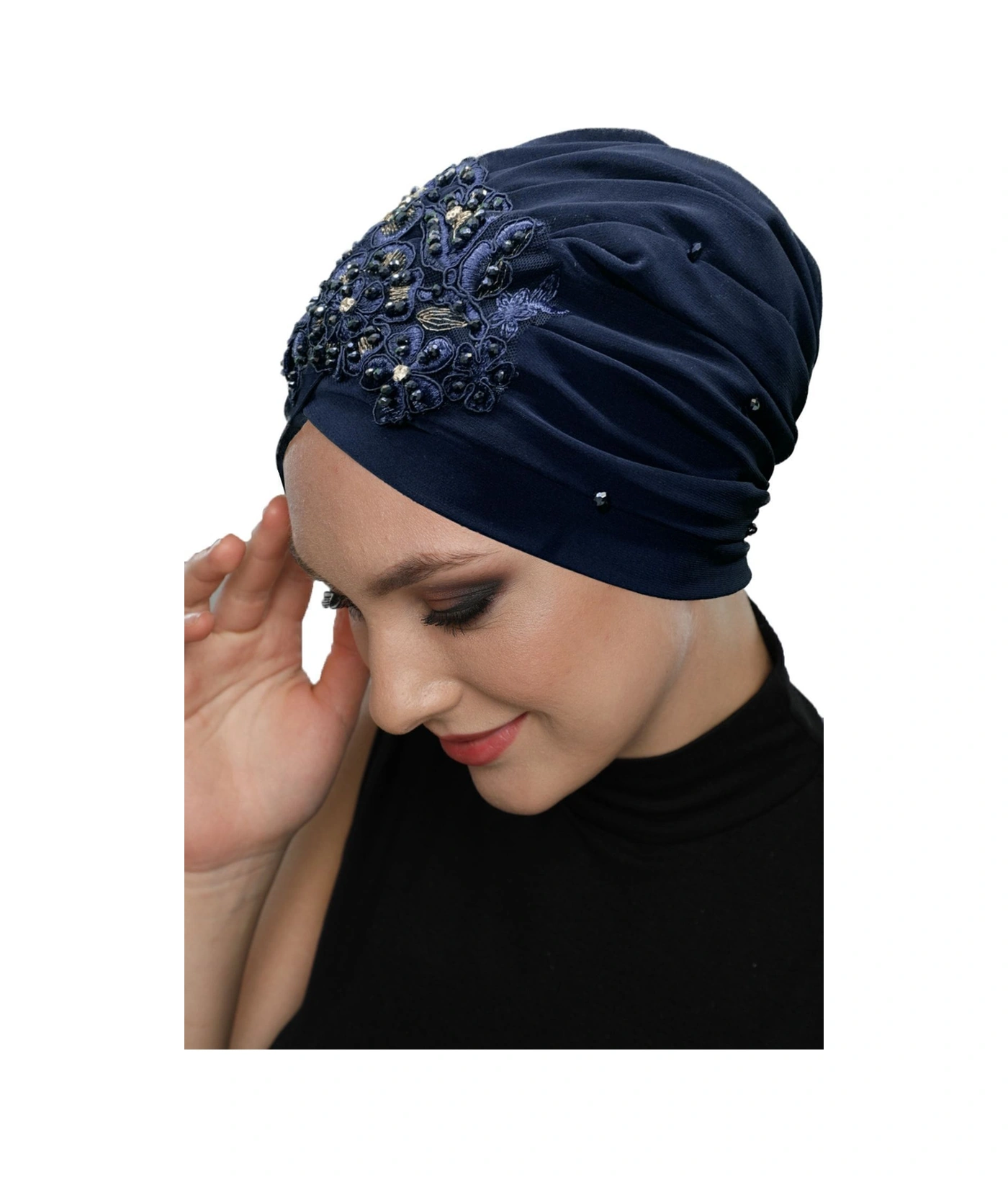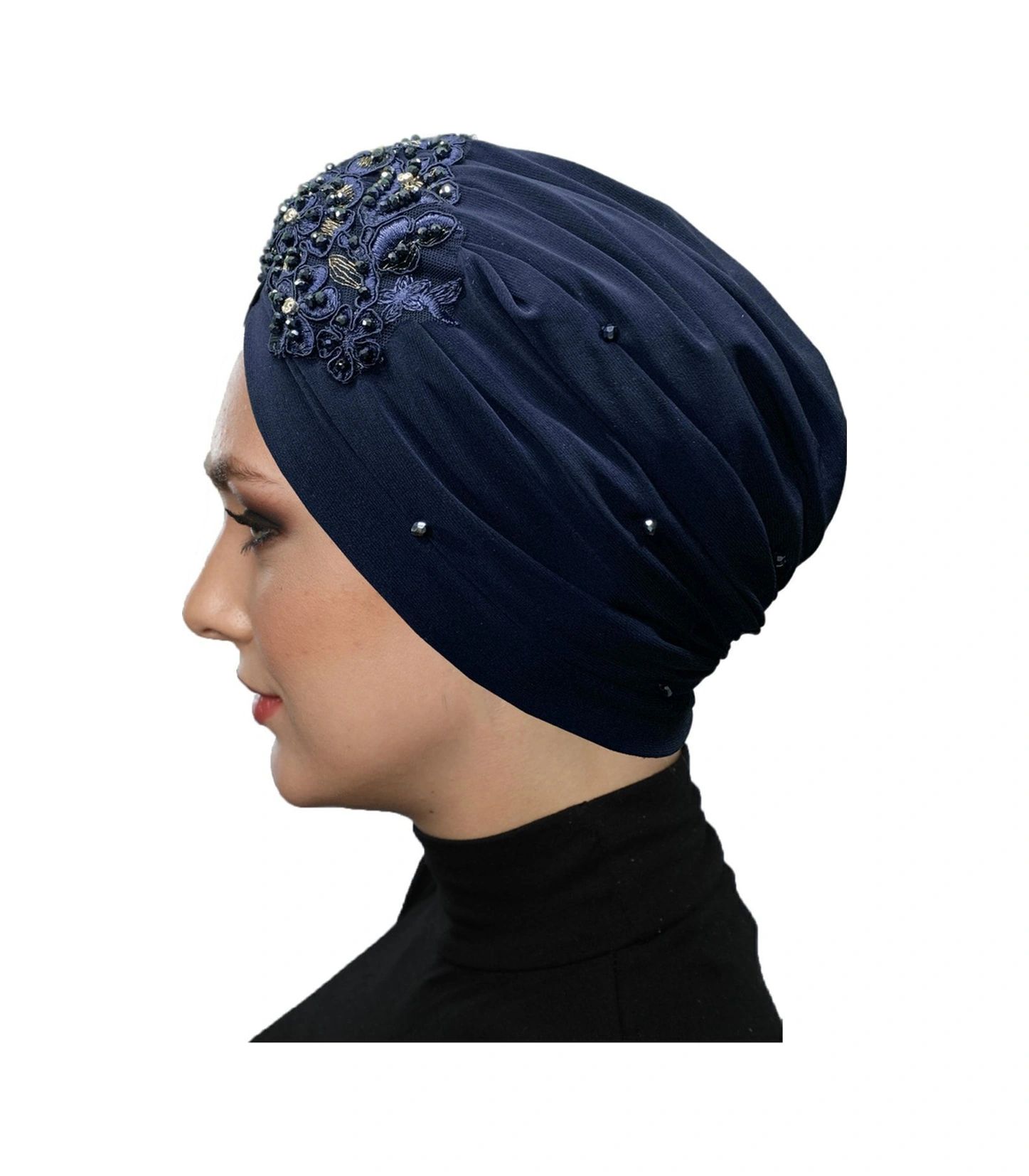 Kopma Astarlı Işlemeli Lacivert Sarı Dantel Motifli Hazır Türban Tesettür Abiye Bone Lacivert Sarı Dantel