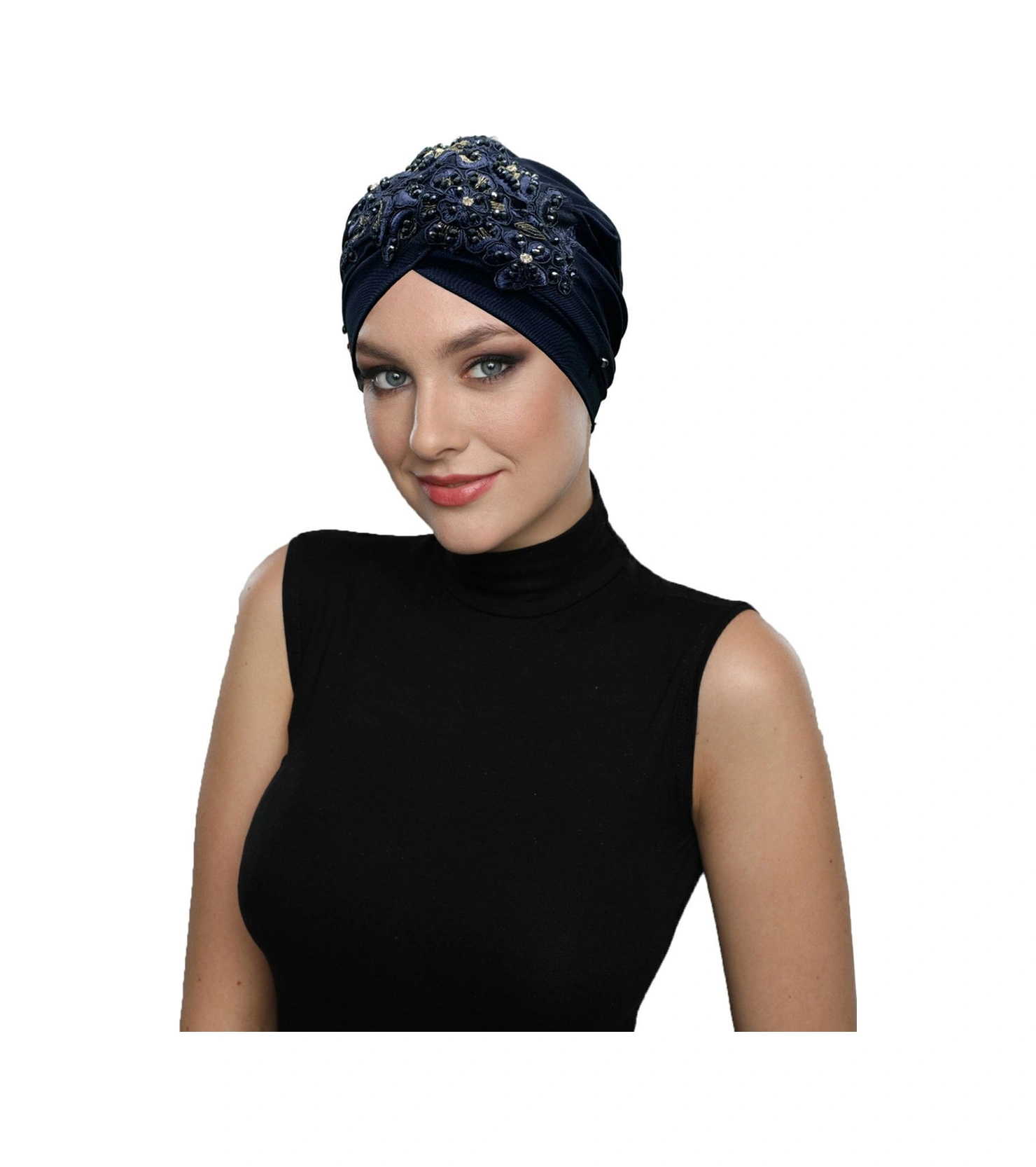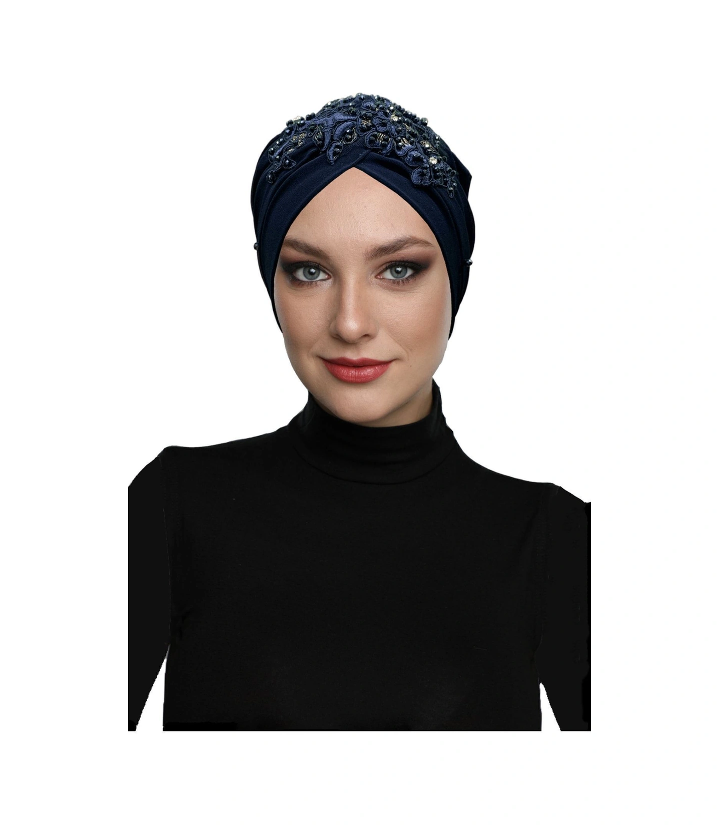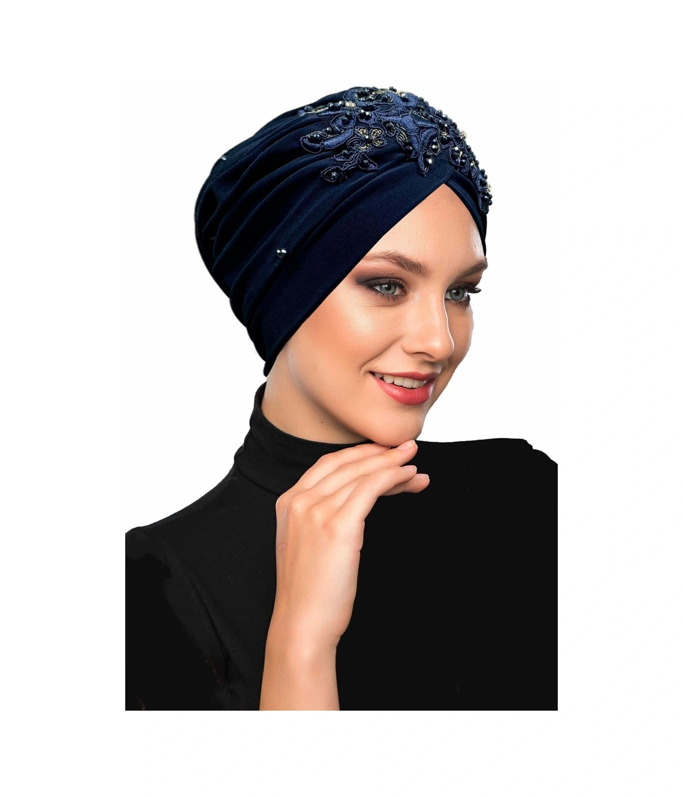 Kopma Astarlı Işlemeli Lacivert Sarı Dantel Motifli Hazır Türban Tesettür Abiye Bone Lacivert Sarı Dantel