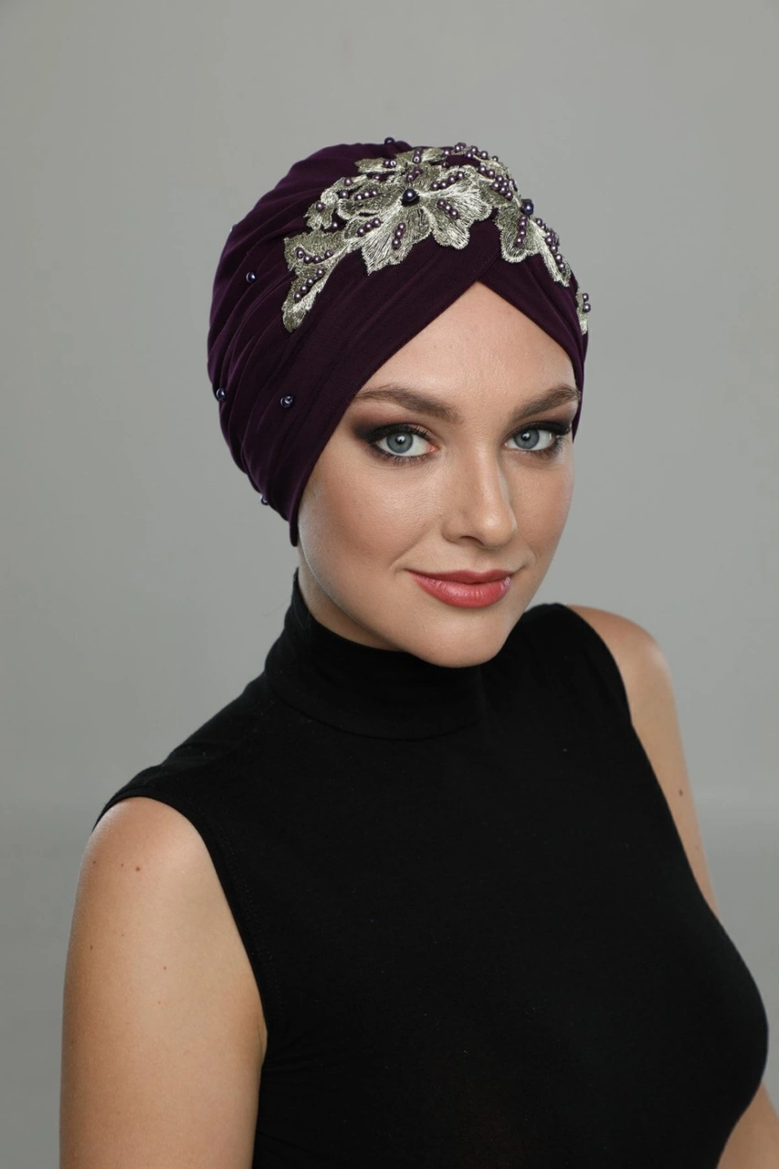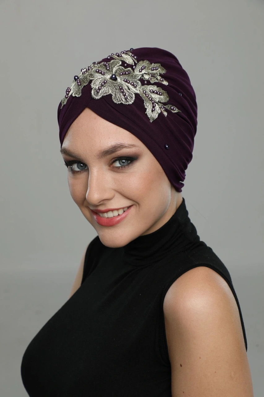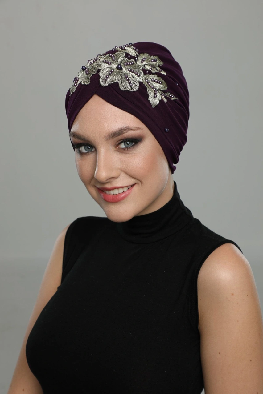 Kopma Astarlı Işlemeli Mor Sırma Motifli Hazır Türban Tesettür Abiye Bone Mor Sırma