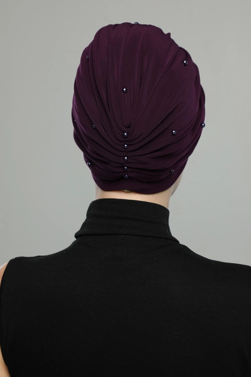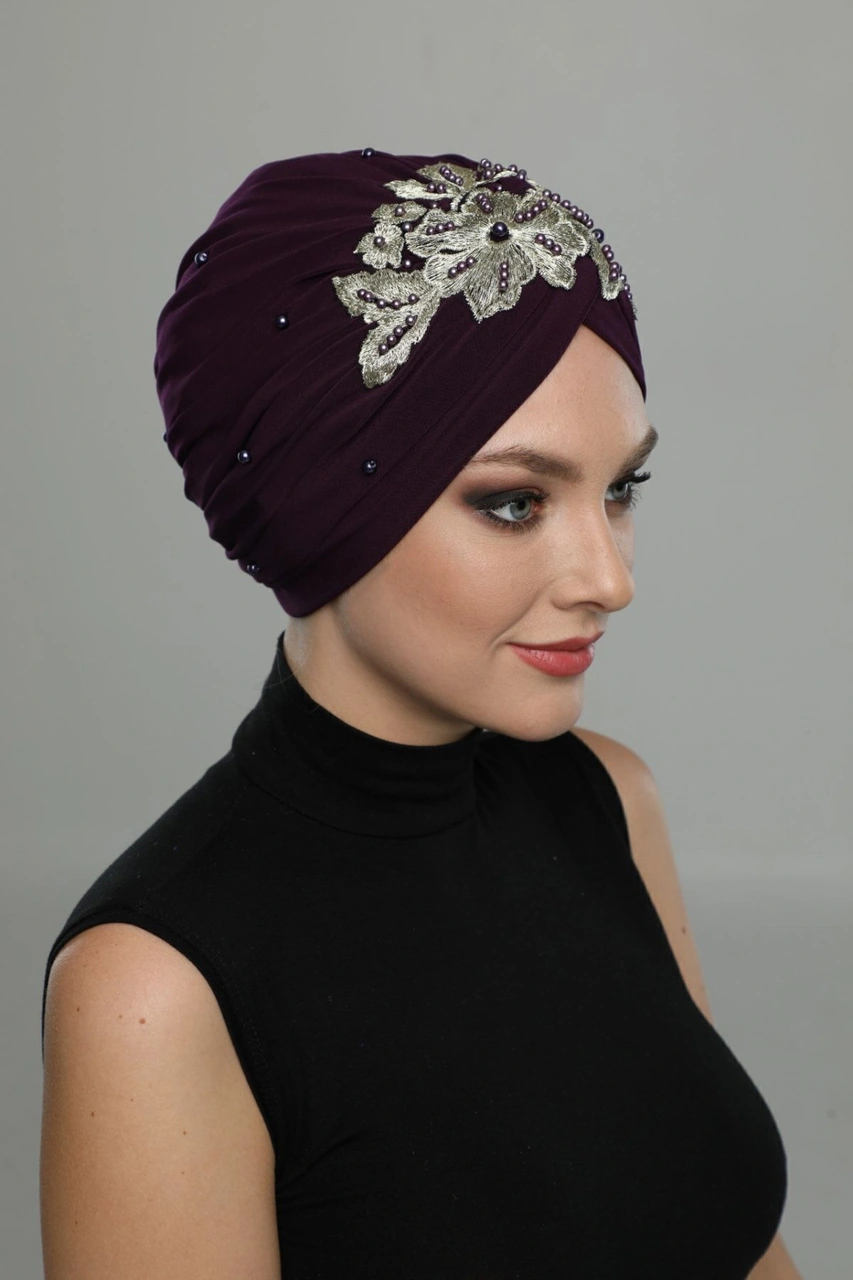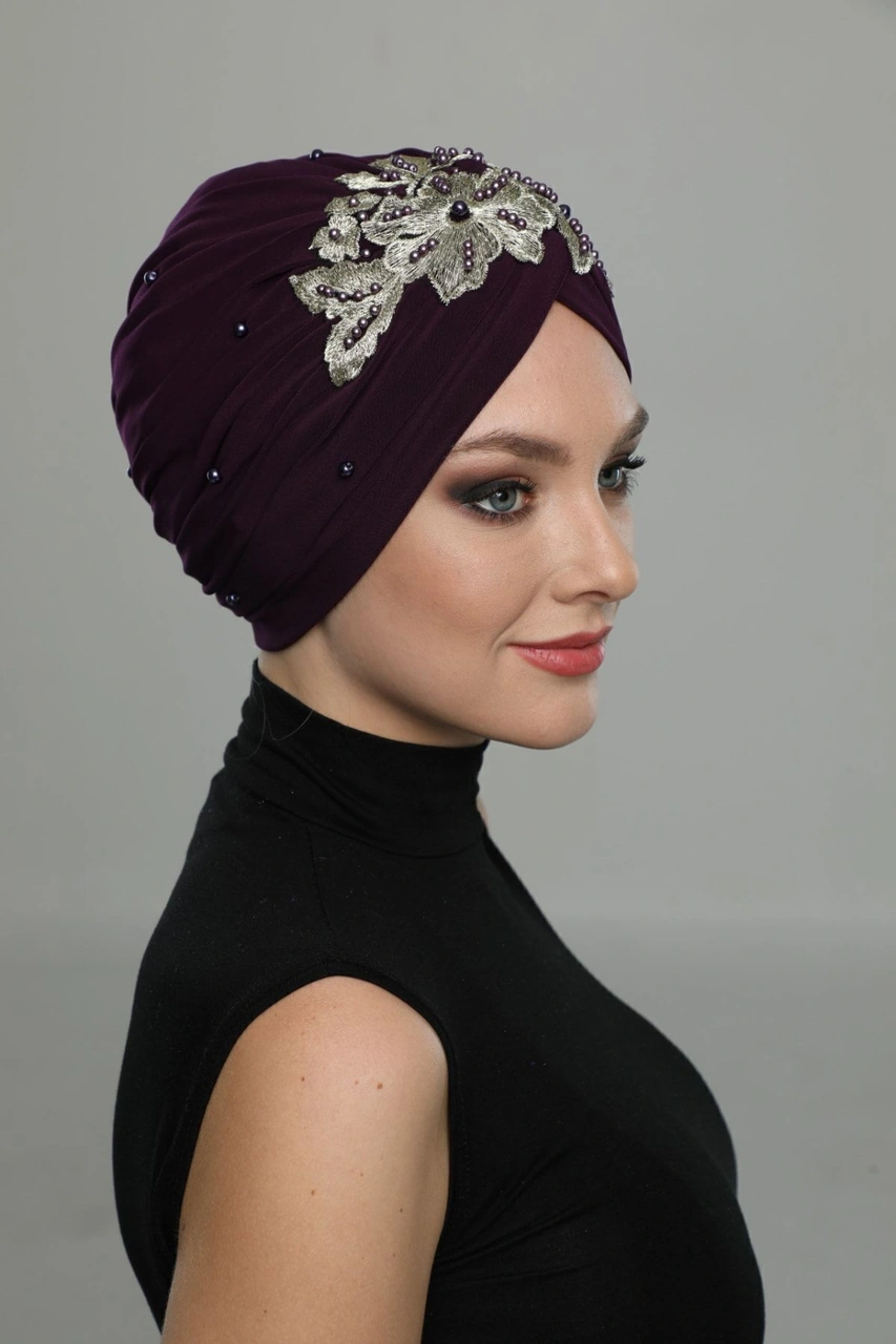 Kopma Astarlı Işlemeli Mor Sırma Motifli Hazır Türban Tesettür Abiye Bone Mor Sırma