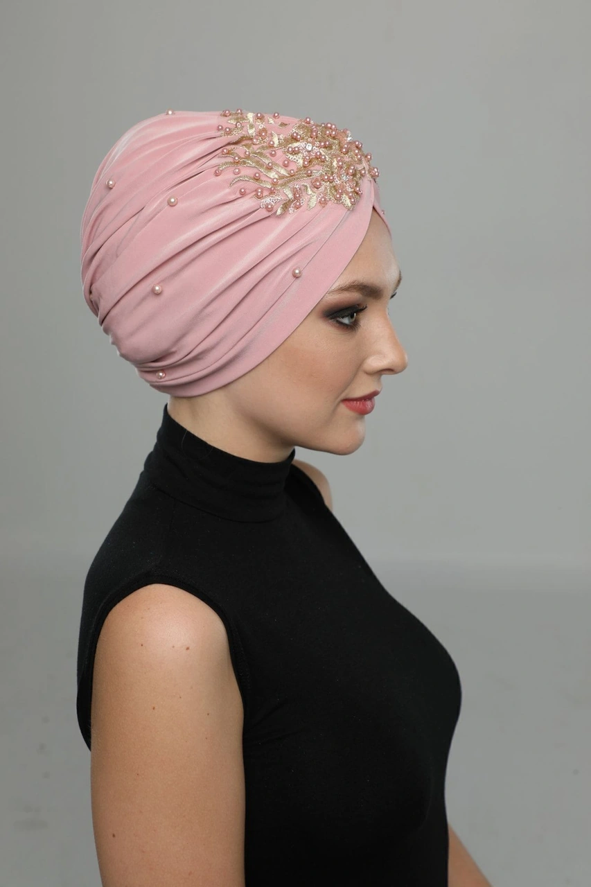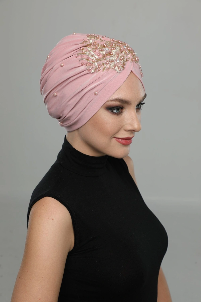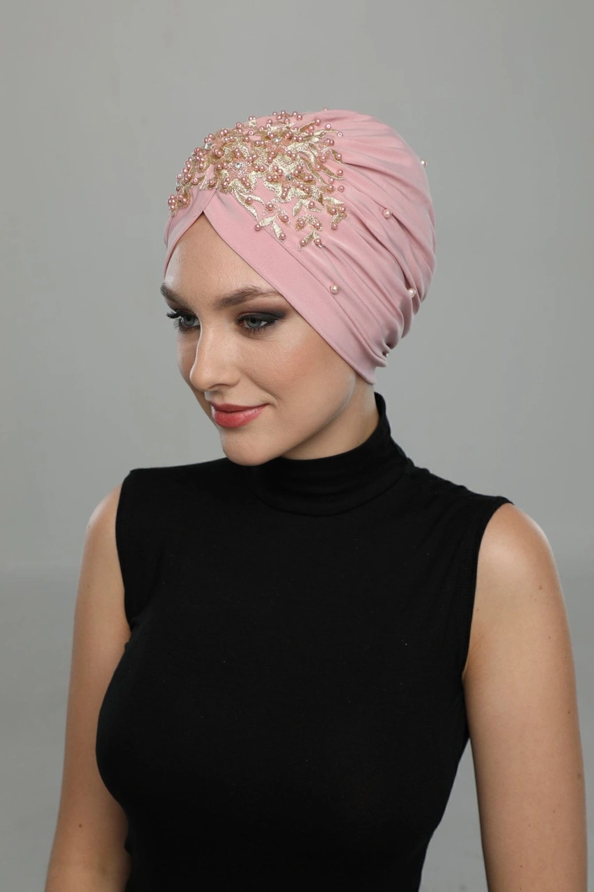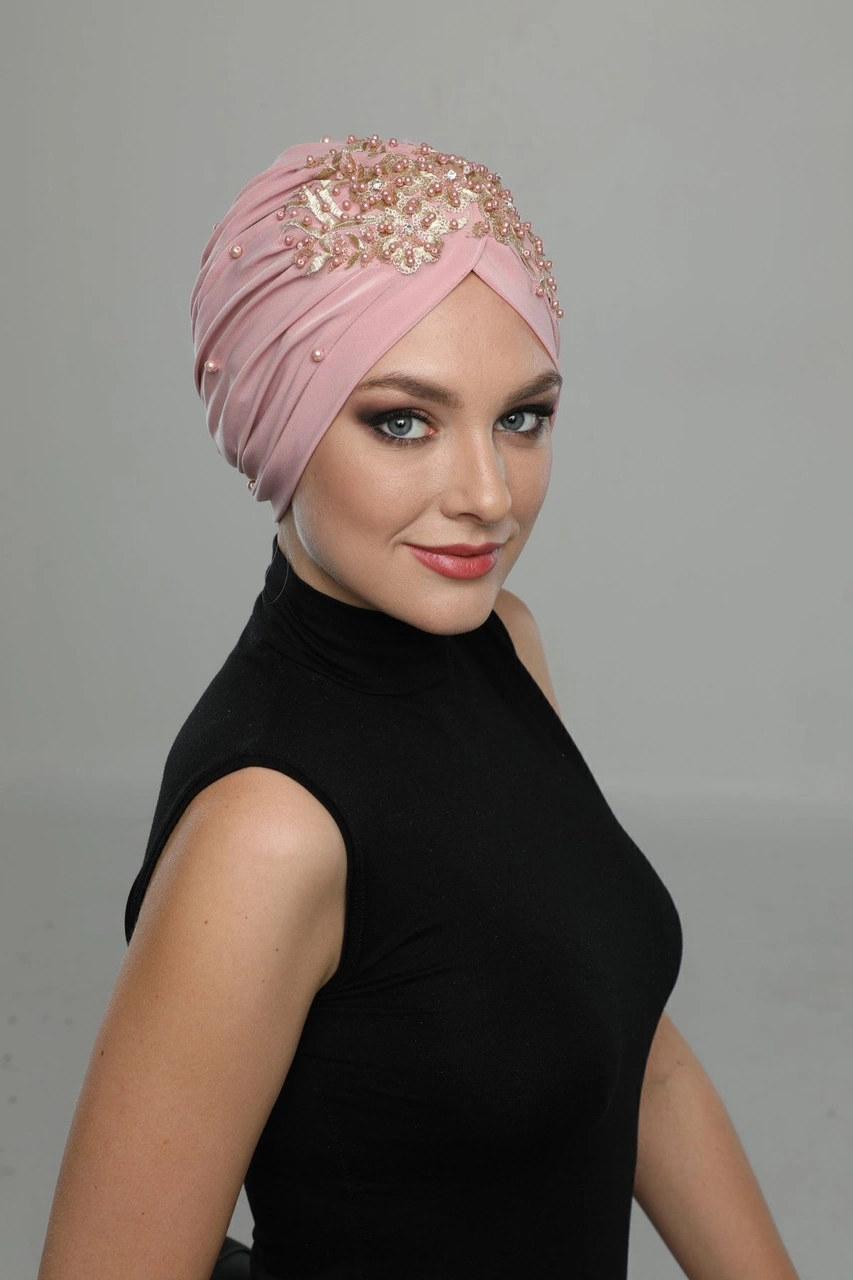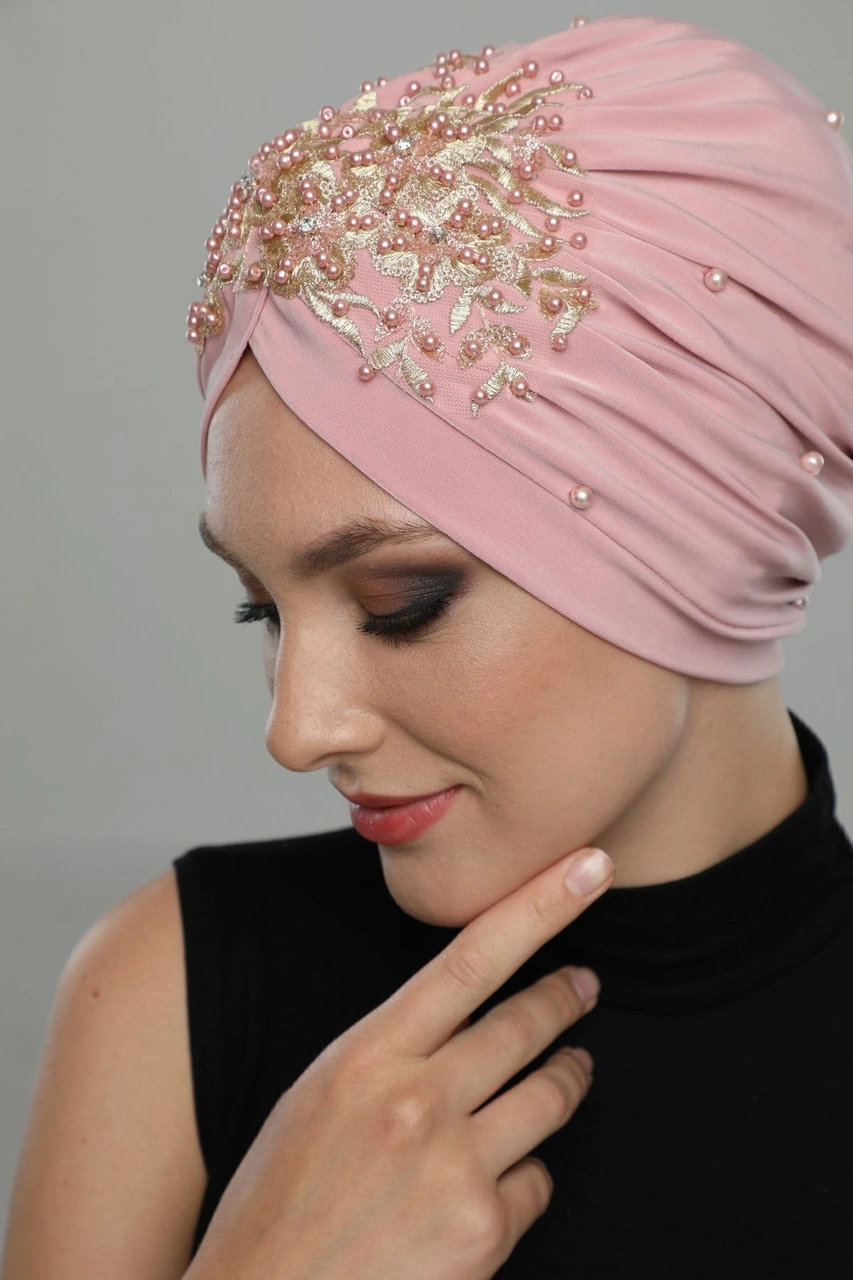 Kopma Astarlı Işlemeli Pudra Sırma Motifli Hazır Türban Tesettür Abiye Bone Pudra Sırma