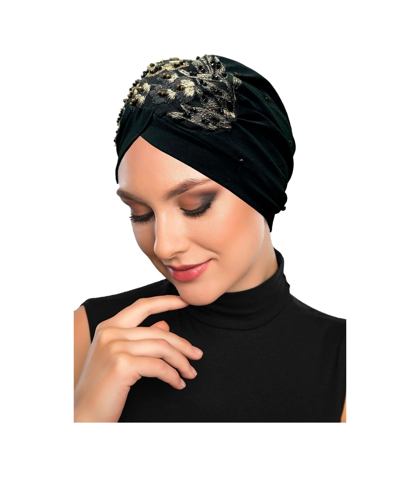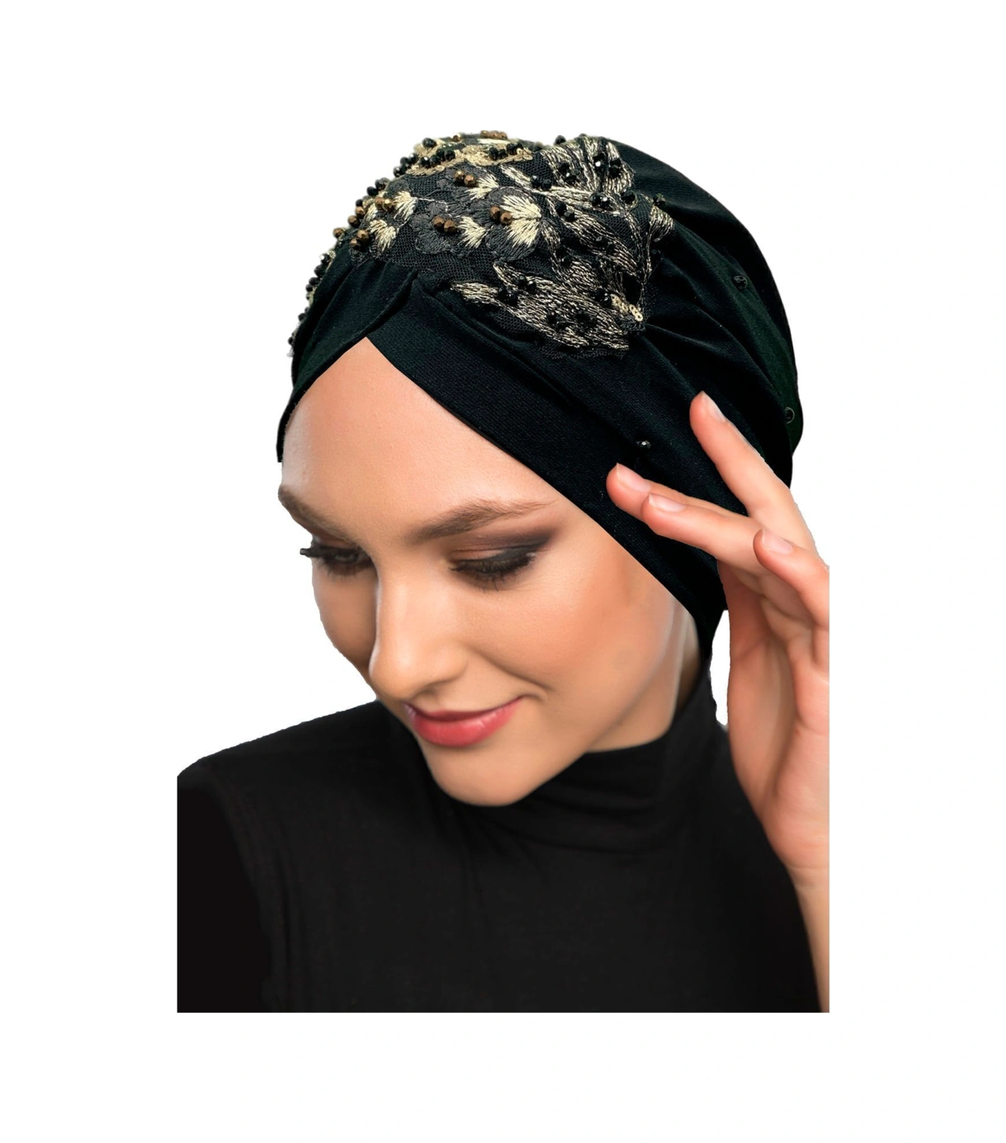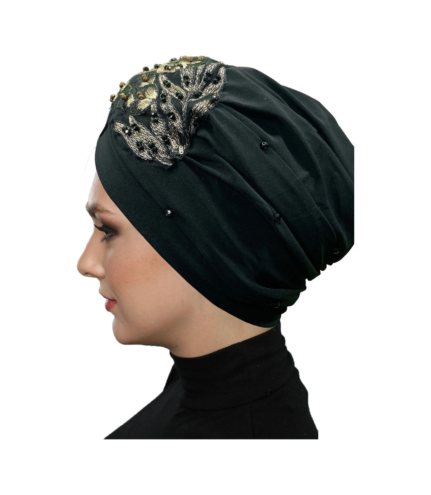 Kopma Astarlı Işlemeli Siyah Sırma Motifli Hazır Türban Tesettür Abiye Bone Siyah Sırma