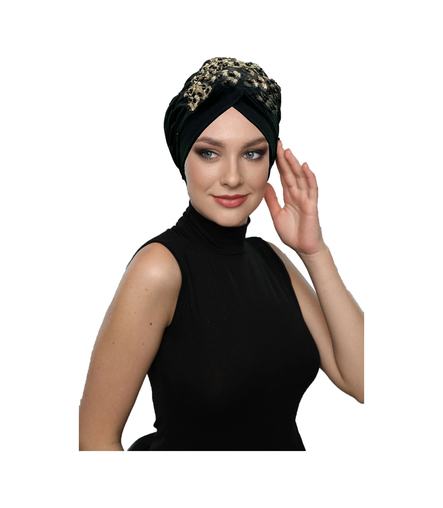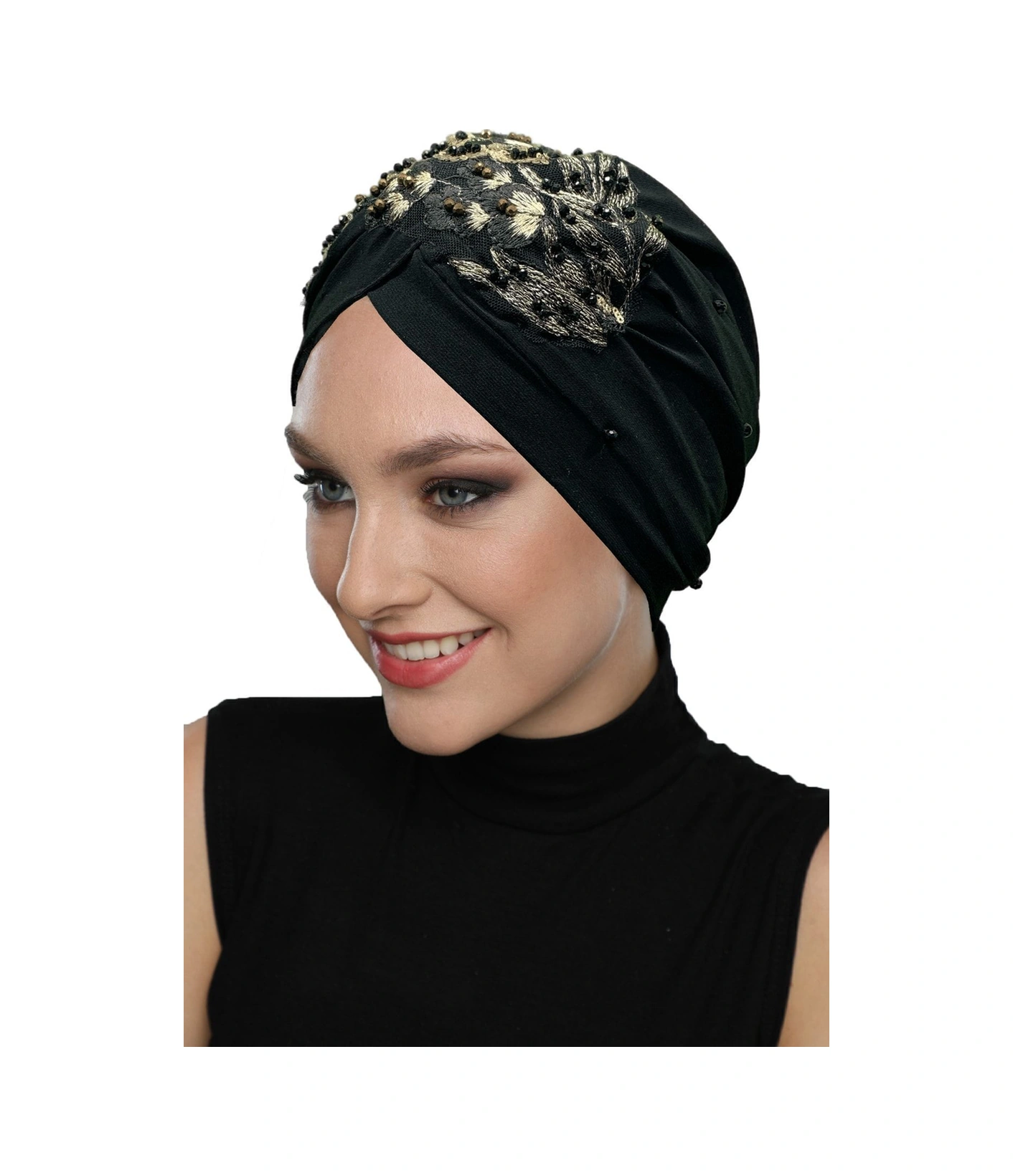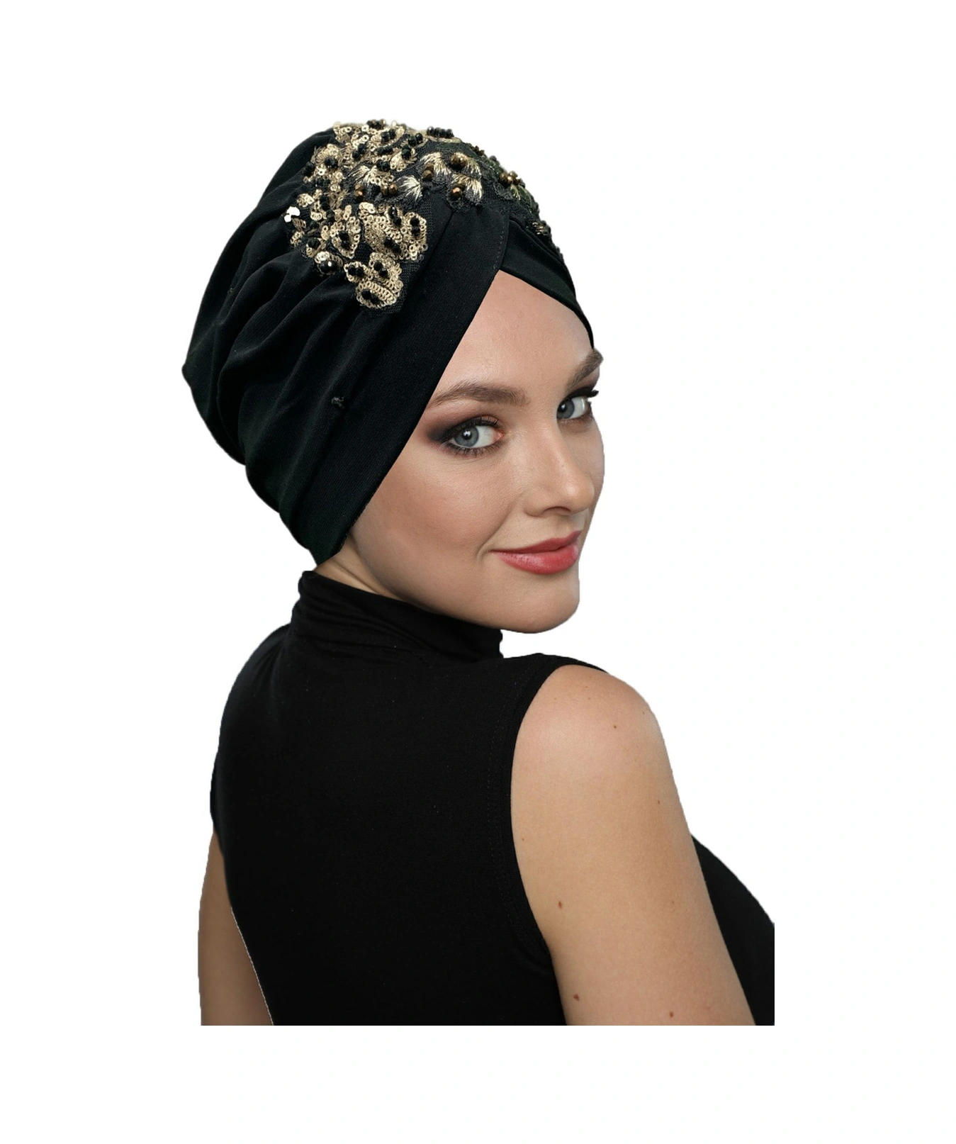 Kopma Astarlı Işlemeli Siyah Sırma Motifli Hazır Türban Tesettür Abiye Bone Siyah Sırma