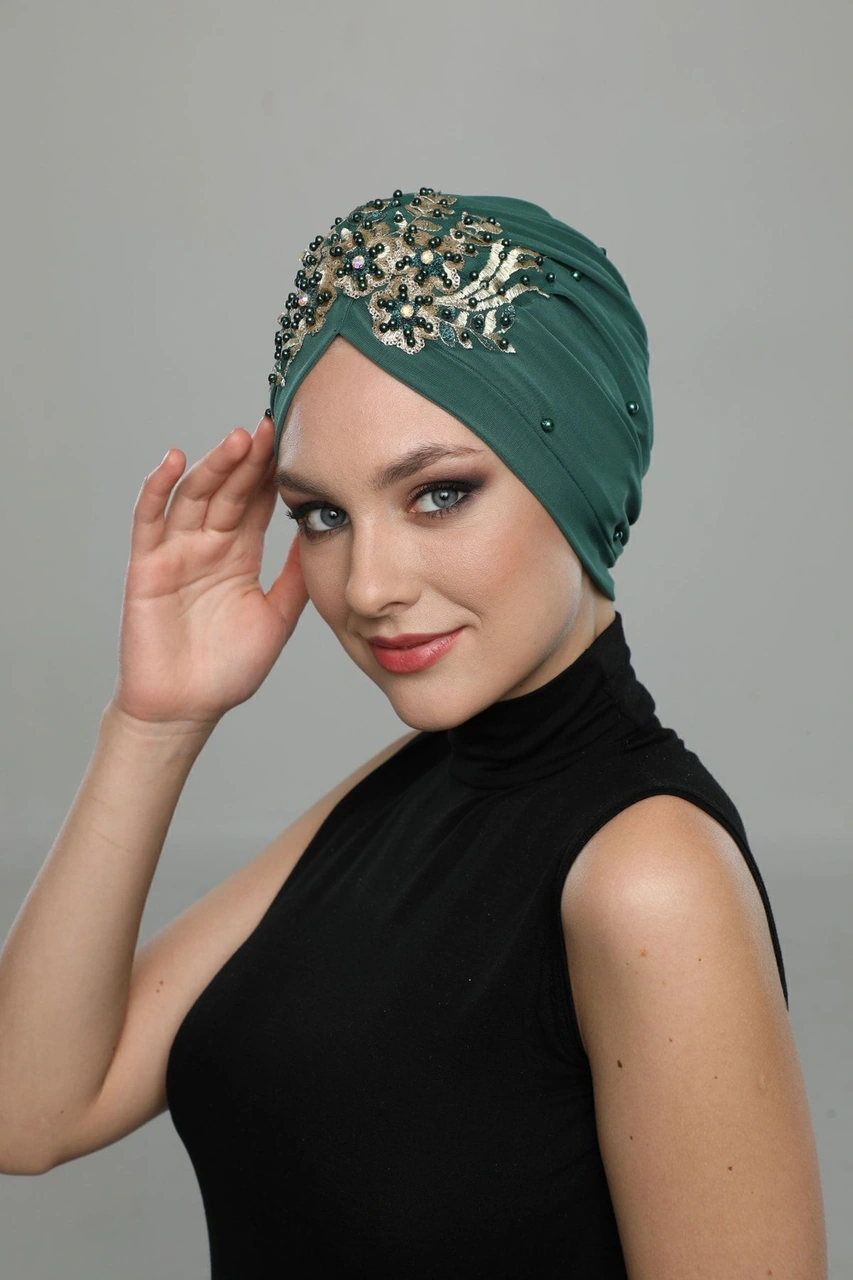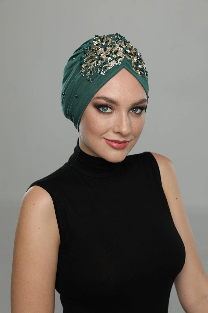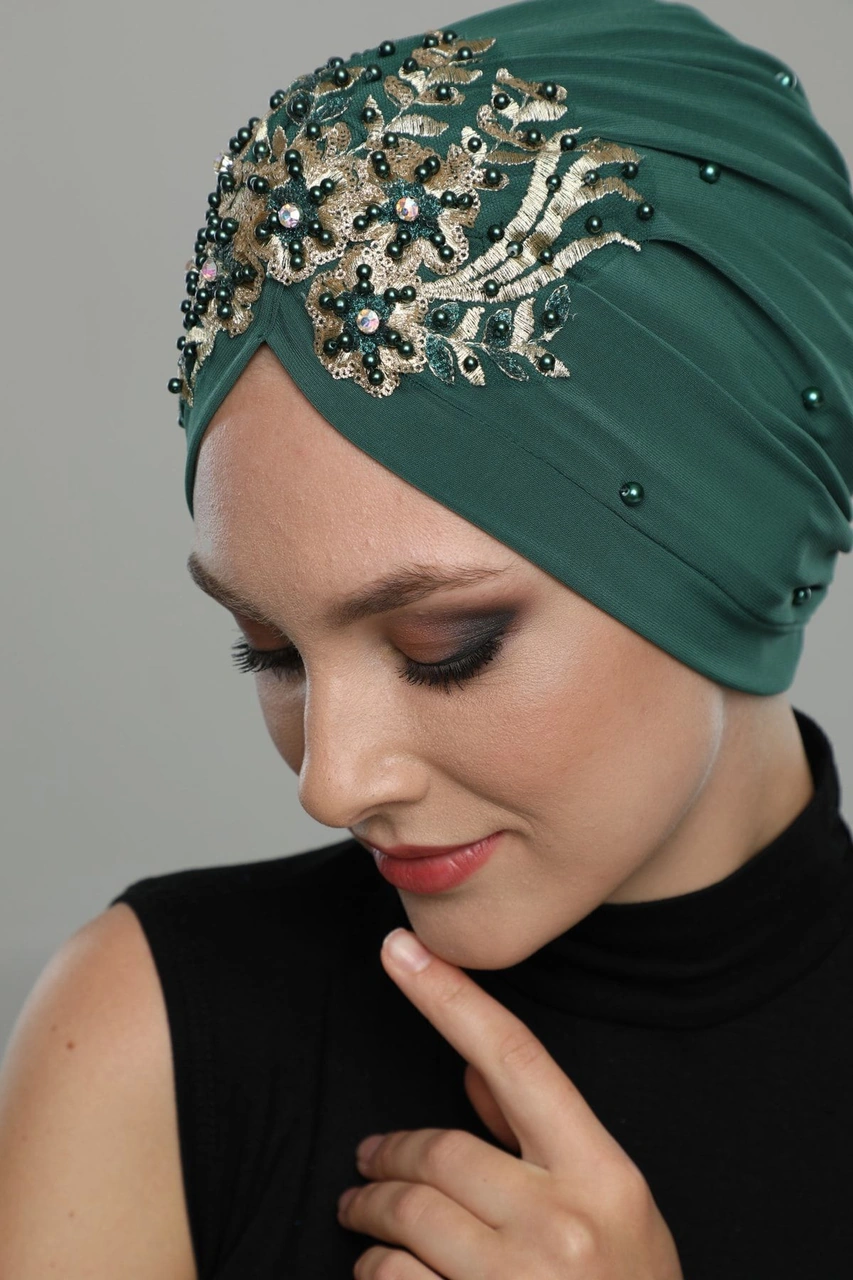 Kopma Astarlı Işlemeli Yeşil Sırma Motifli Hazır Türban Tesettür Abiye Bone Yeşil Sırma
