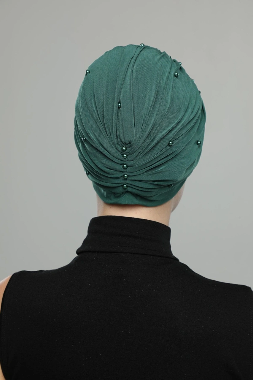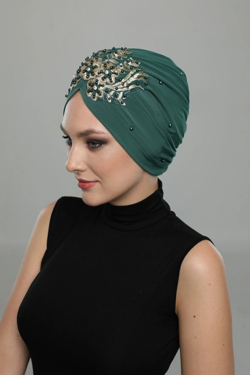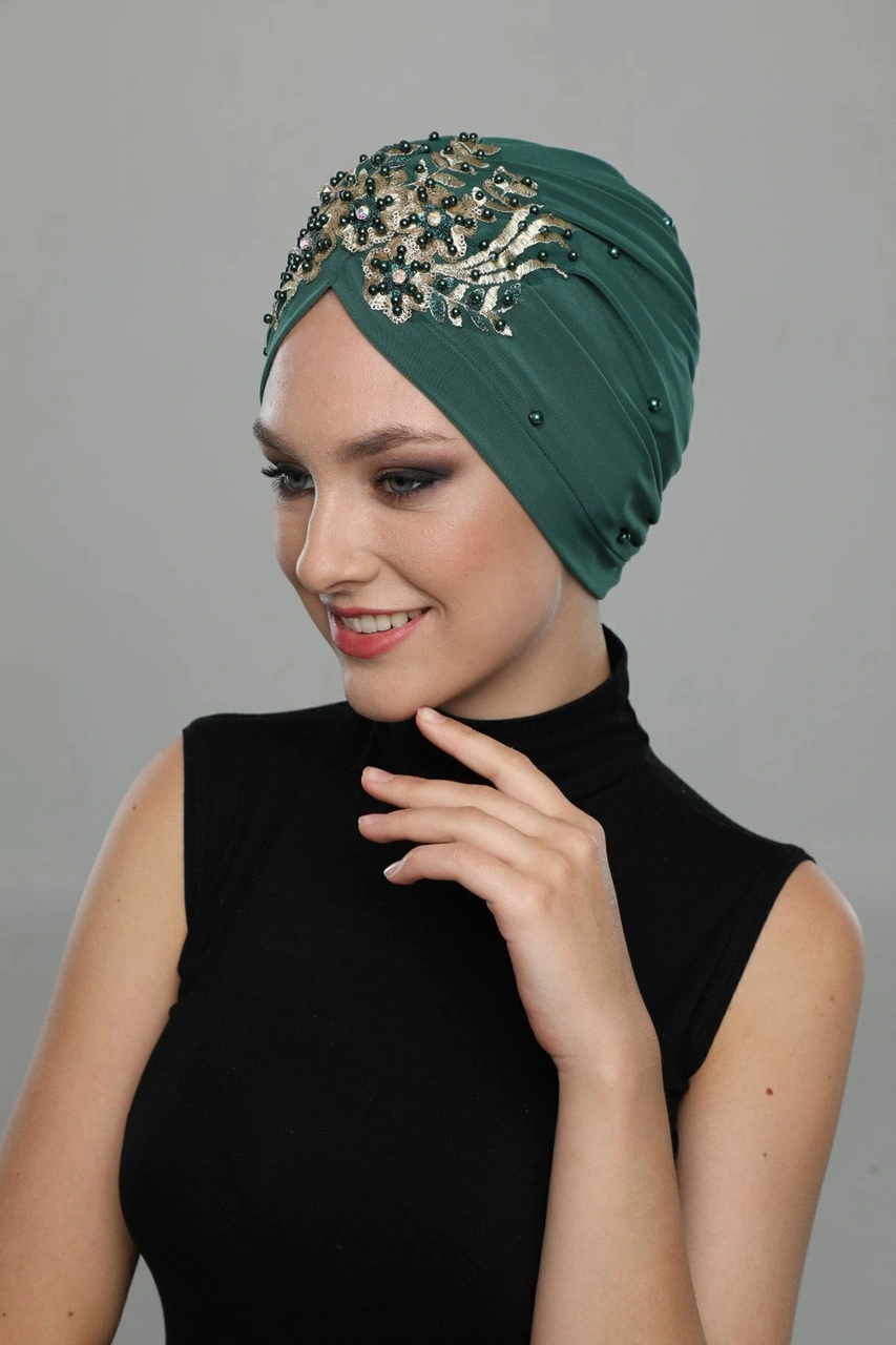 Kopma Astarlı Işlemeli Yeşil Sırma Motifli Hazır Türban Tesettür Abiye Bone Yeşil Sırma