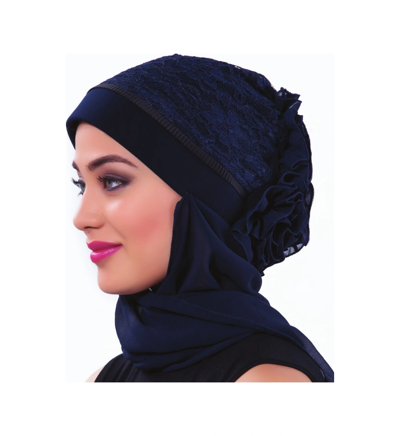 Kordoneli Atkılı Arkası Fırfırlı Önü Plise Biyeli Lacivert Hazır Türban Tesettür Bone Lacivert