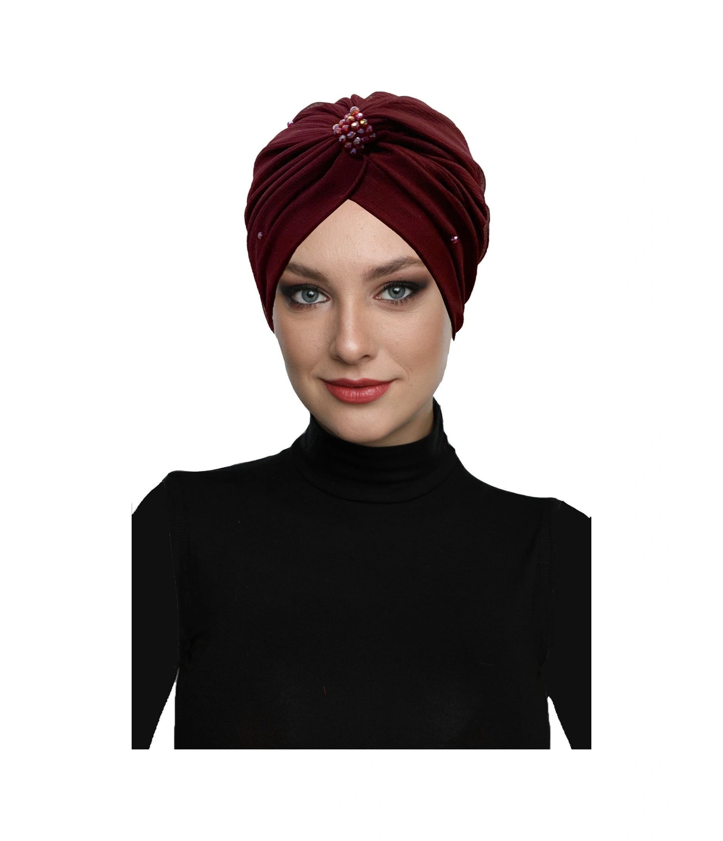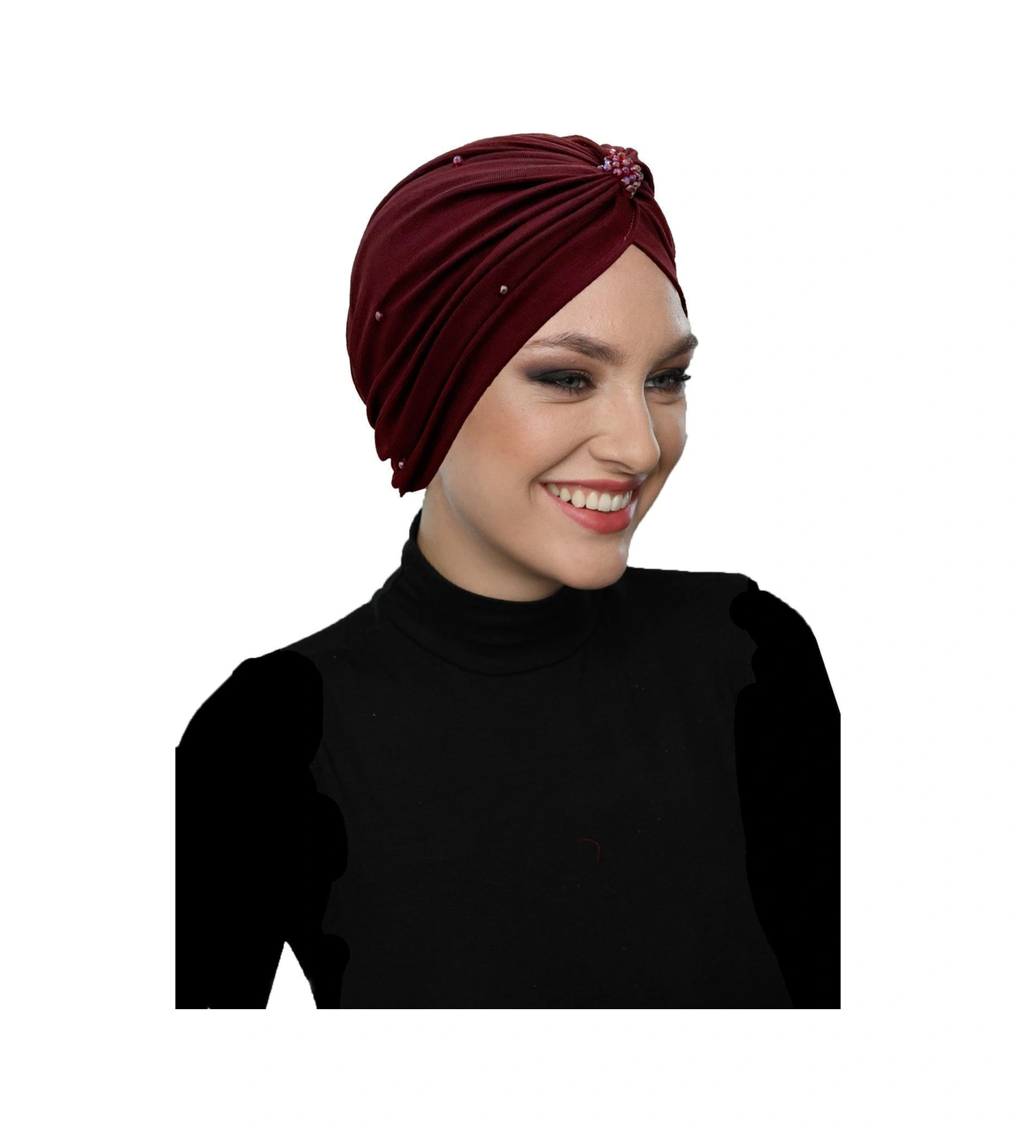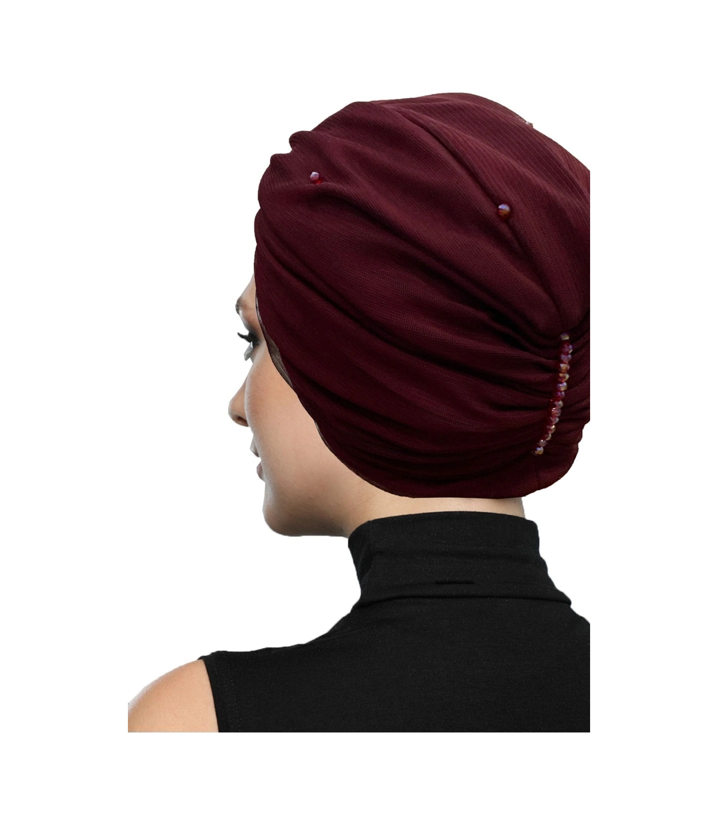 Kristal Tüllü Astarlı Bordo Hazır Türban Tesettür Abiye Bone Bordo