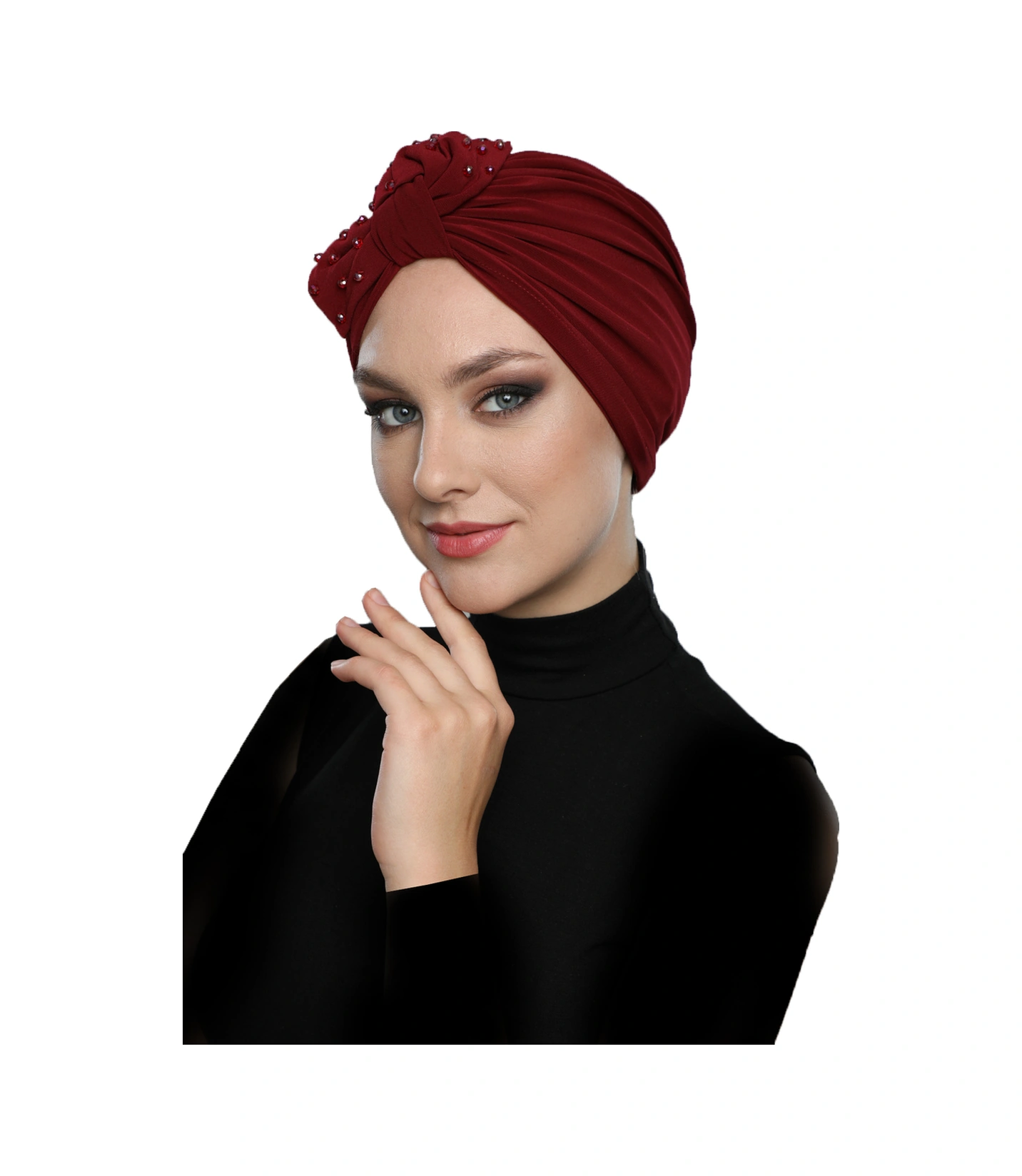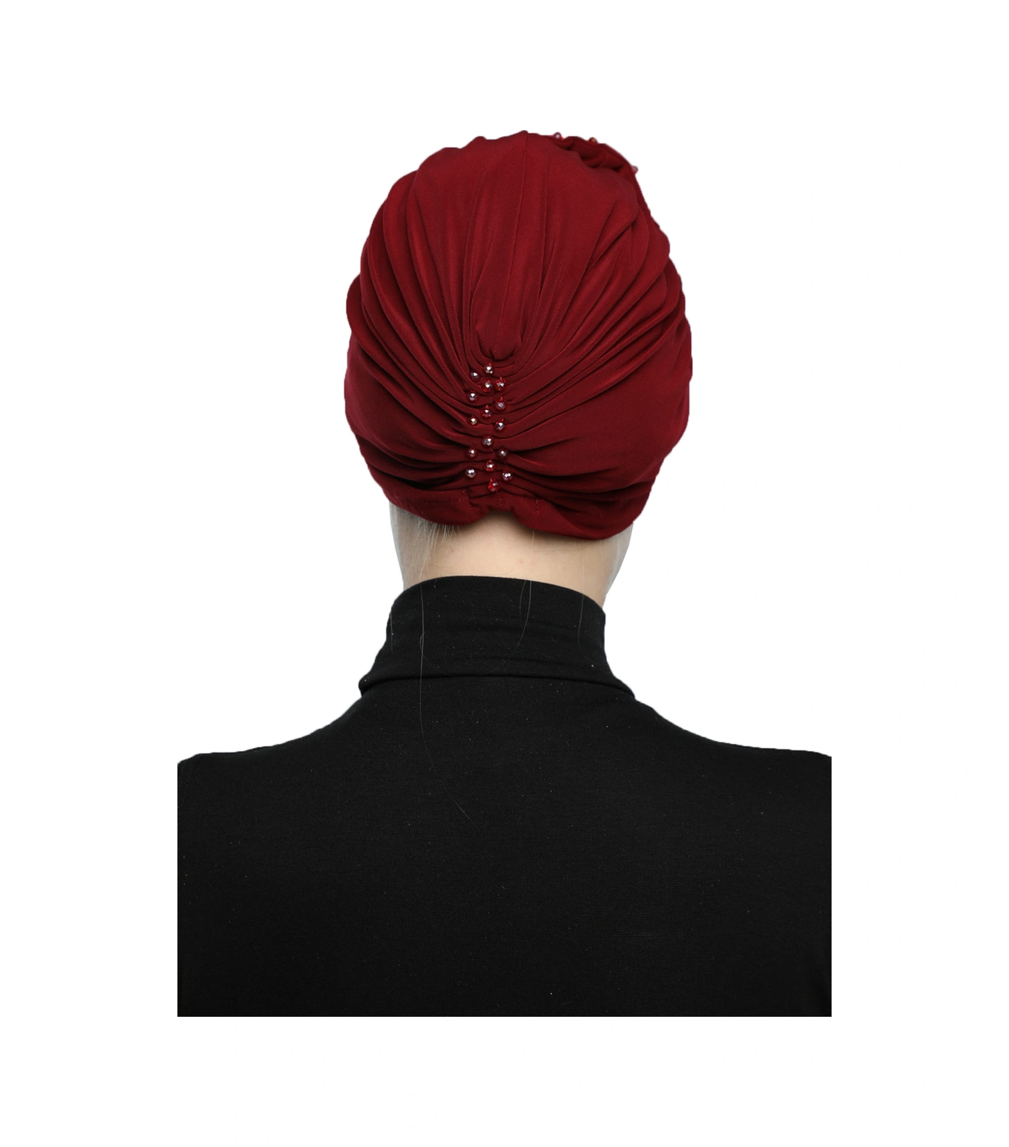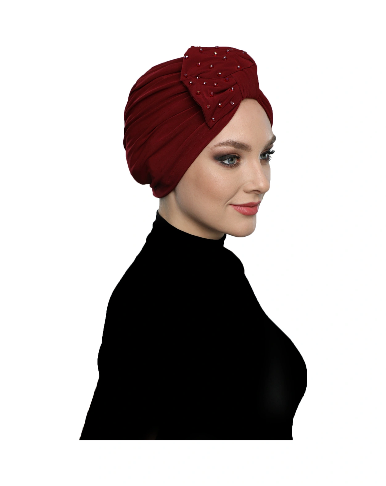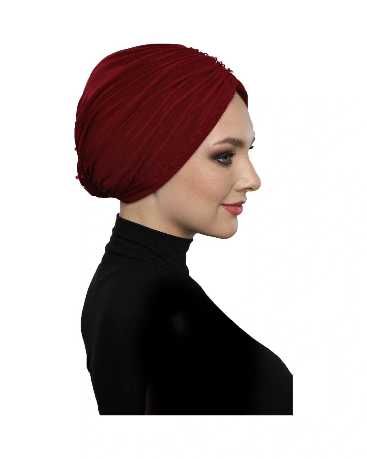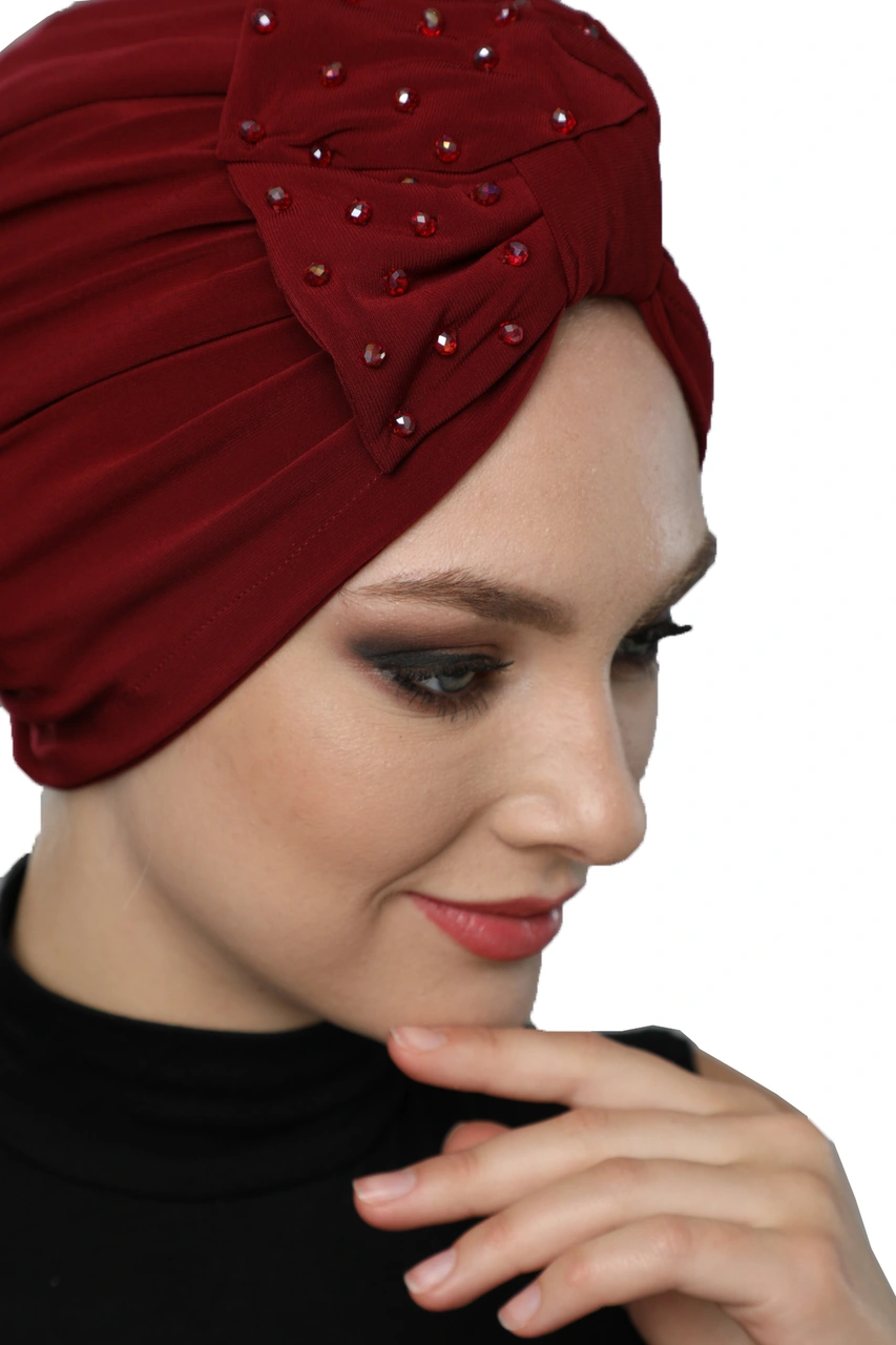 Kristal Yelpaze Taş Işlemeli Çift Taraflı Astarlı Bordo Hazır Türban Tesettür Abiye Bone Bordo