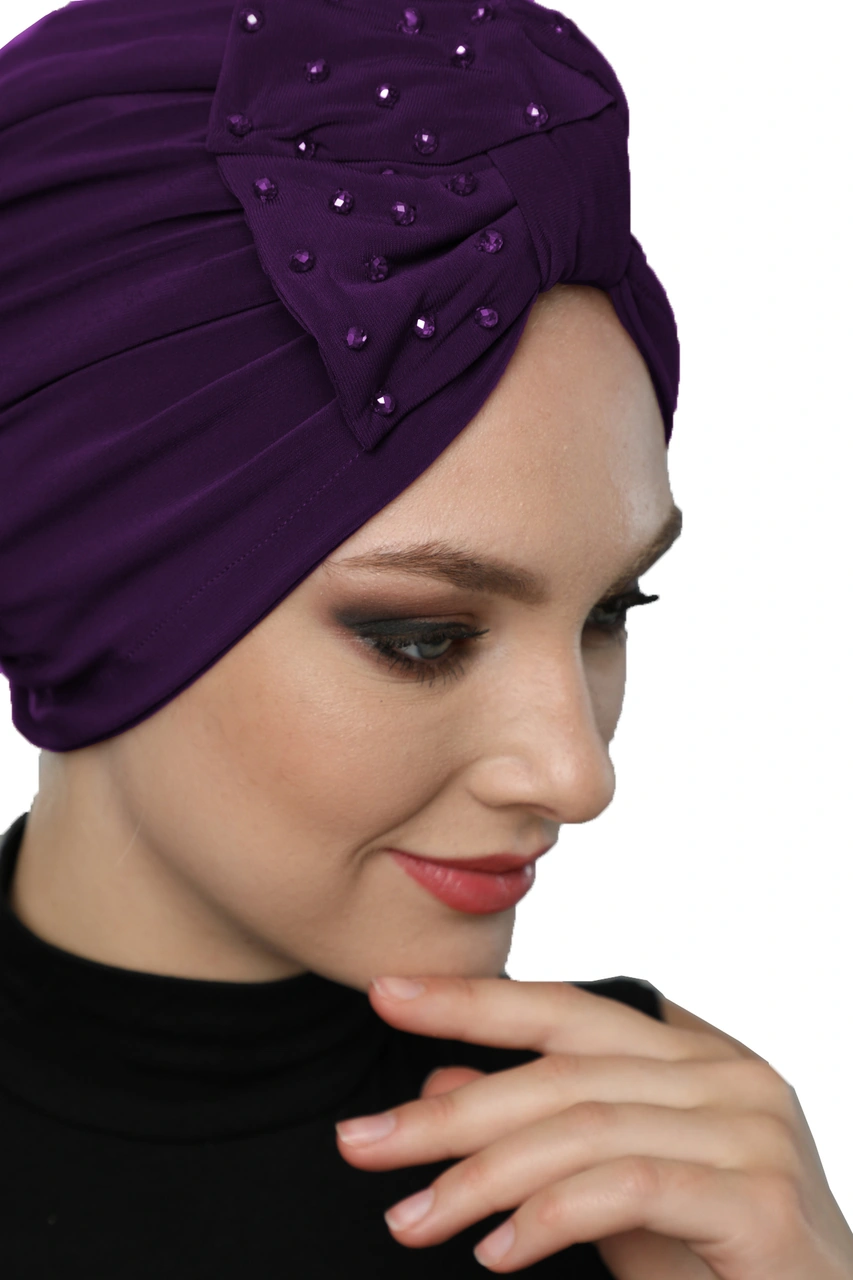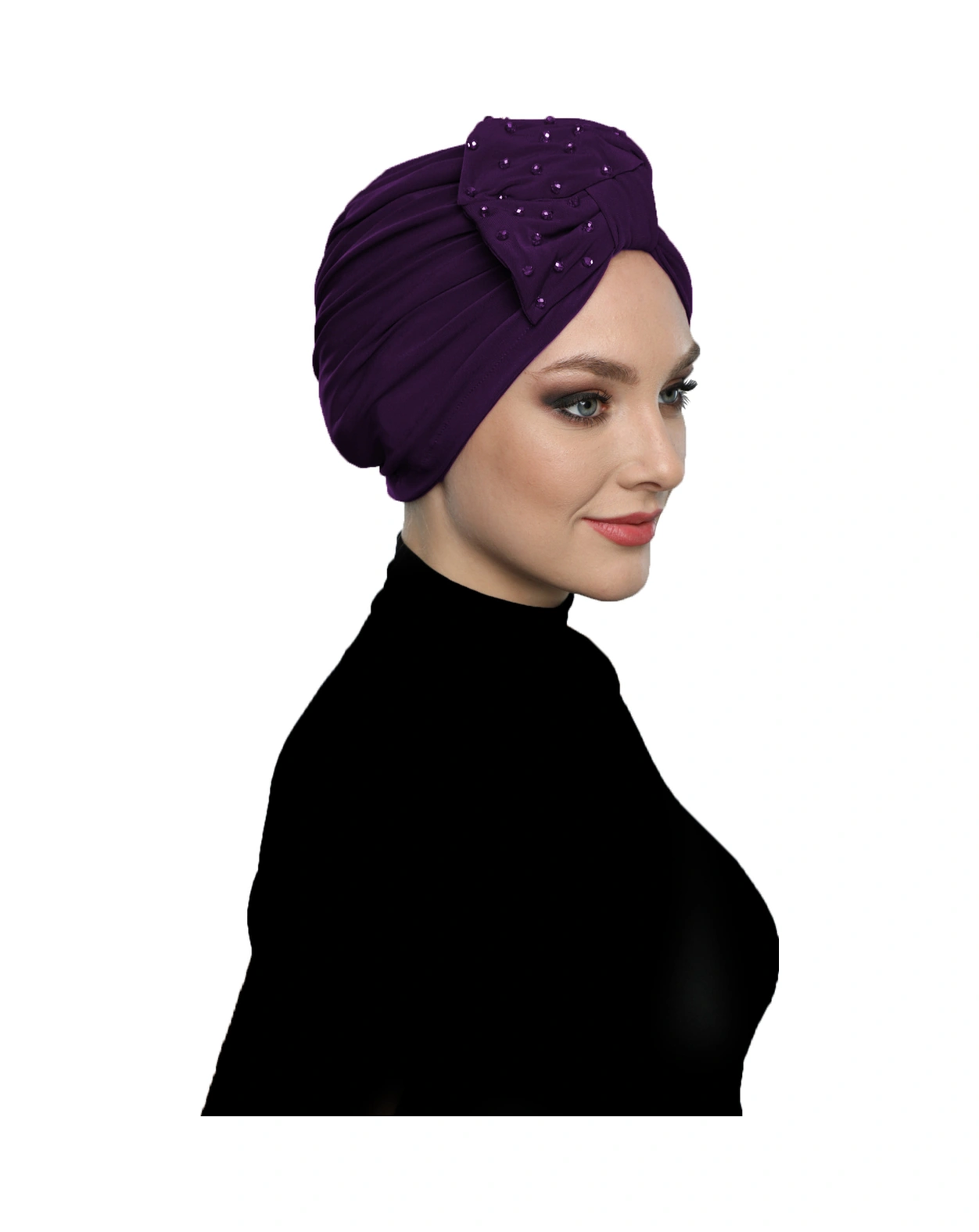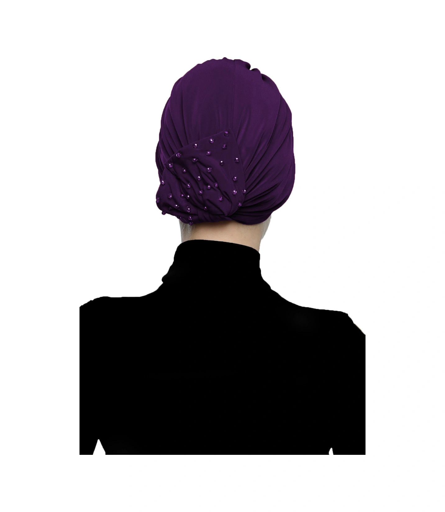 Kristal Yelpaze Taş Işlemeli Çift Taraflı Astarlı Mor Hazır Türban Tesettür Abiye Bone Mor