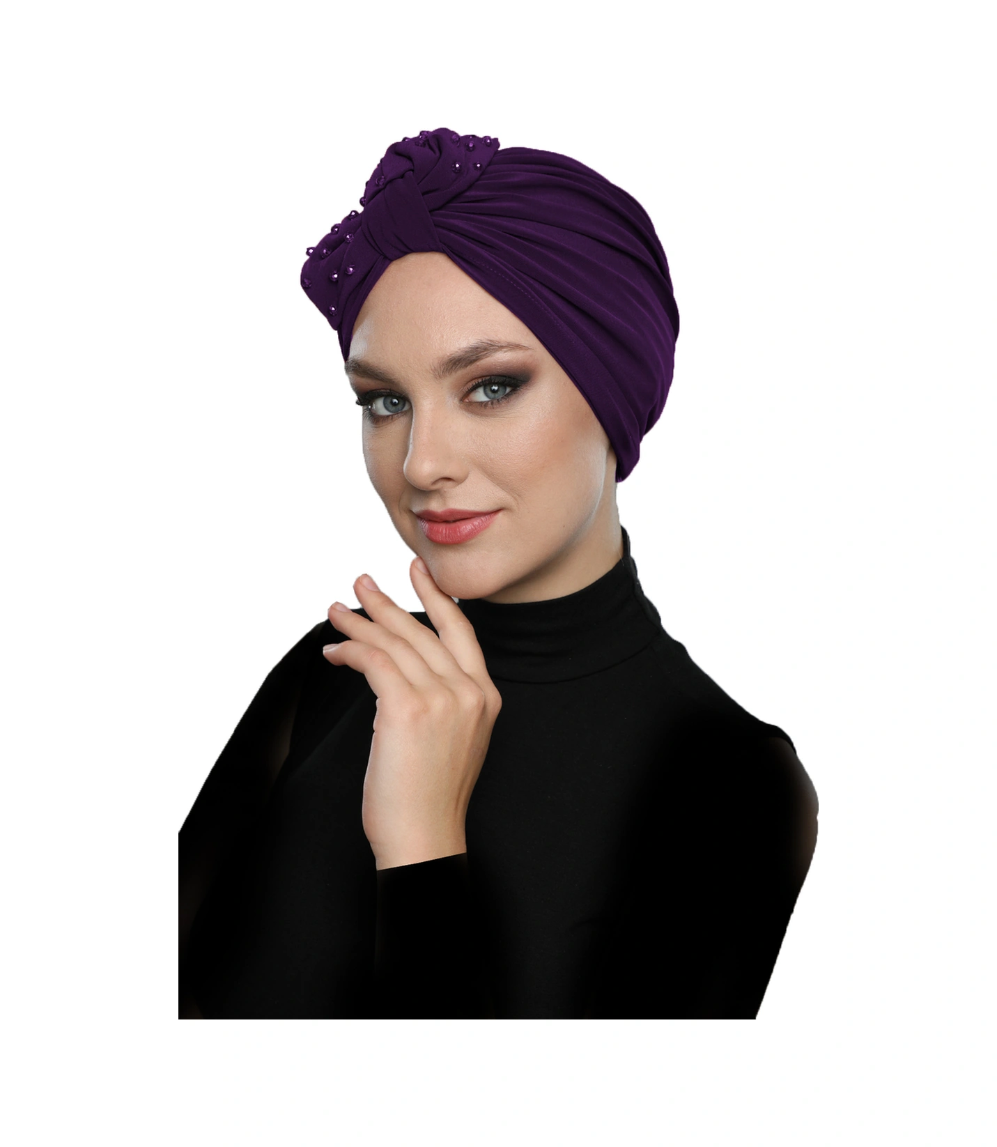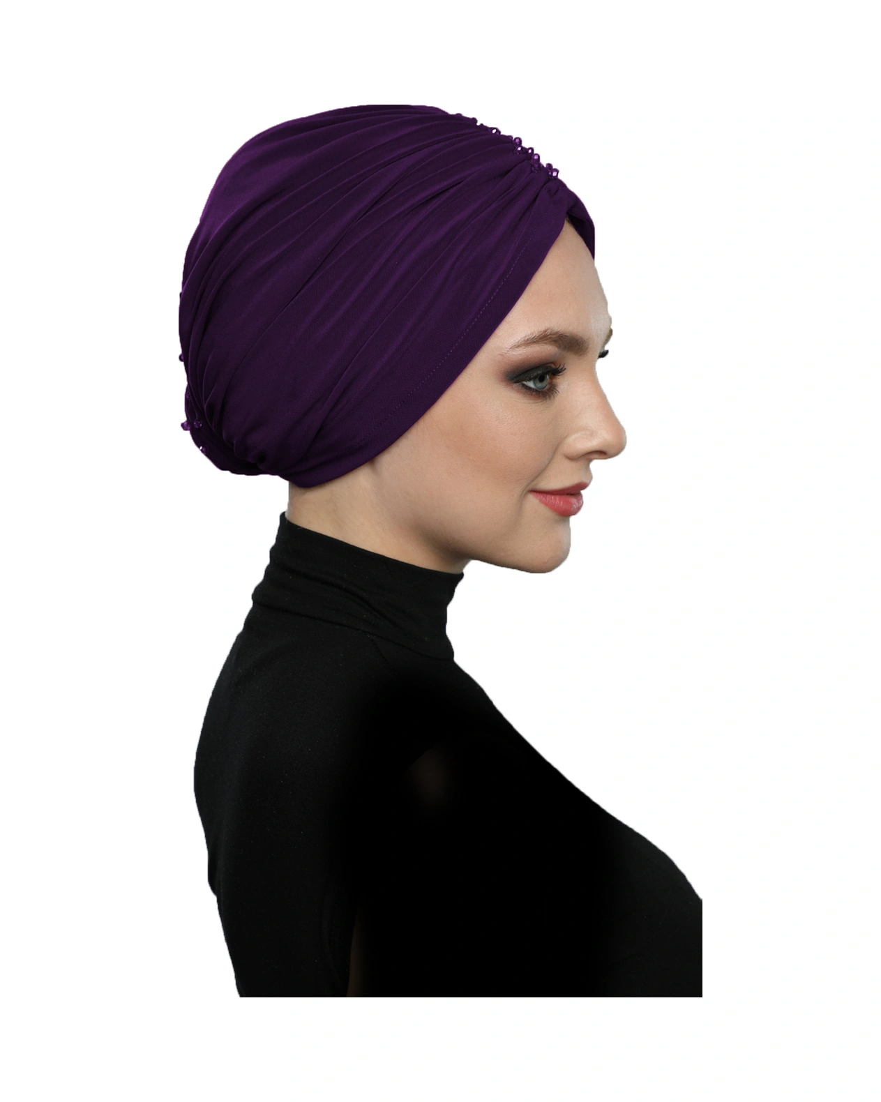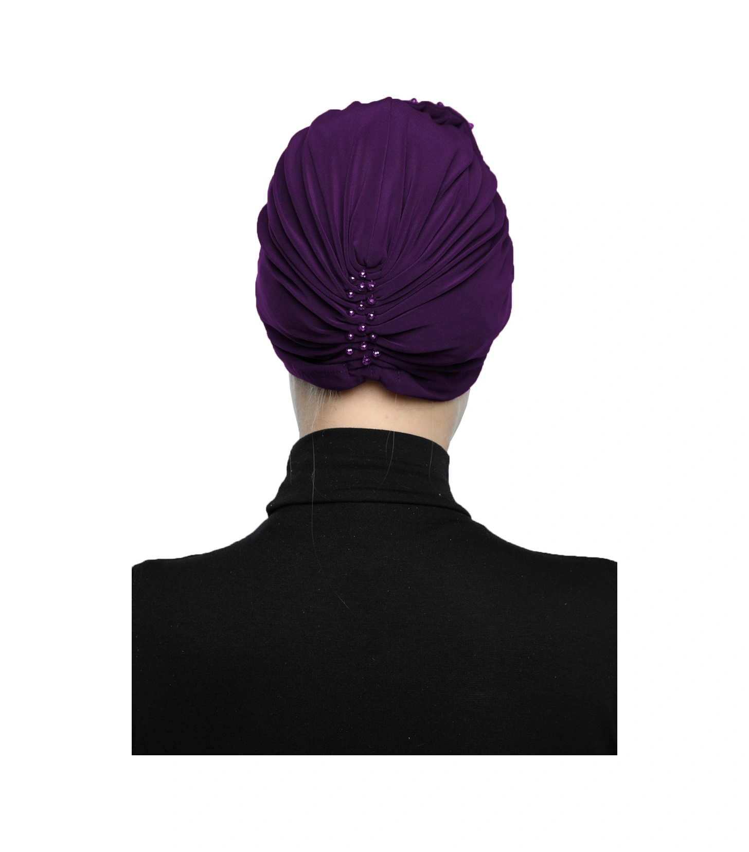 Kristal Yelpaze Taş Işlemeli Çift Taraflı Astarlı Mor Hazır Türban Tesettür Abiye Bone Mor
