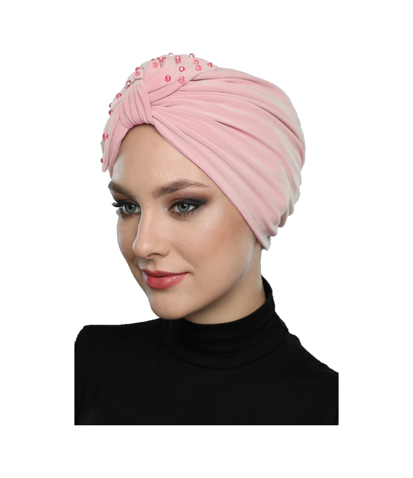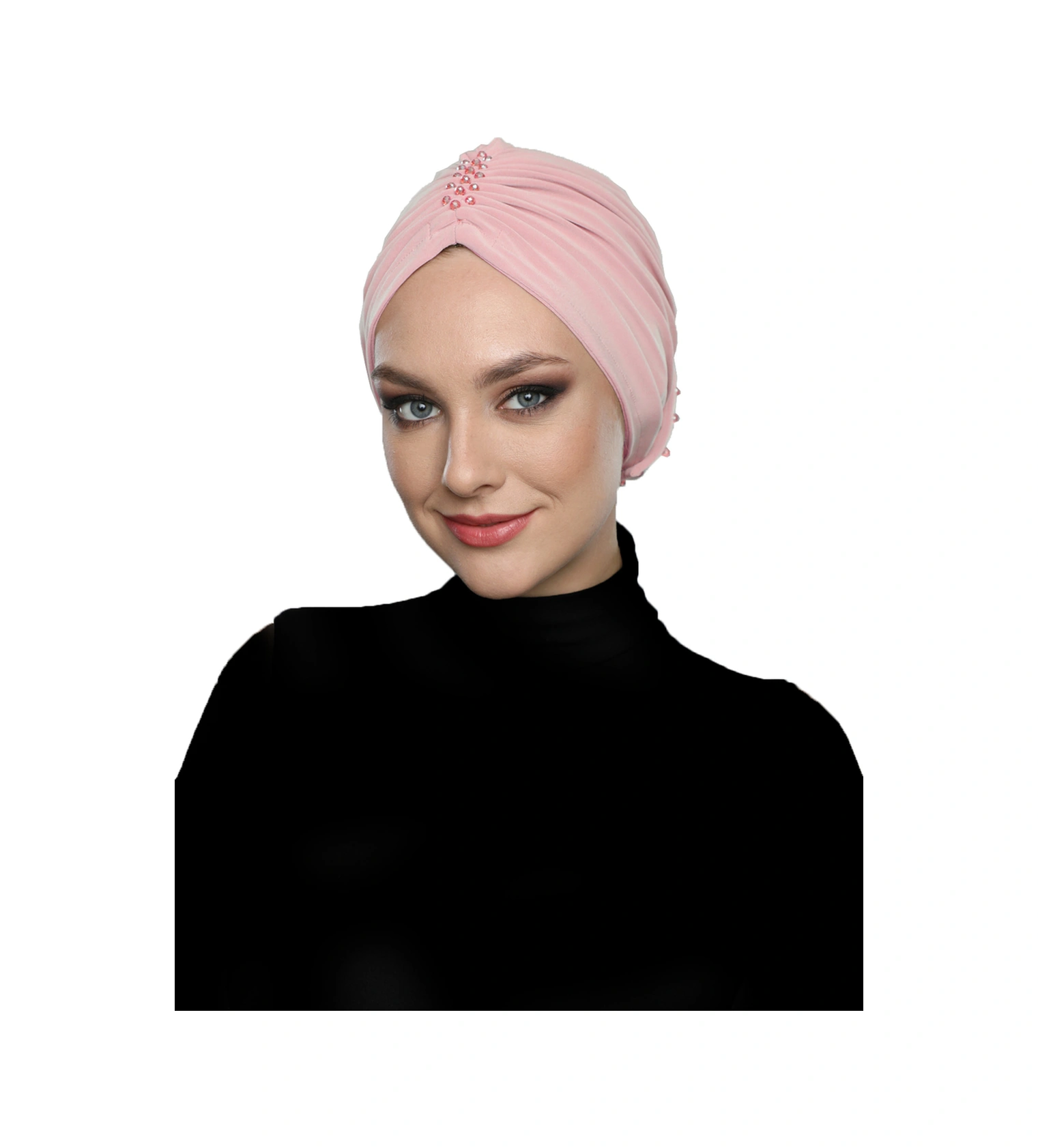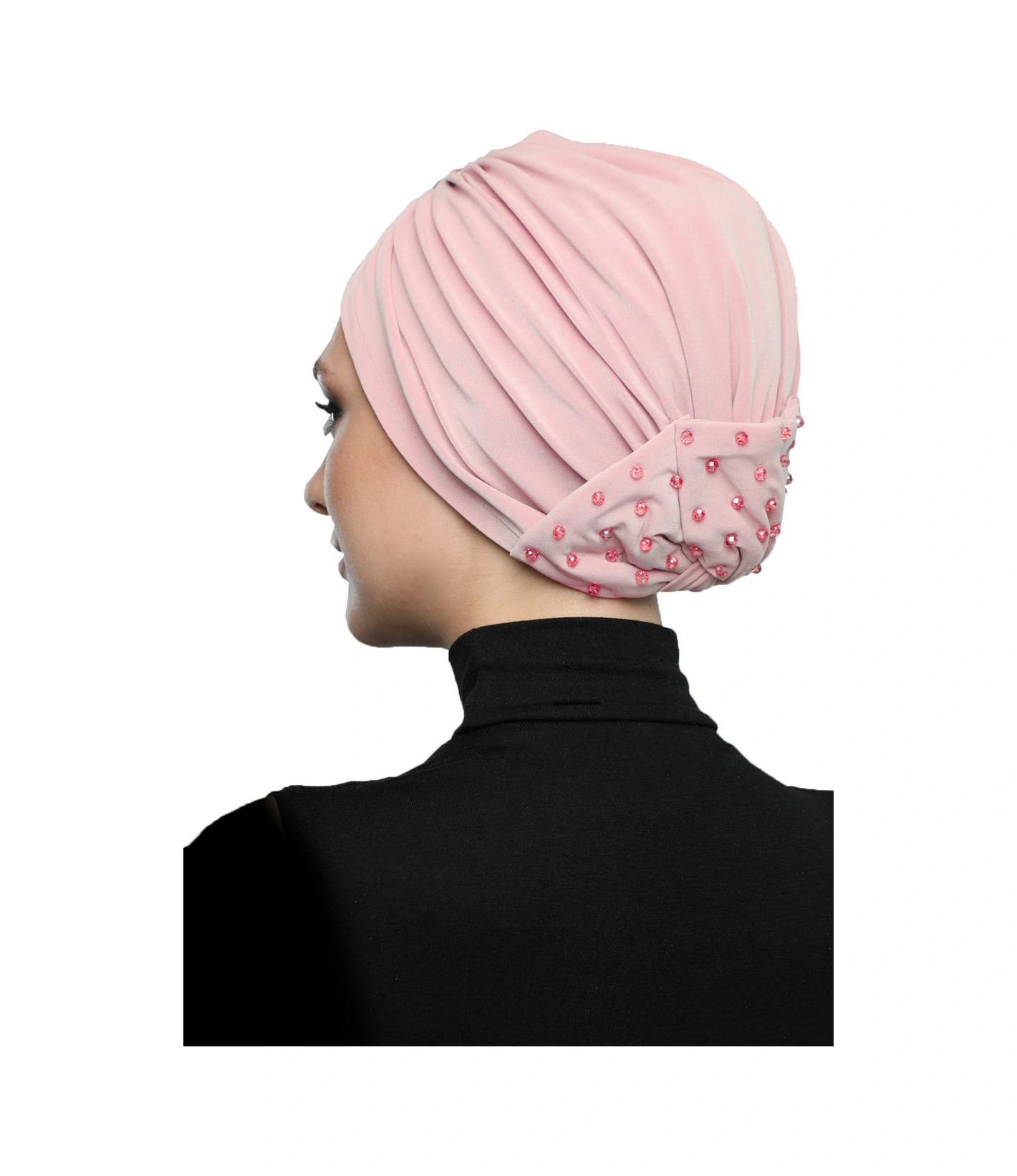 Kristal Yelpaze Taş Işlemeli Çift Taraflı Astarlı Pudra Hazır Türban Tesettür Abiye Bone Pudra
