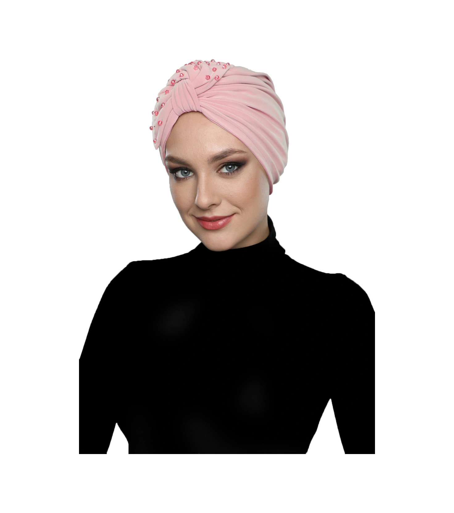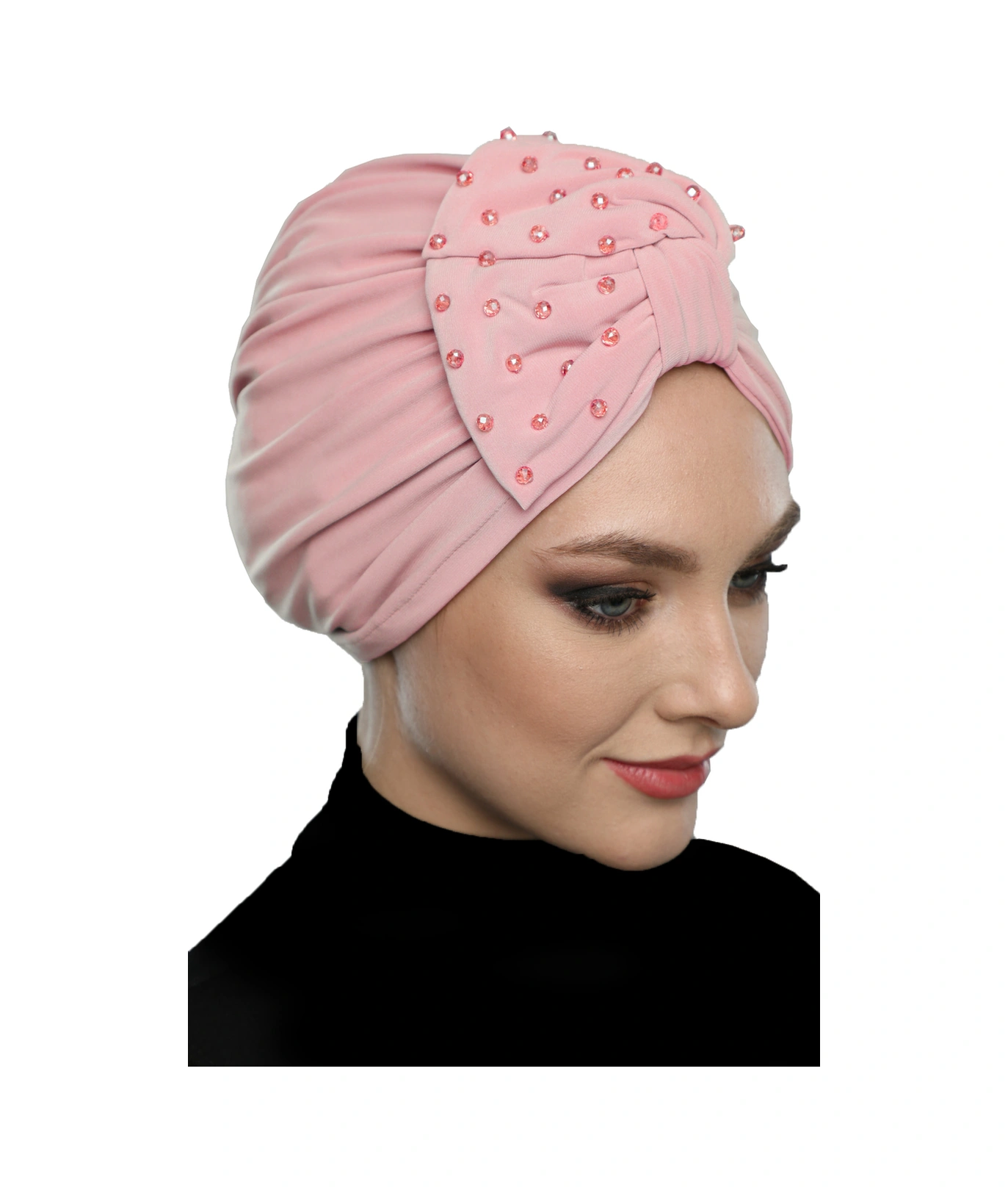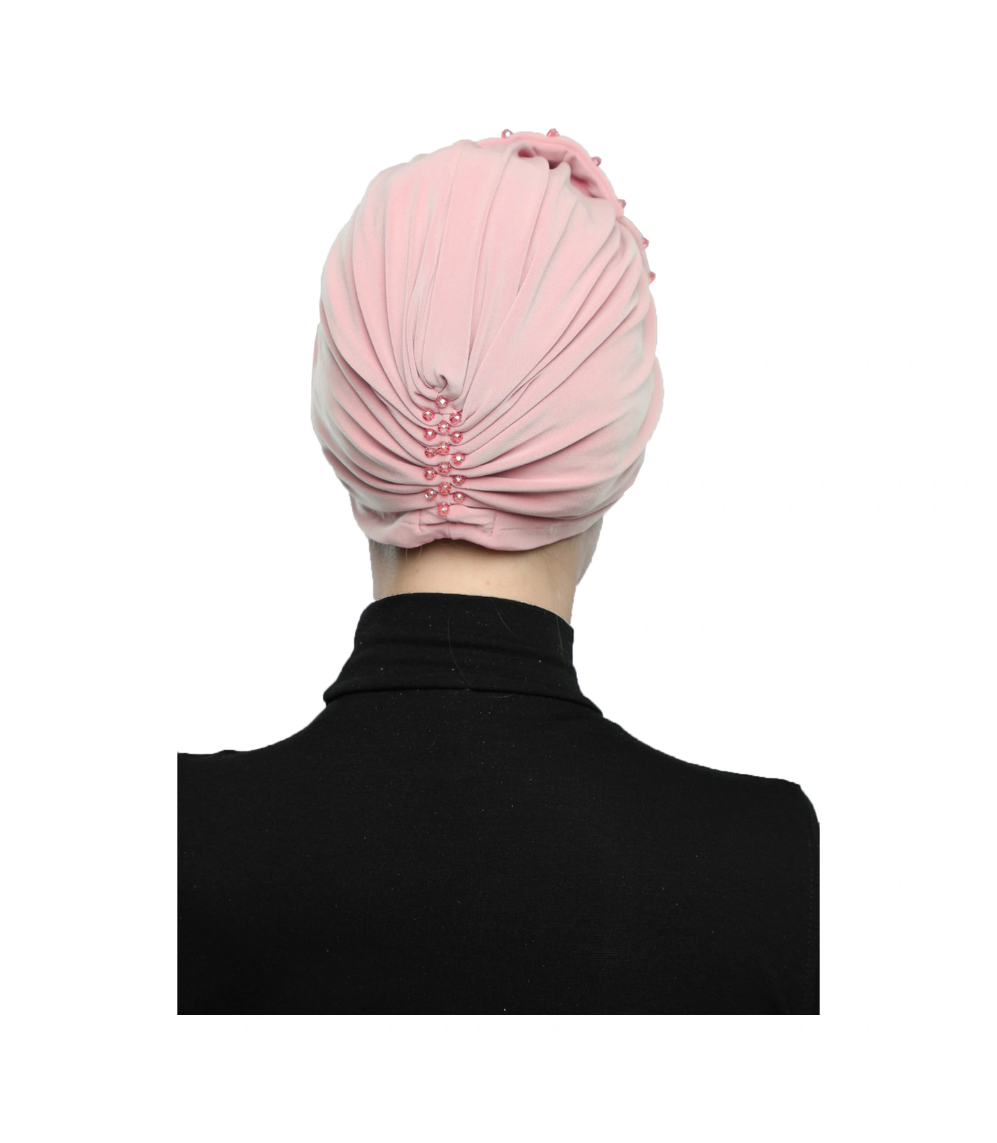 Kristal Yelpaze Taş Işlemeli Çift Taraflı Astarlı Pudra Hazır Türban Tesettür Abiye Bone Pudra