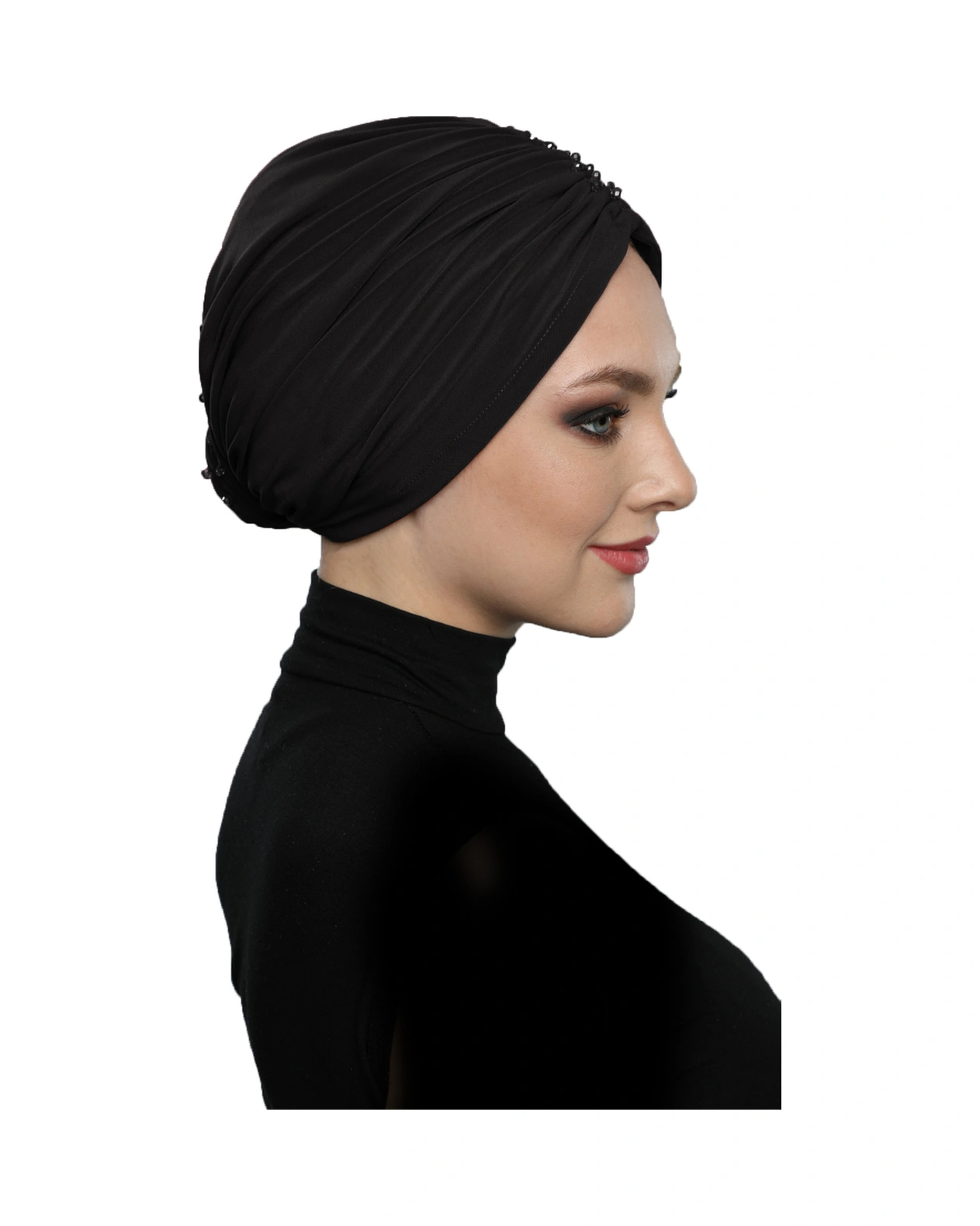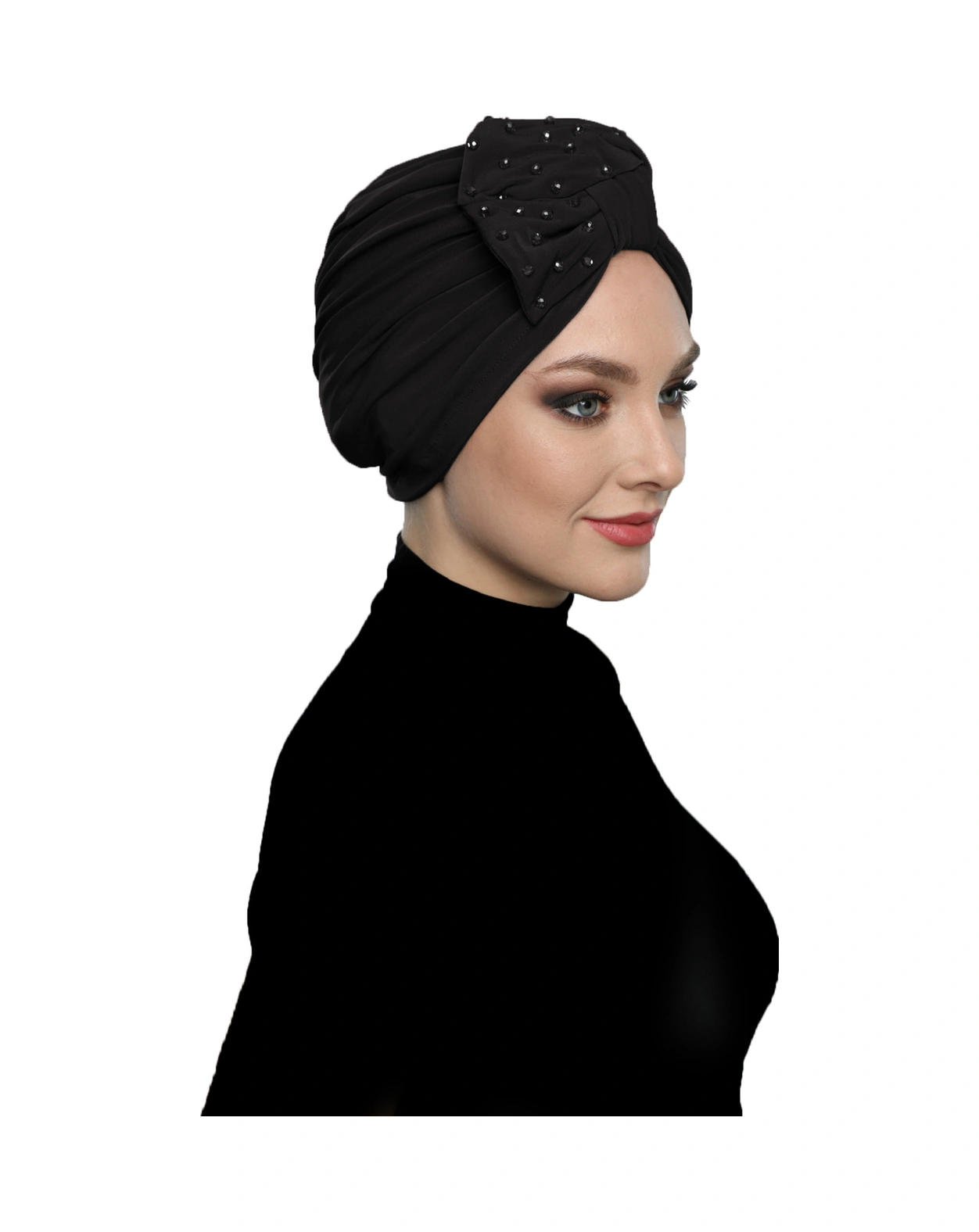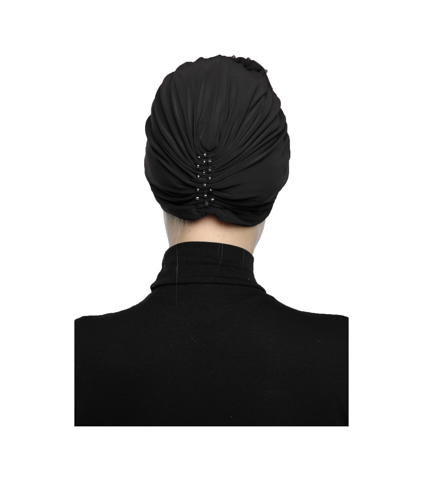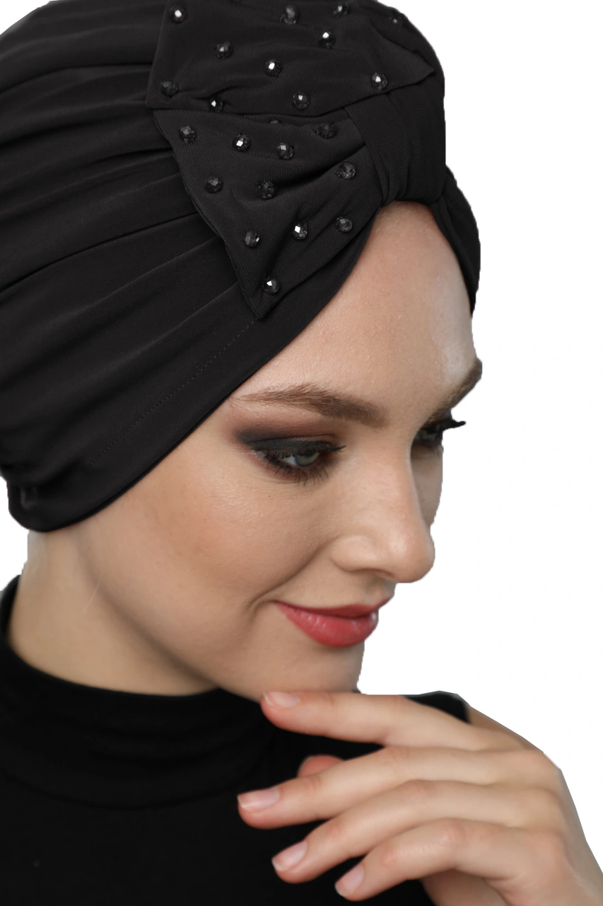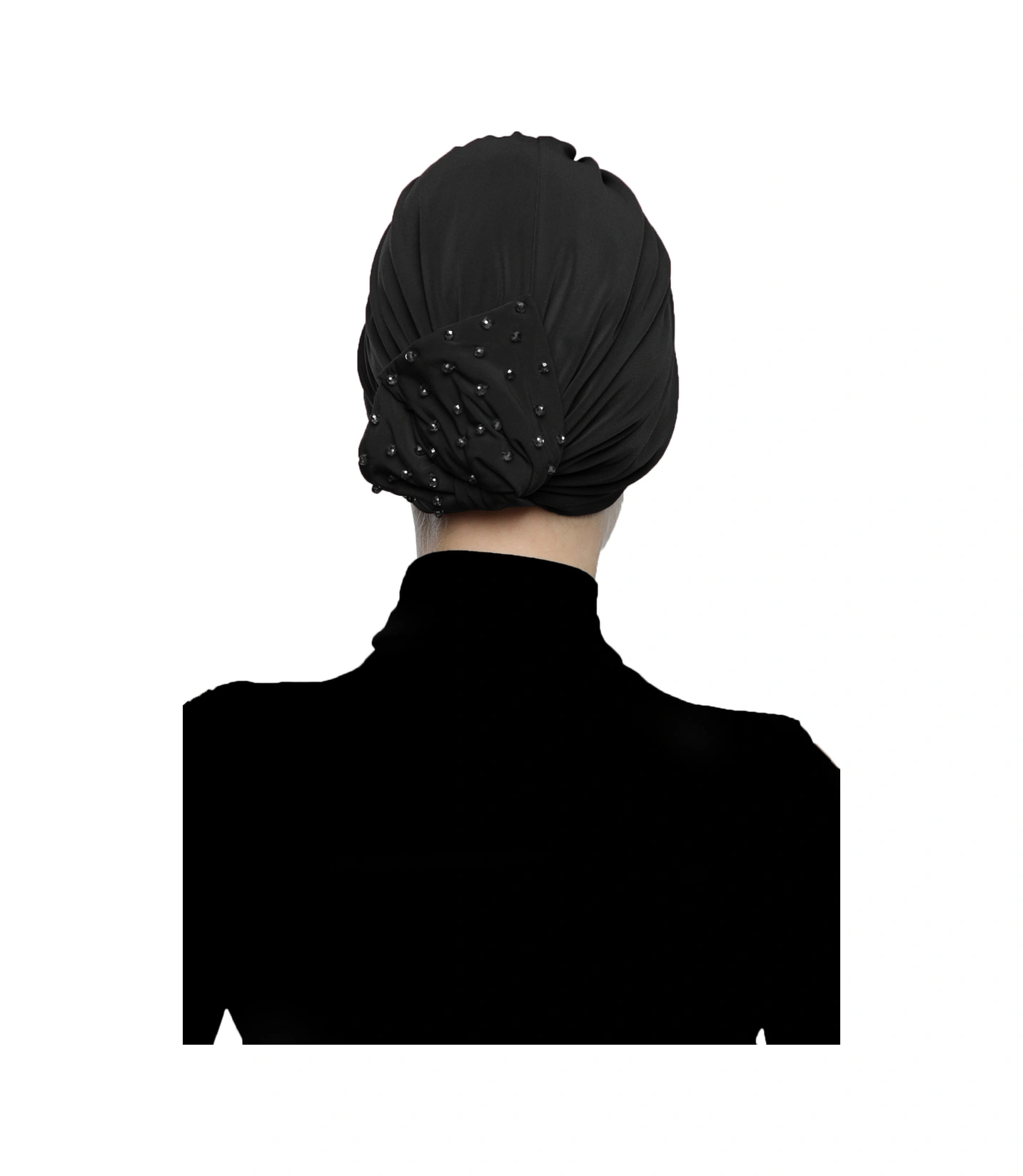 Kristal Yelpaze Taş Işlemeli Çift Taraflı Astarlı Siyah Hazır Türban Tesettür Abiye Bone Siyah