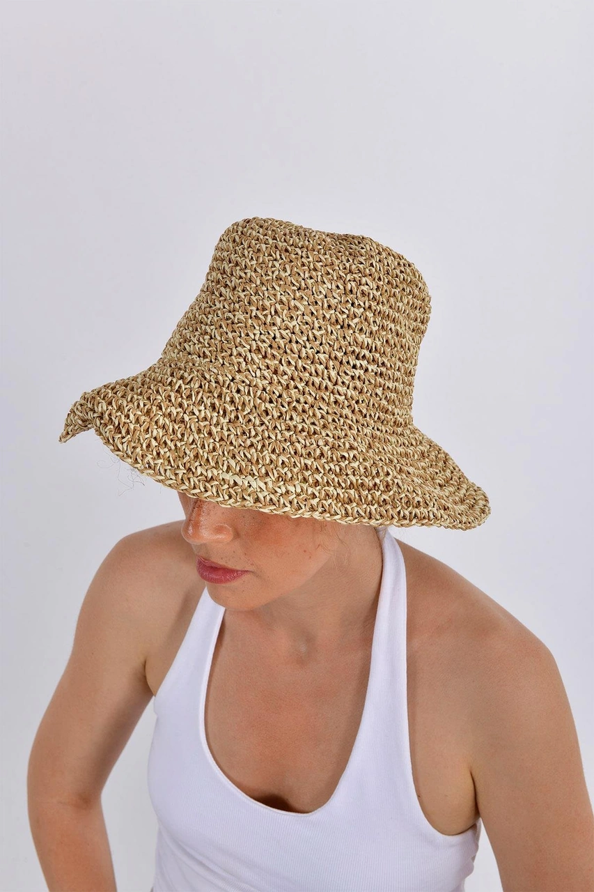 Kumtaşı Tonlu Dokuma Rafya Şapka Çok Renkli