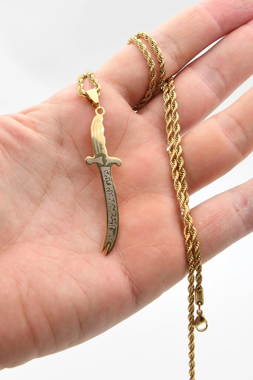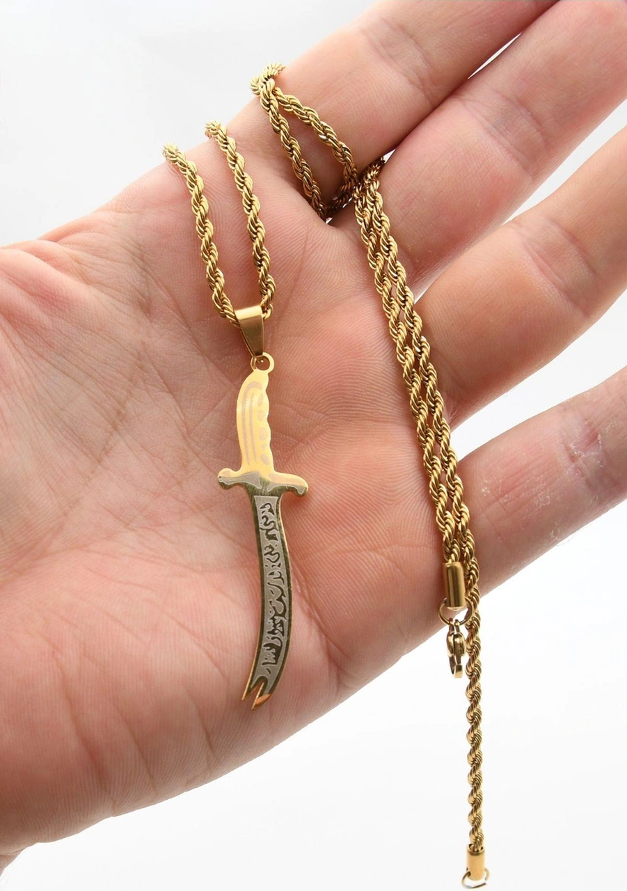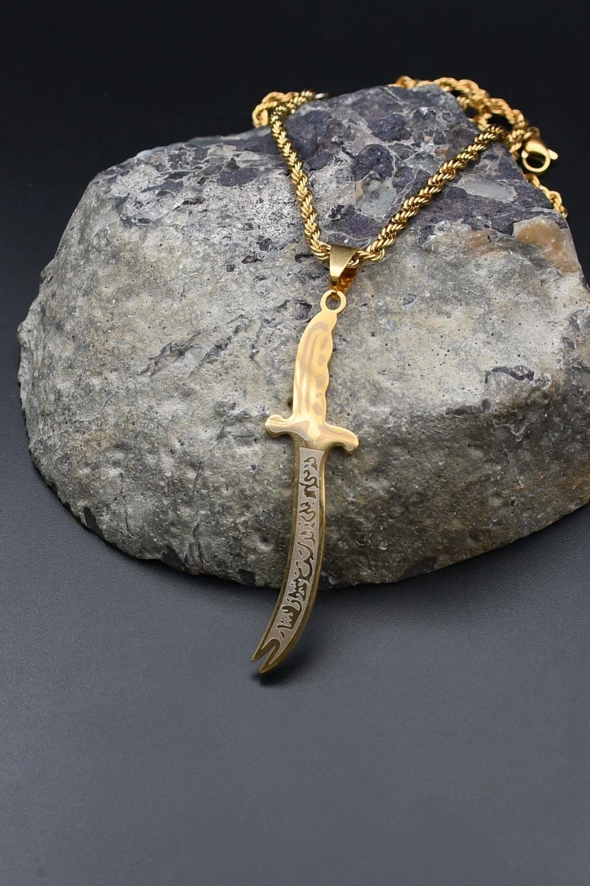 La Feta İlla Ali La Seyfe İlla Yazlı Zülfikar Kolye Paslanmaz Çelik Zincir Altın Kaplama 3mm 902308 Altın