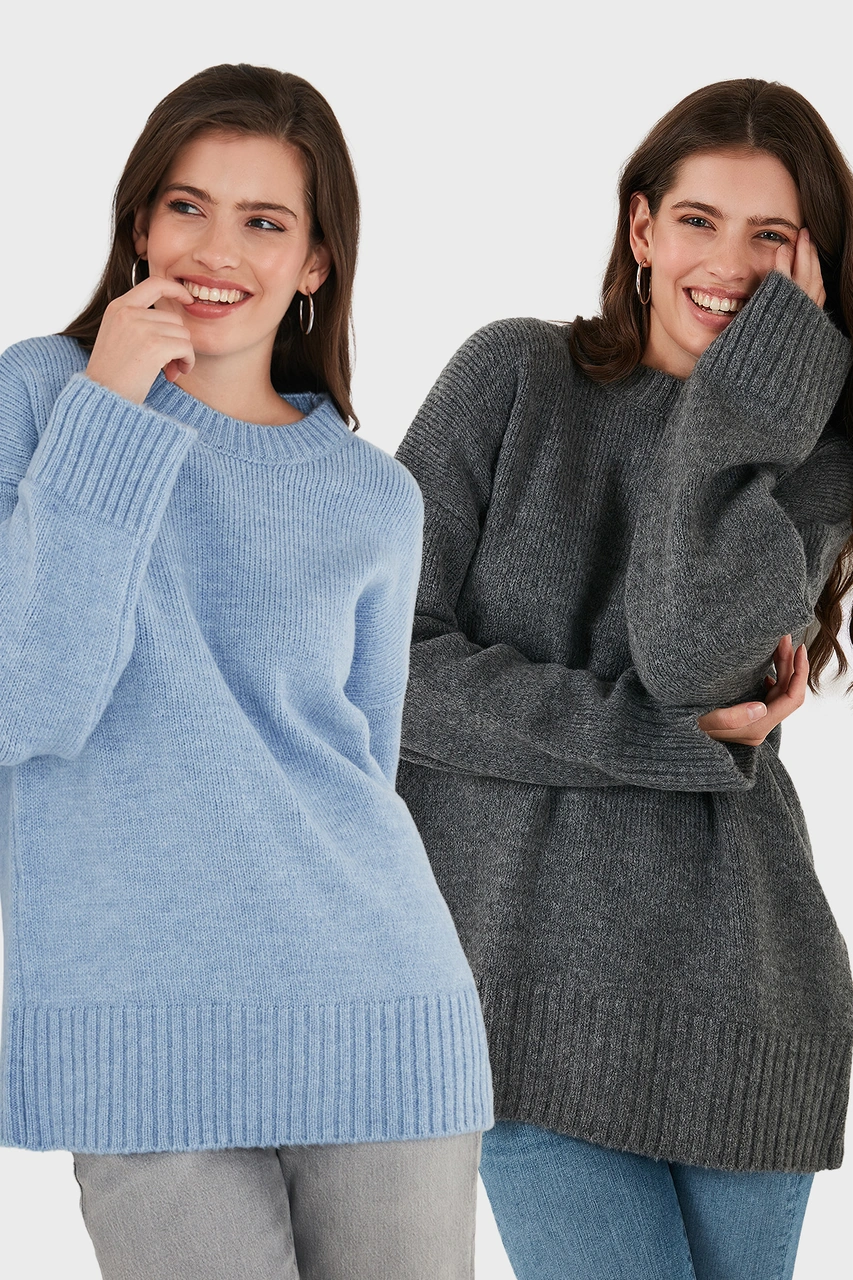 Lela Regular Fit Bisiklet Yaka Basic 2'Li Paket Triko Bayan Kazak 4616213S2 Antrasit-Bebe Mavi