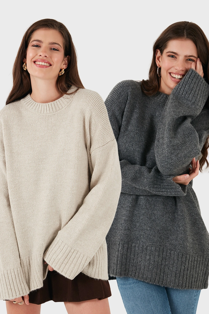 Lela Regular Fit Bisiklet Yaka Basic 2'Li Paket Triko Bayan Kazak 4616213S2 Antrasit-Taş