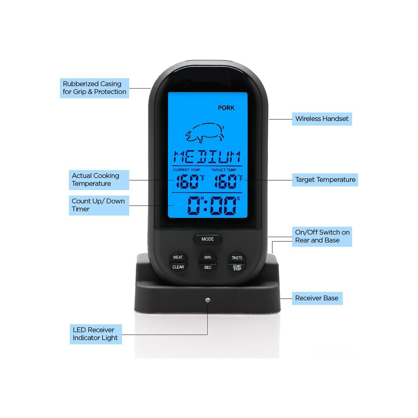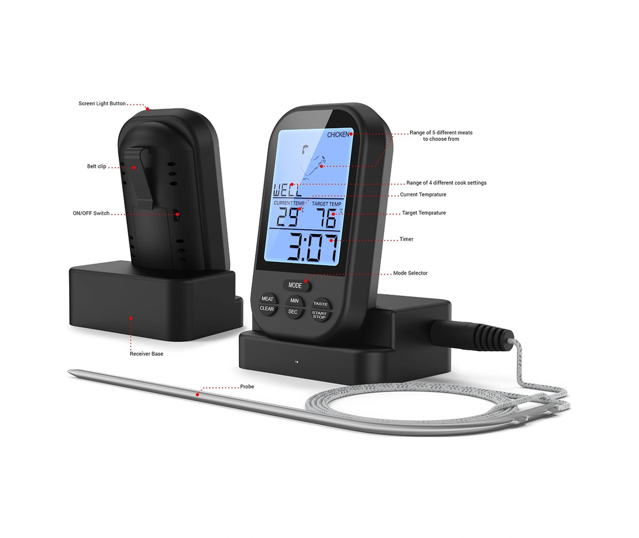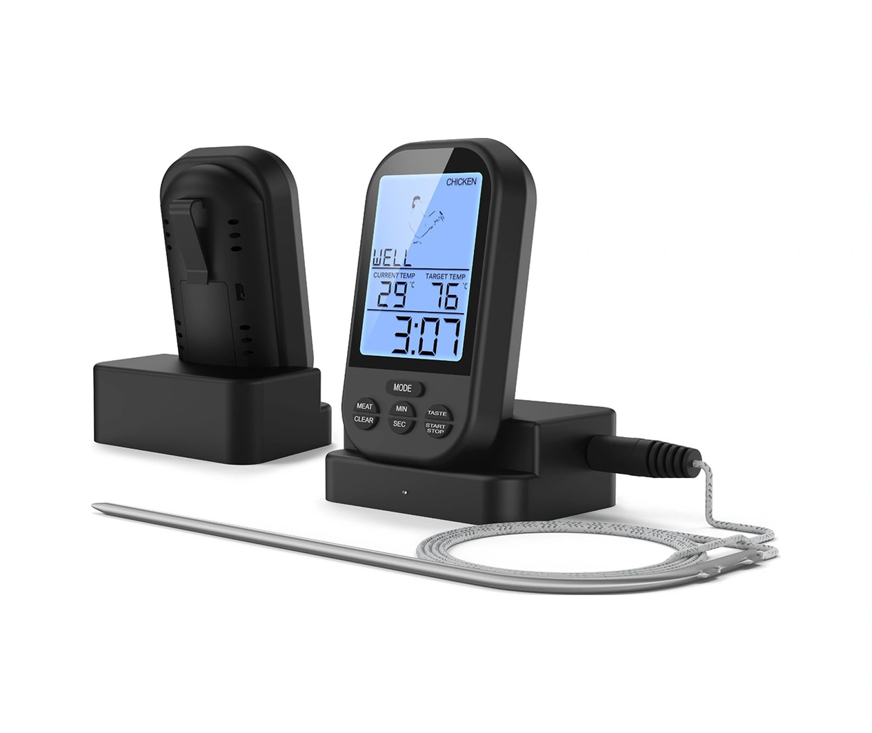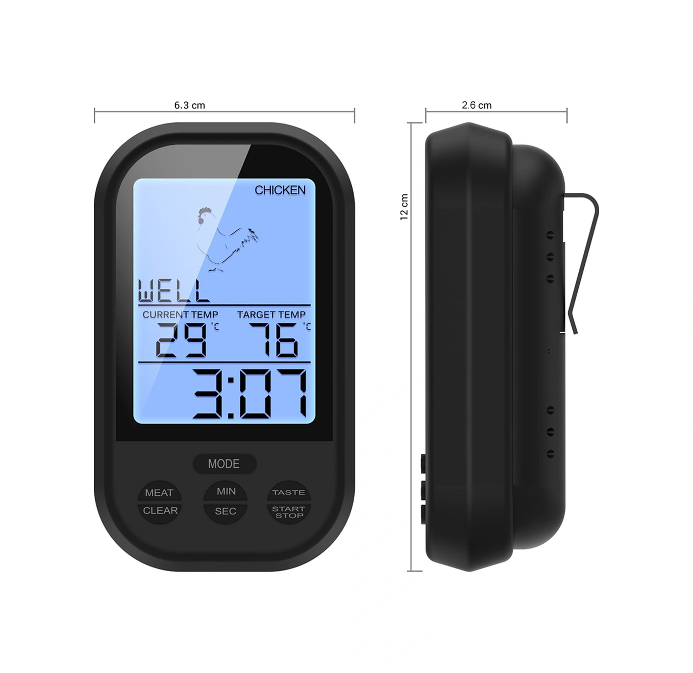 Lemestar Küçük Siyah Kablosuz Mutfak Isı Ölçer, 0-250 C Aralığı, 20-30m Alınım Mesafesi, Pil İçermez Çok Renkli