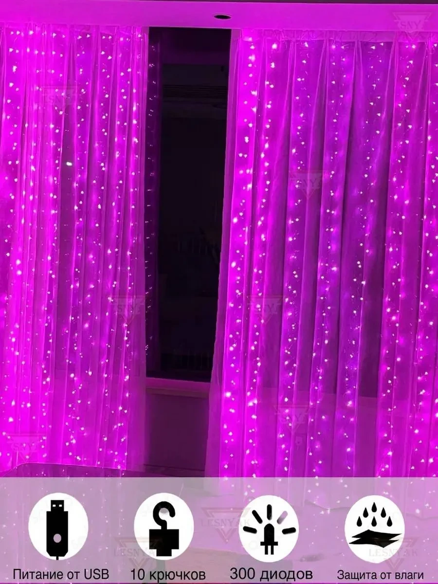 Lesnyak Usb Pembe Işık Perde Işık Zinciri 3x3 229067563 Pembe