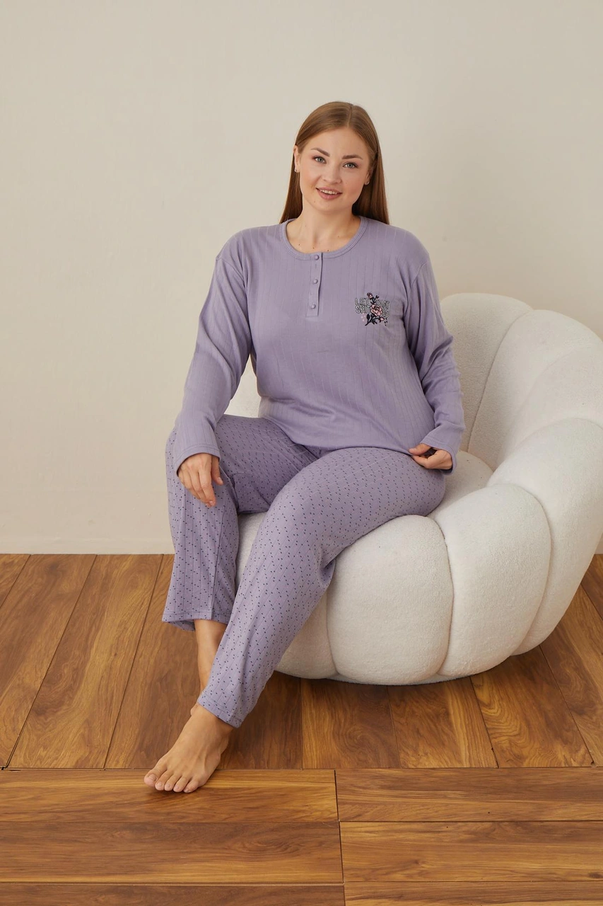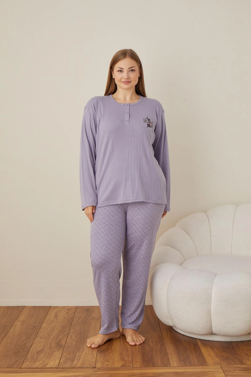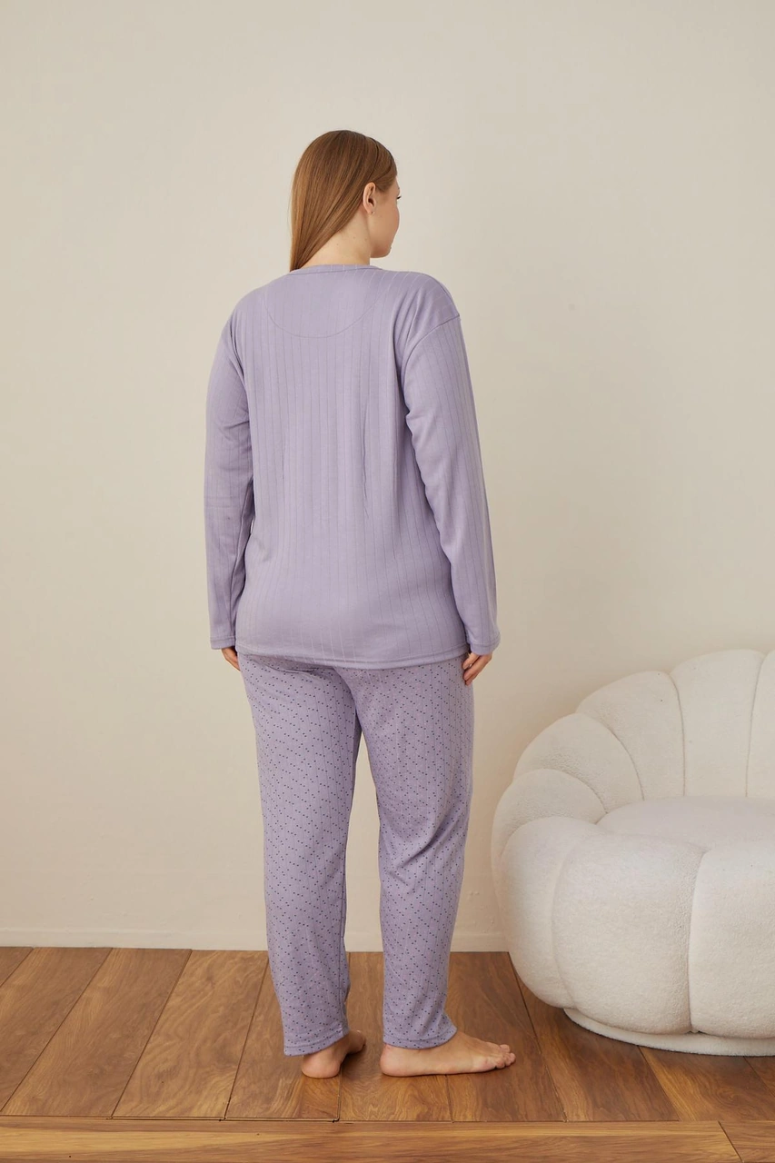 Lindros Kadın Pamuk'lu Düğme Yaka Raporlu İnterlok Kışlık Battal Pijama Takımı 05104 - 1 Adet Lila
