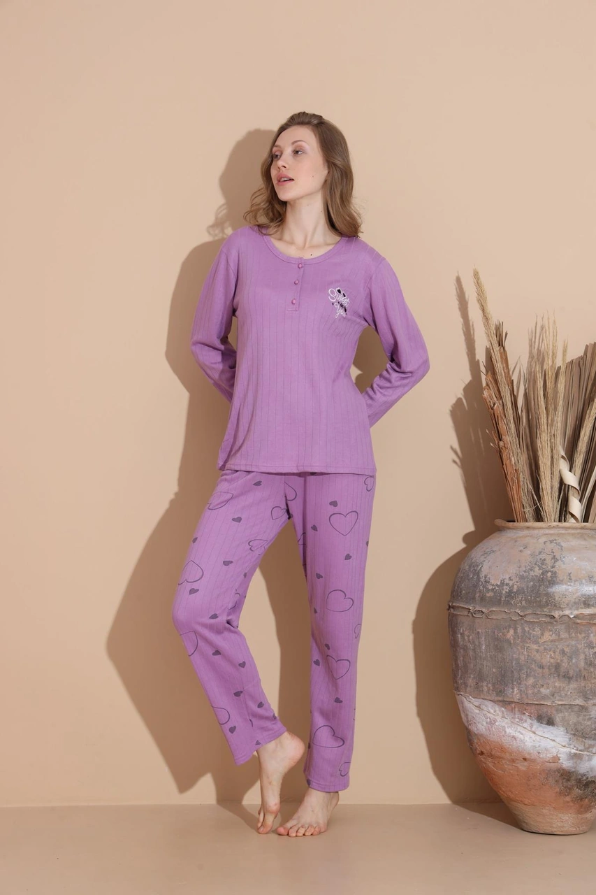 Lindros Kadın Pamuk'lu Düğme Yaka Raporlu İnterlok Kışlık Pijama Takımı 05034 - 1 Adet Mor