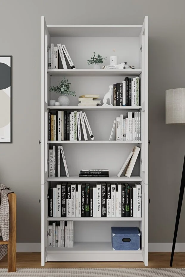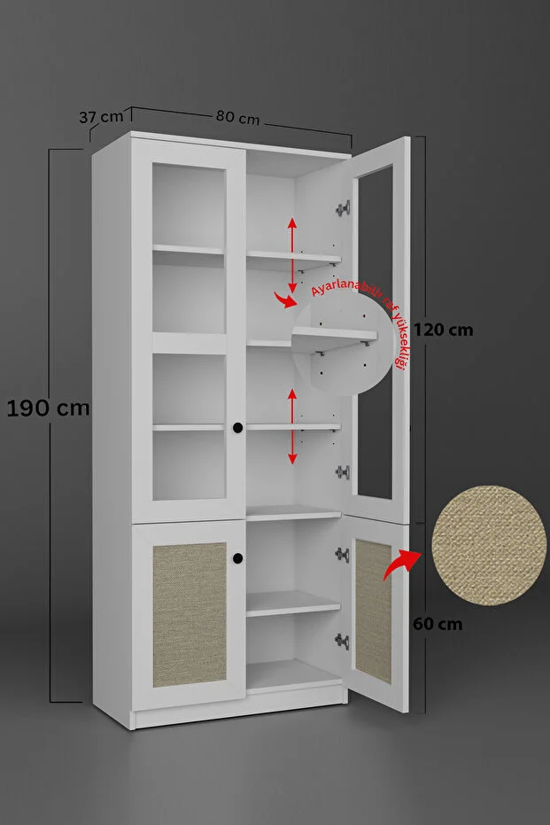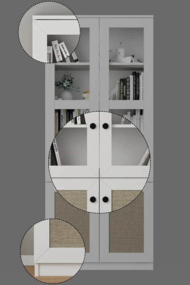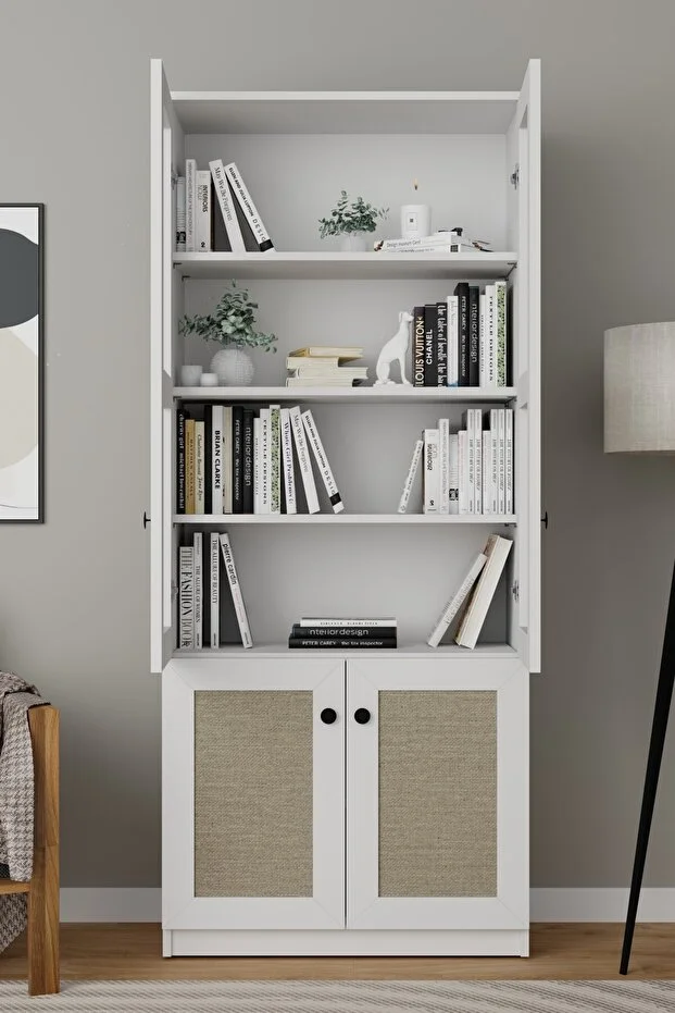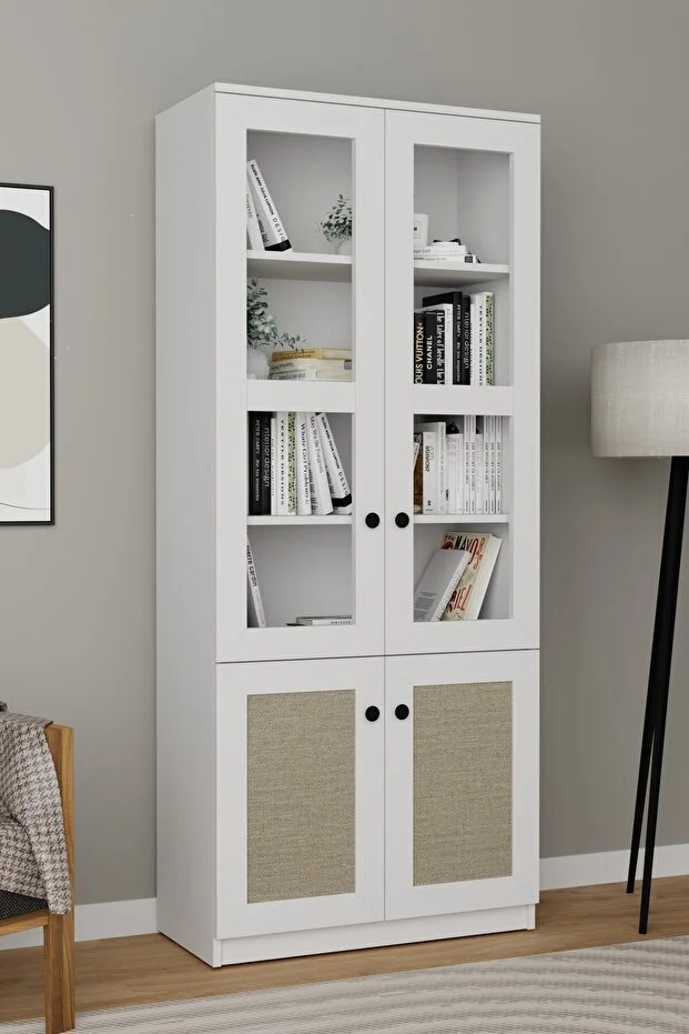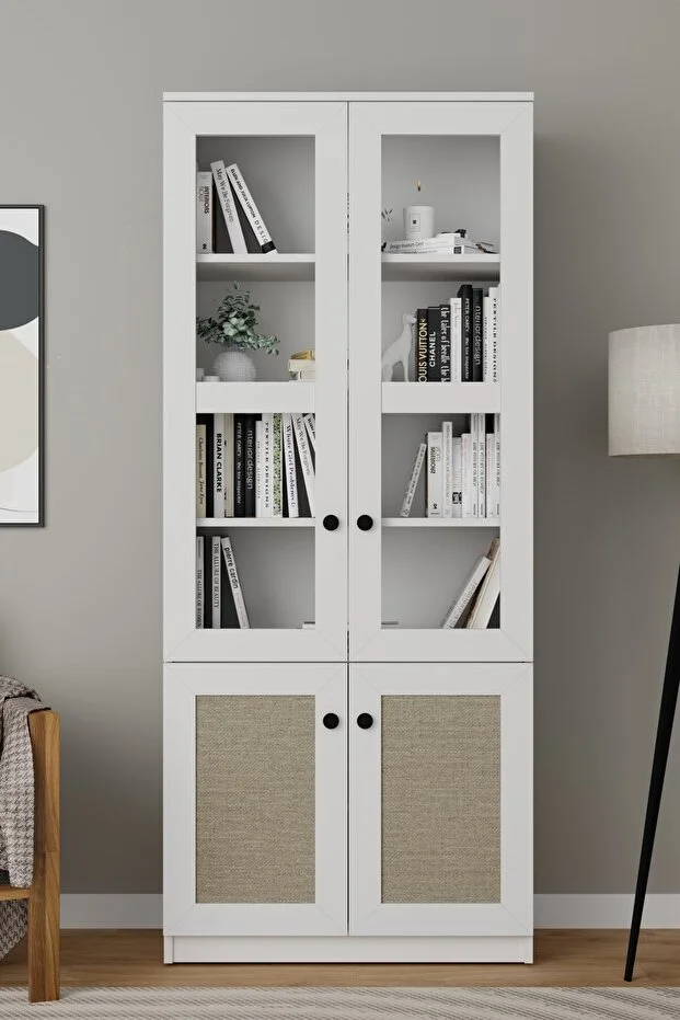 Lisa Kumaş Desenli 4 Kapaklı Beyaz Vitrin - Kitaplık Ve Çok Amaçlı Dolap Beyaz