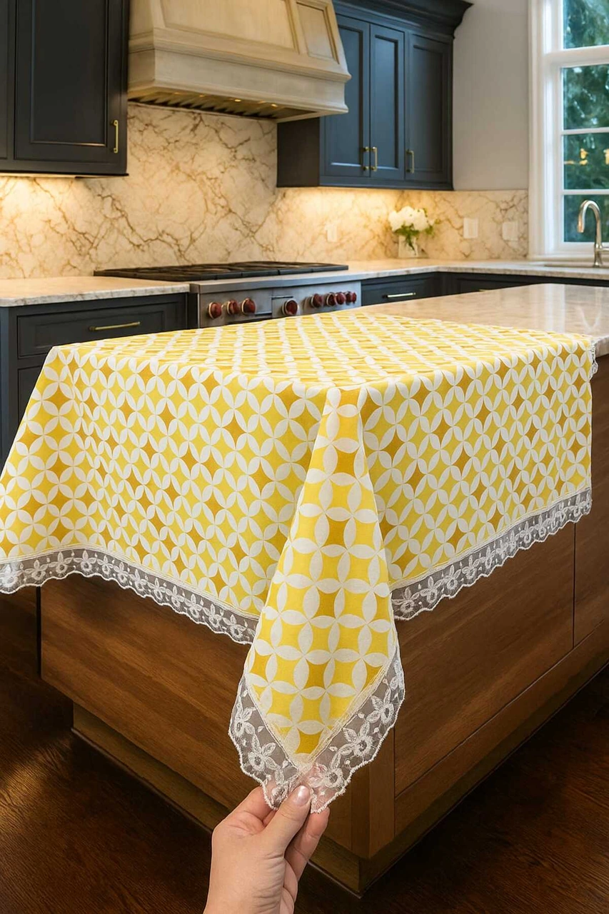 Lüks Güpürlü Sarı Duck Kumaş Masa Örtüsü Şık Desenli Su Geçirmez Silinebilir Sarı