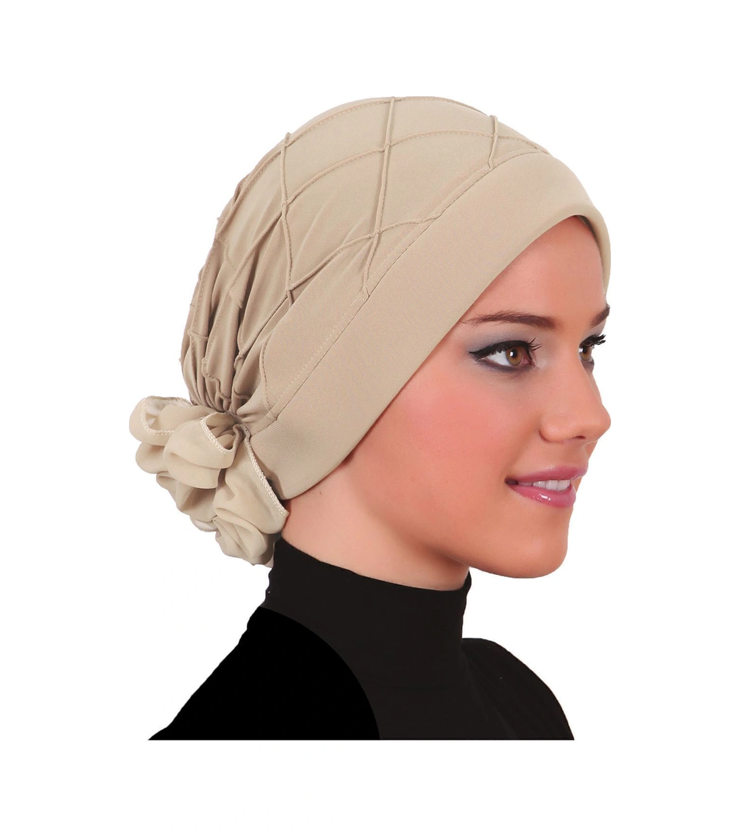 Lüks Nervürlü Arkası Şifon Aksesuarı Bej Hazır Türban Tesettür Bone Bej