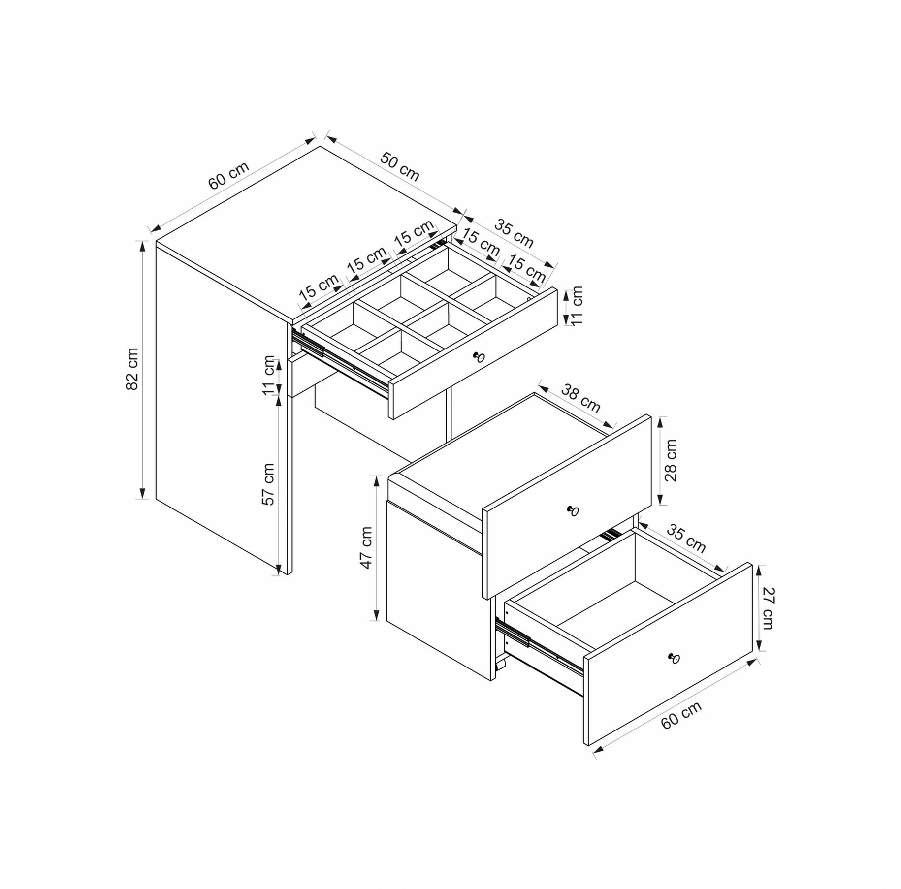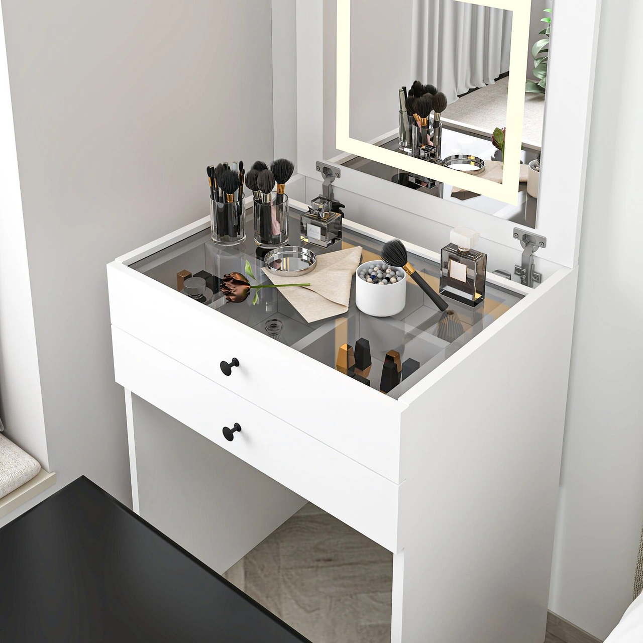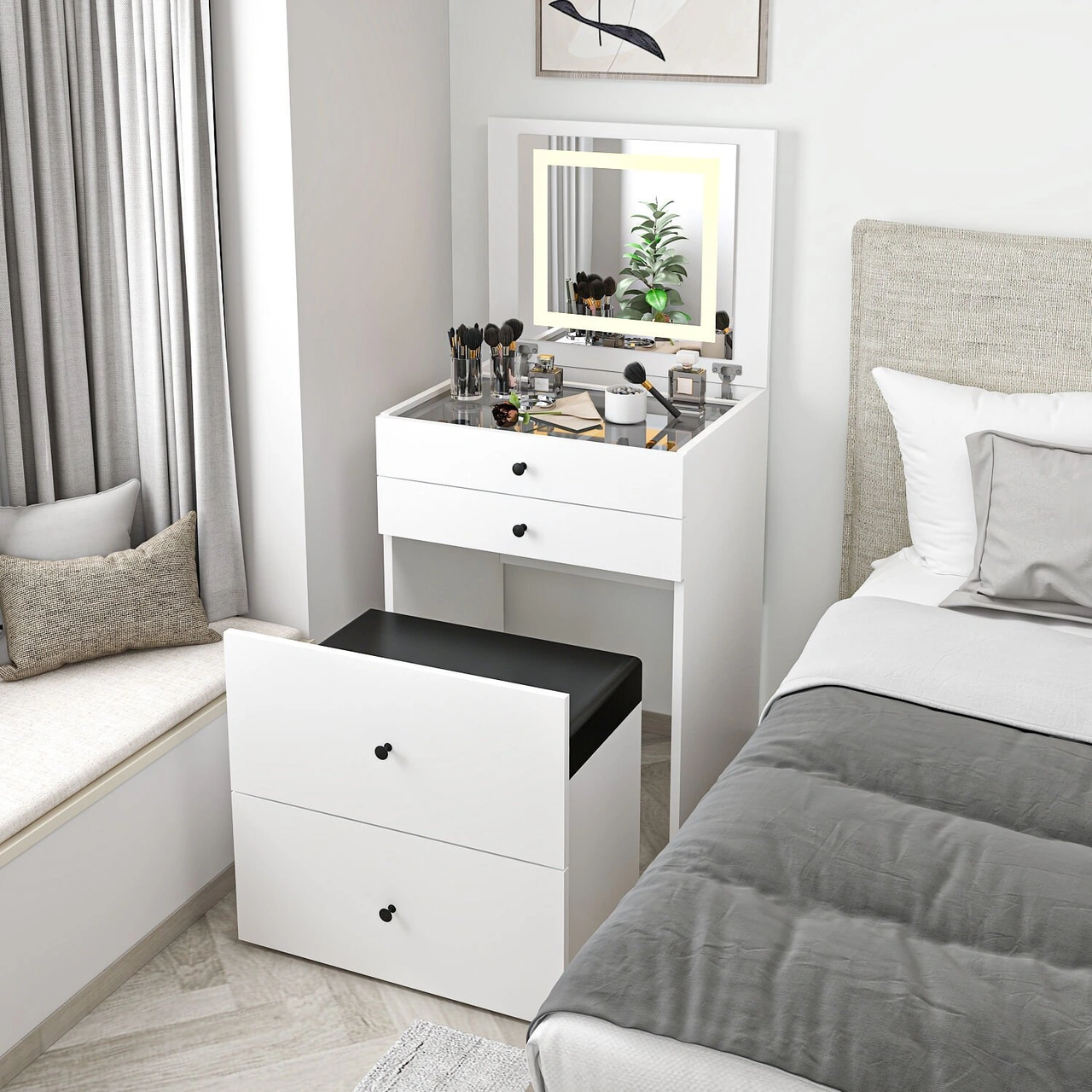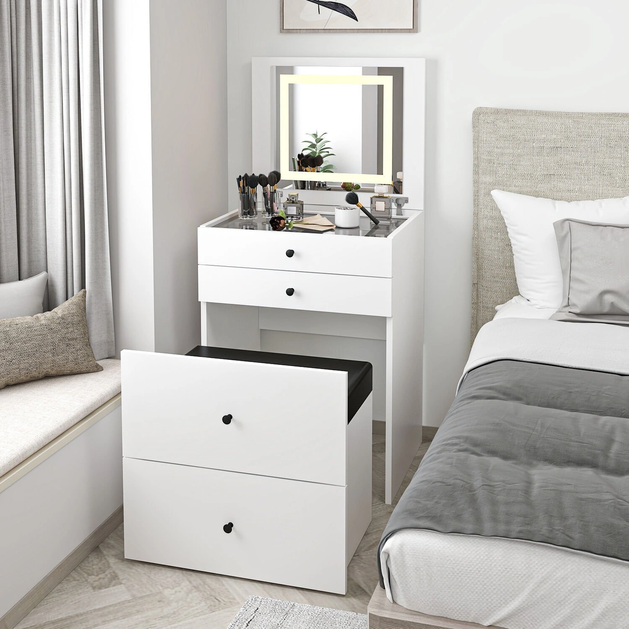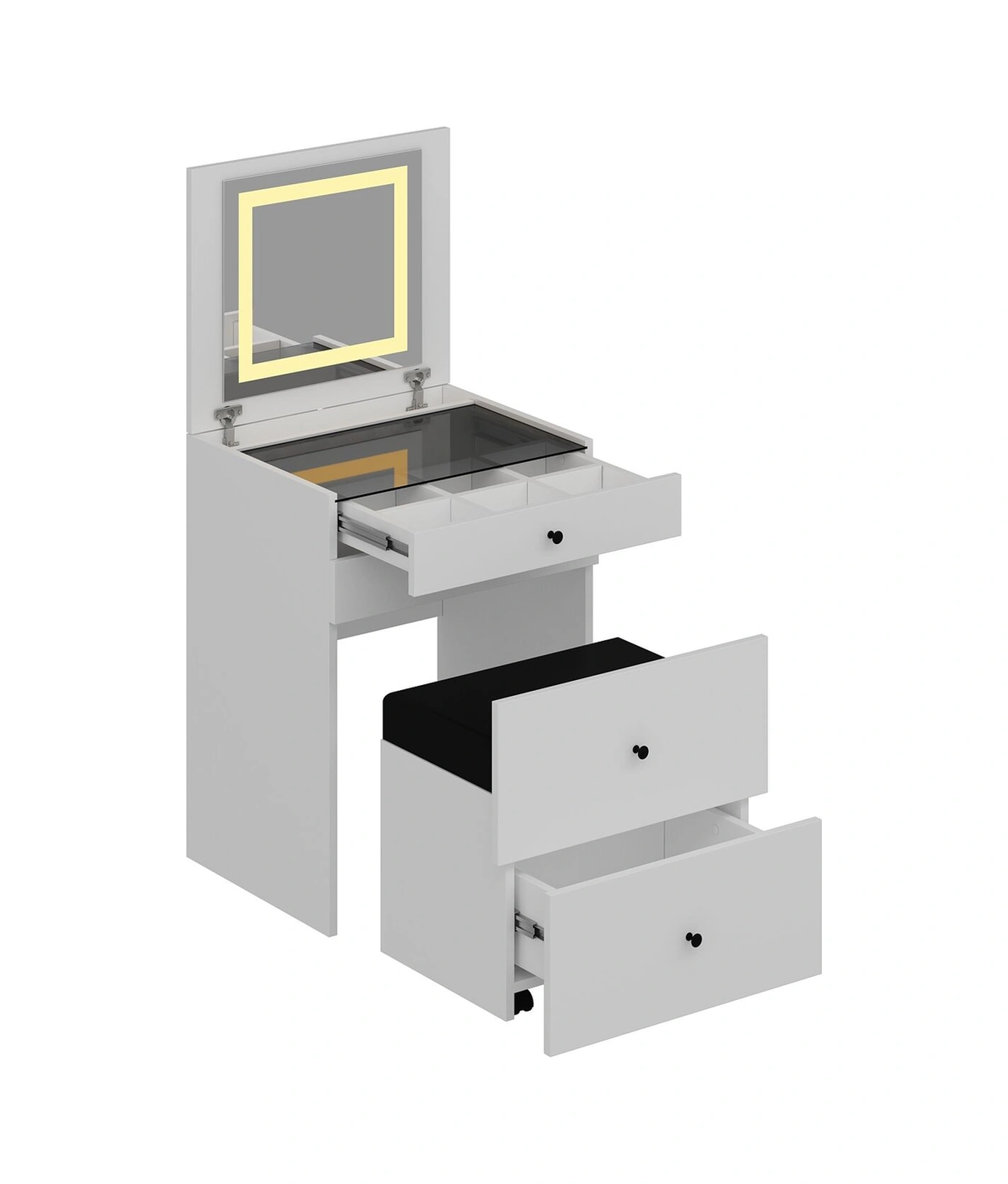 Luna Gizli Puflu Led Aynalı Makyaj Masası - Beyaz Beyaz