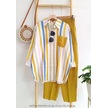 M-5xl Kadın Giyim İlkbahar Yaz Uzun Kollu Üst + Pantolon Yeni Çizgili Tek Sıra Yaka Gömlek + Geniş Paça Pantolon 2 Adet Sarı