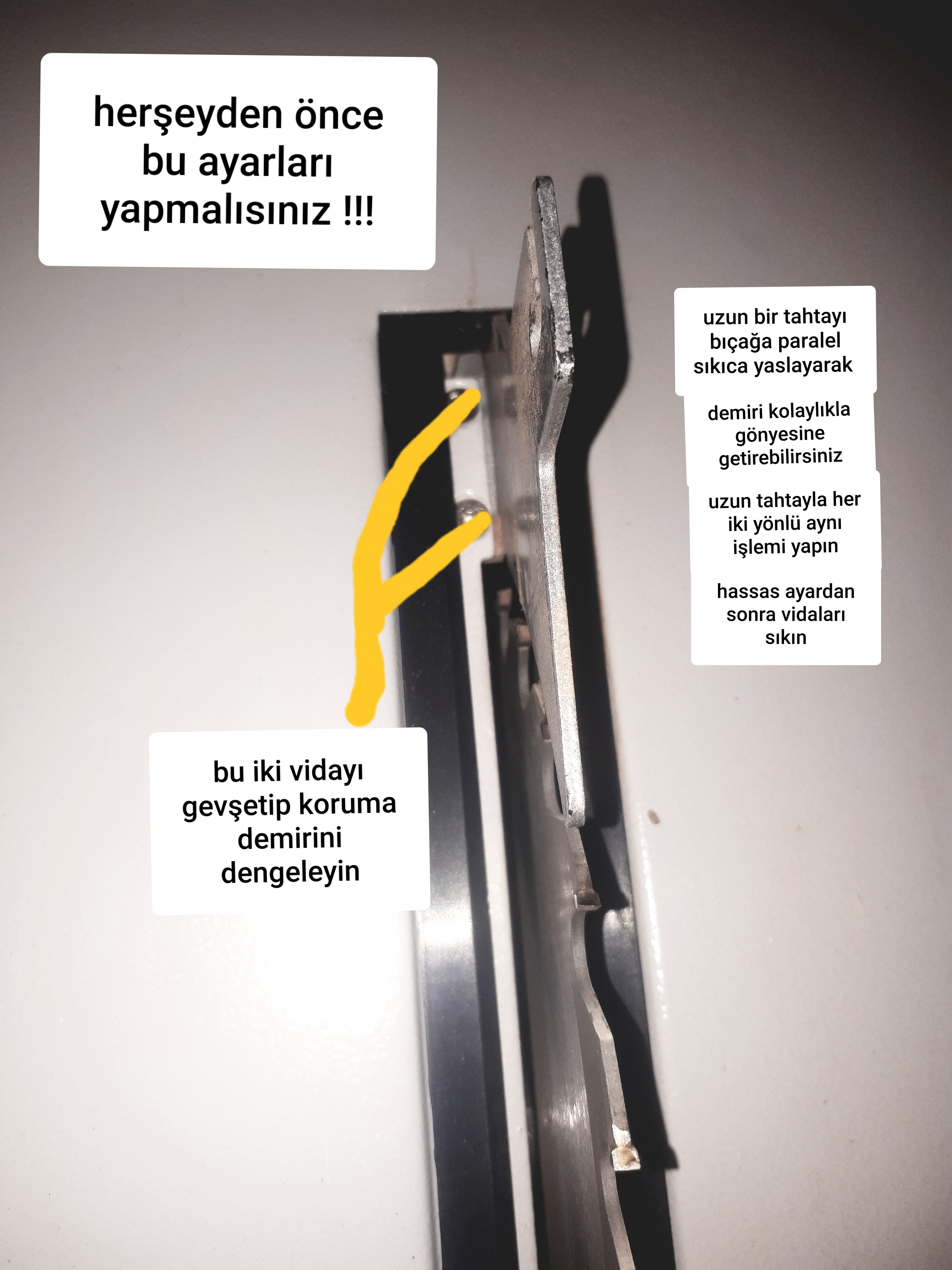 Kutusundan çıkardığımda evet bi kaç kusurla birlikte hatalı kesim yapıyodu.....Hepinize önerim...düzgün kesim yapamayanlar için... 1) bıçak koruma demiri ayarsız gelebilir ki bende öyleydi...kesime başladığım zaman hem sapma yapıyor hem koruma demirene çarpıp sıkışma yapıyordu...bıçak çerçevesi olan kısmı sökün...iki vida göreceksiniz....gevşetip demiri hizaya getirin...2) her iki şeritmetreyi kontrol edin bende hizalı değildi ....şimdi kesim son derece mükemmel... 0.1 mm bile sapma yok...