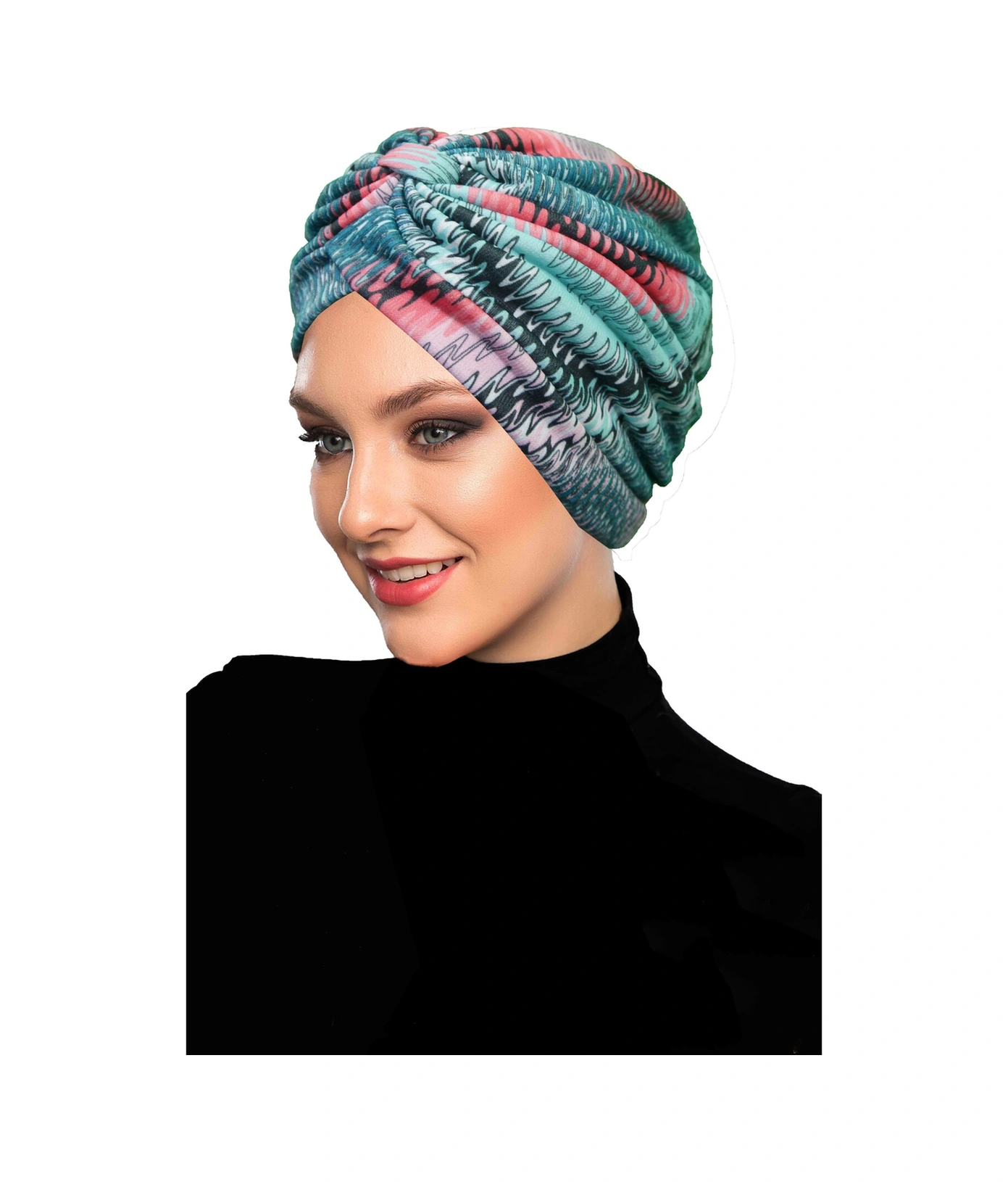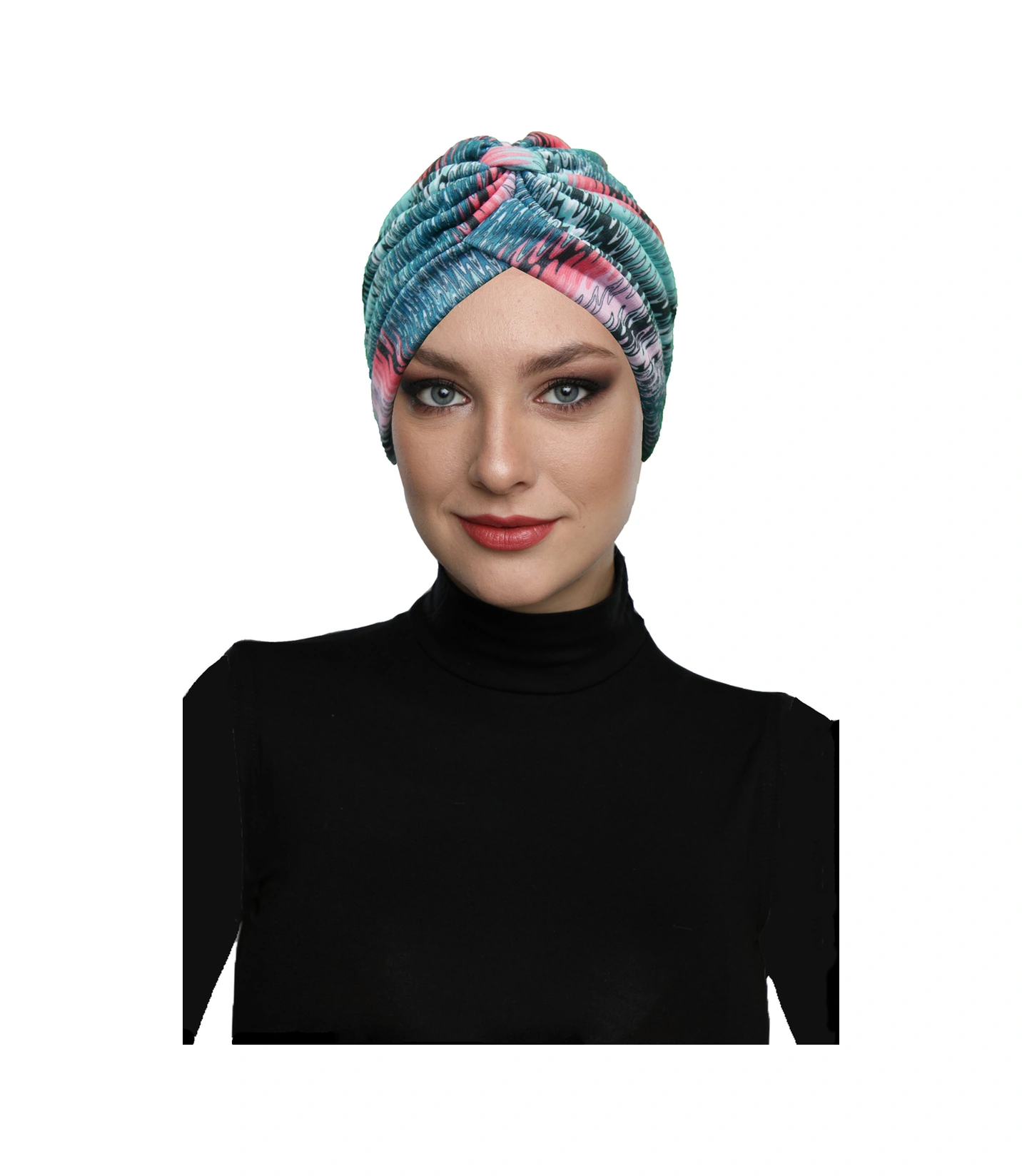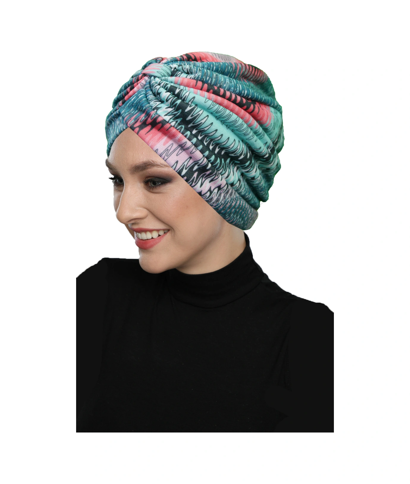 Mavera Model Renkli Desenli Çapraz Ve Bant Detaylı Astarlı Hazır Türban Tesettür Havuz Bonesi Yeşil