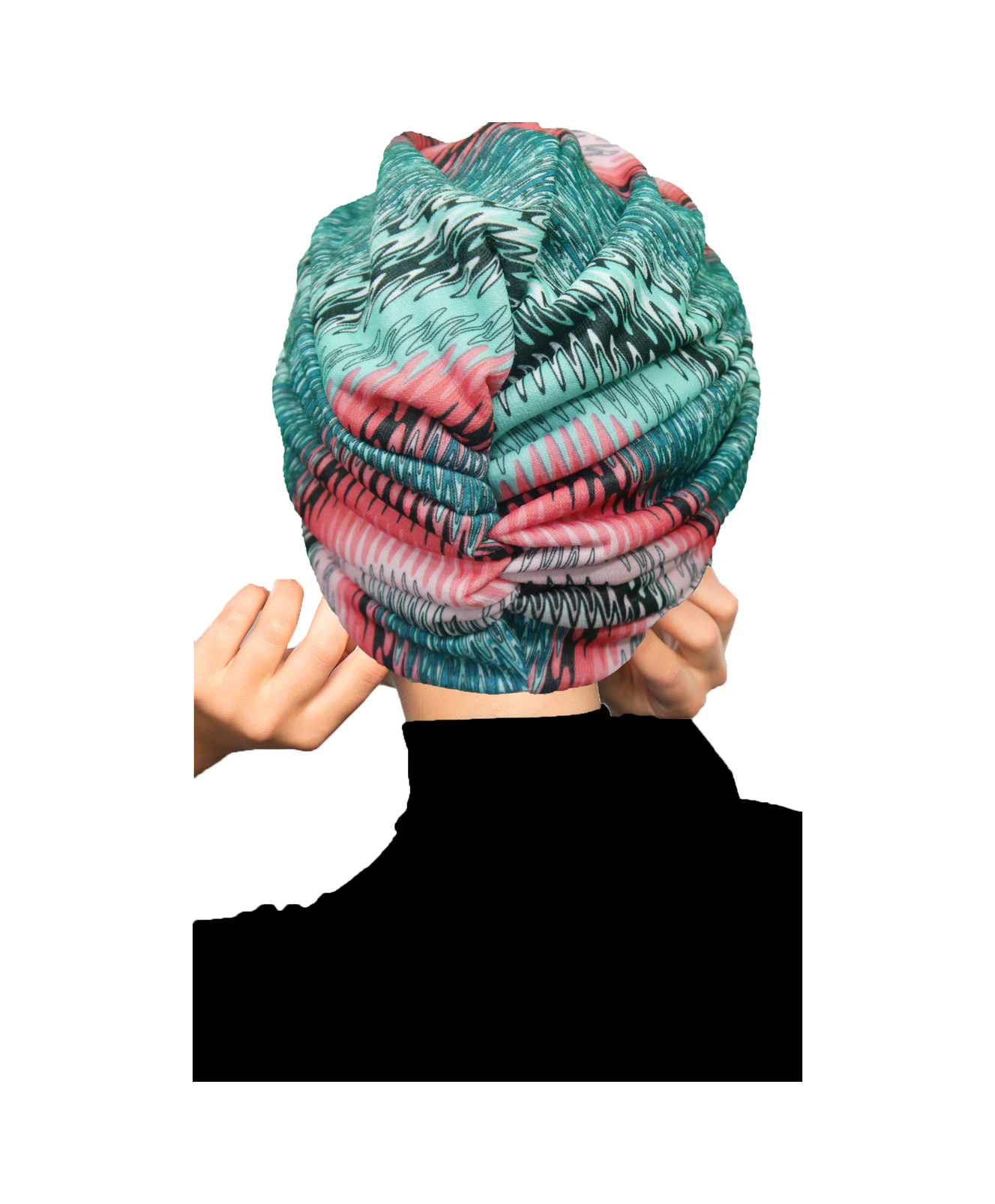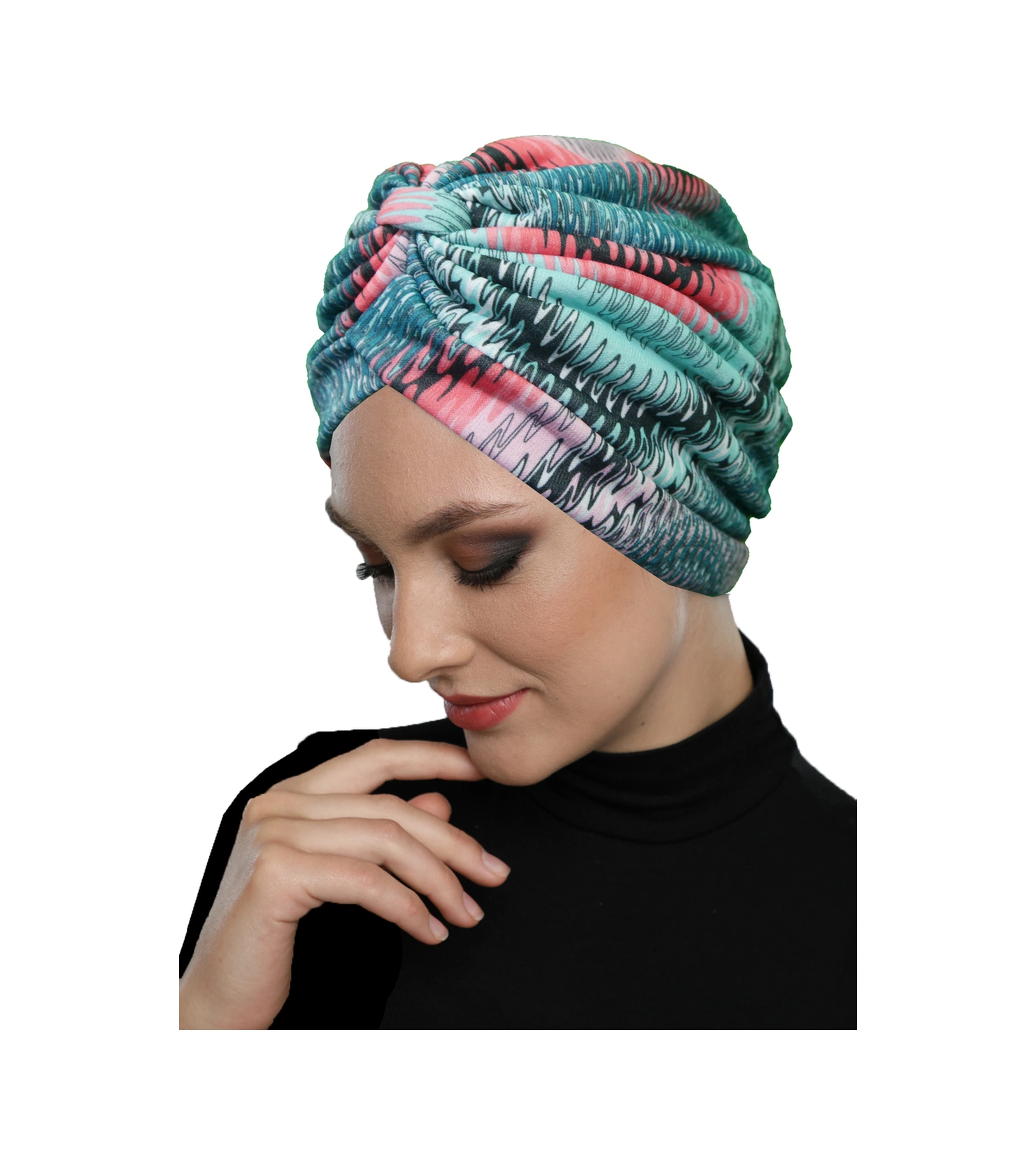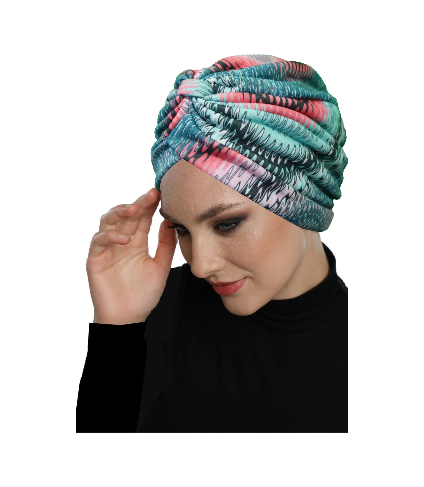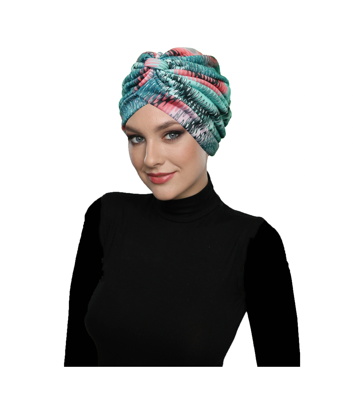 Mavera Model Renkli Desenli Çapraz Ve Bant Detaylı Astarlı Hazır Türban Tesettür Havuz Bonesi Yeşil