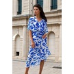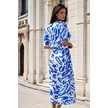 Mavi Beyaz Desenli, V Yaka, Kuşak Detaylı, Uzun Elbise Mavi
