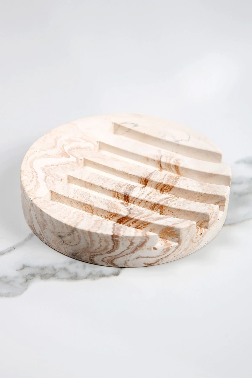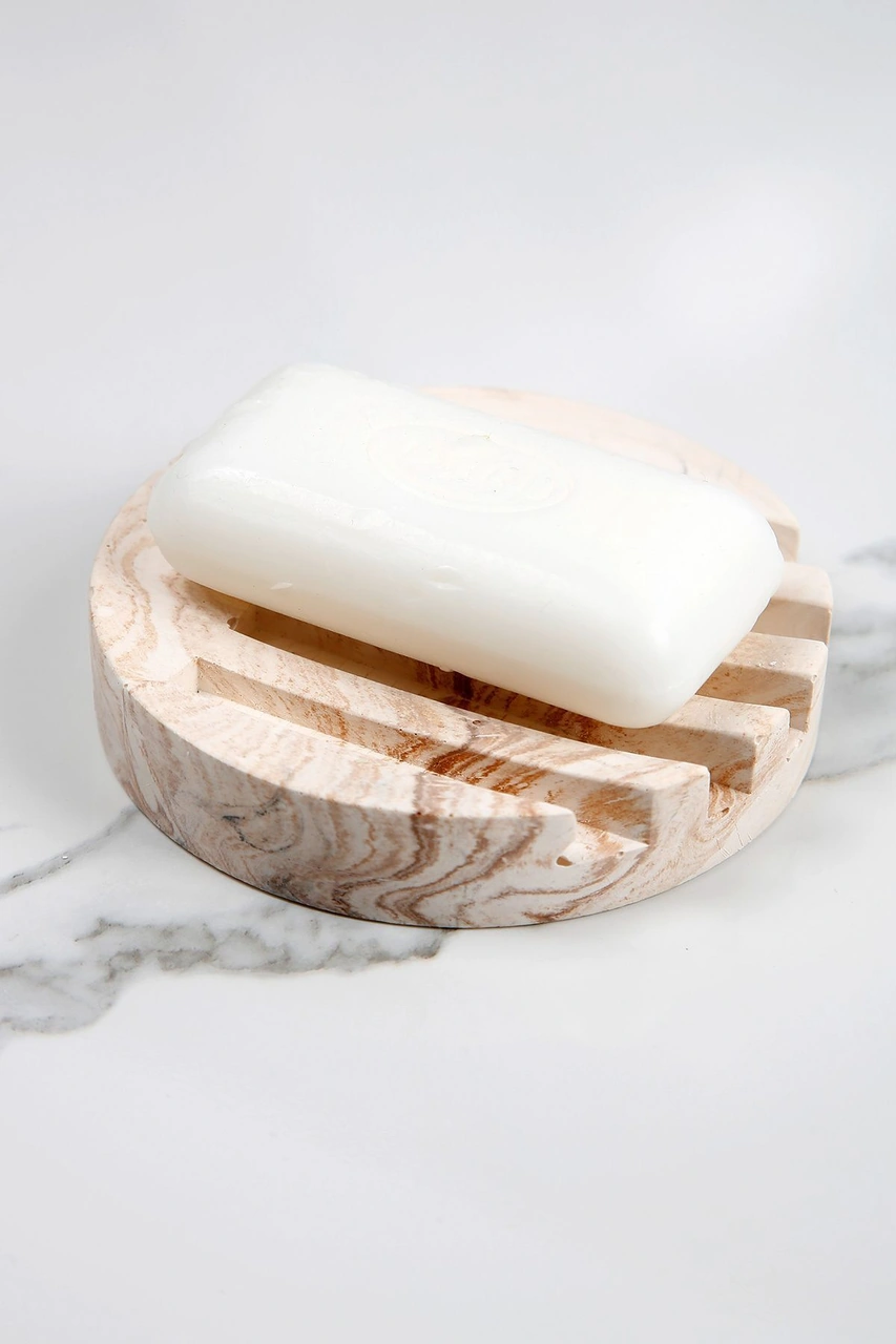 Mermer Desenli Yuvarlak Model Beton Katı Sabunluk Su Giderli 10 Cm Bej