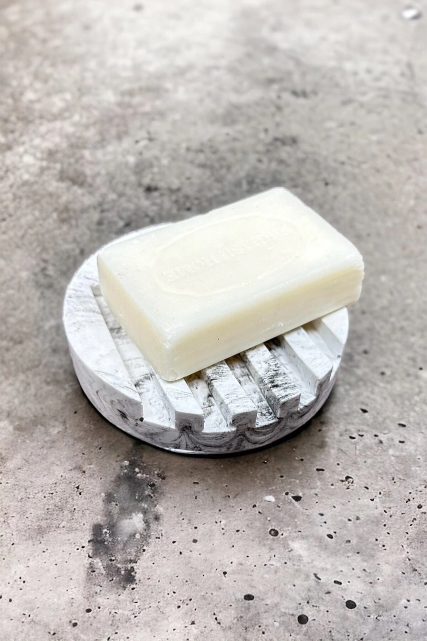 Mermer Desenli Yuvarlak Model Beton Katı Sabunluk Su Giderli 10 Cm Beyaz
