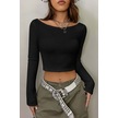 Merry See Kayık Yaka Örme Uzun Kollu Crop Top Bluz Siyah