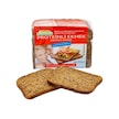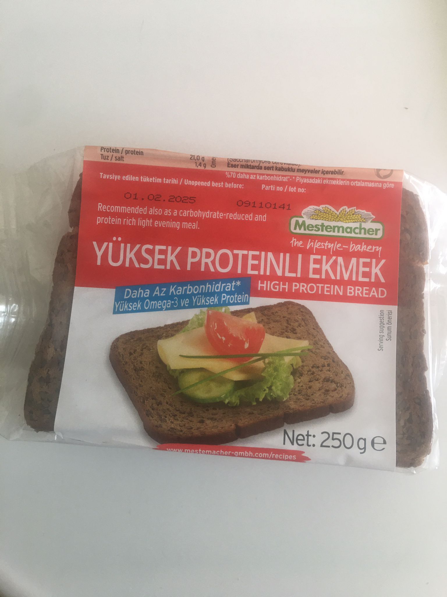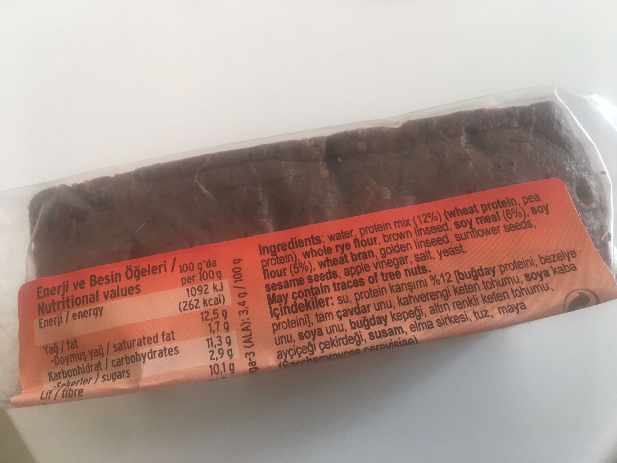 Mağazaya ithal edip hızla ve özenle paketleyerek ulaştırdıkları bu ürün için teşekkür ederim. Üründen e262 çıkarılmış ve onun yerine asitliği düzenlemek için elma sirkesi kullanılmış. Yulaf lifi, peynir altı suyu tozu ve çavdar unu da (tam çavdar unu tabii ki duruyor) çıkarılmış. Besin değerleri de fotoğrafladığım şekilde değişmiş, protein 21.0 g. Bir de ürünü omega-3 açısından vurgulayıp 100 g'da 3,4 g omega-3 yazmışlar. Beş ekmek dilimi var.
