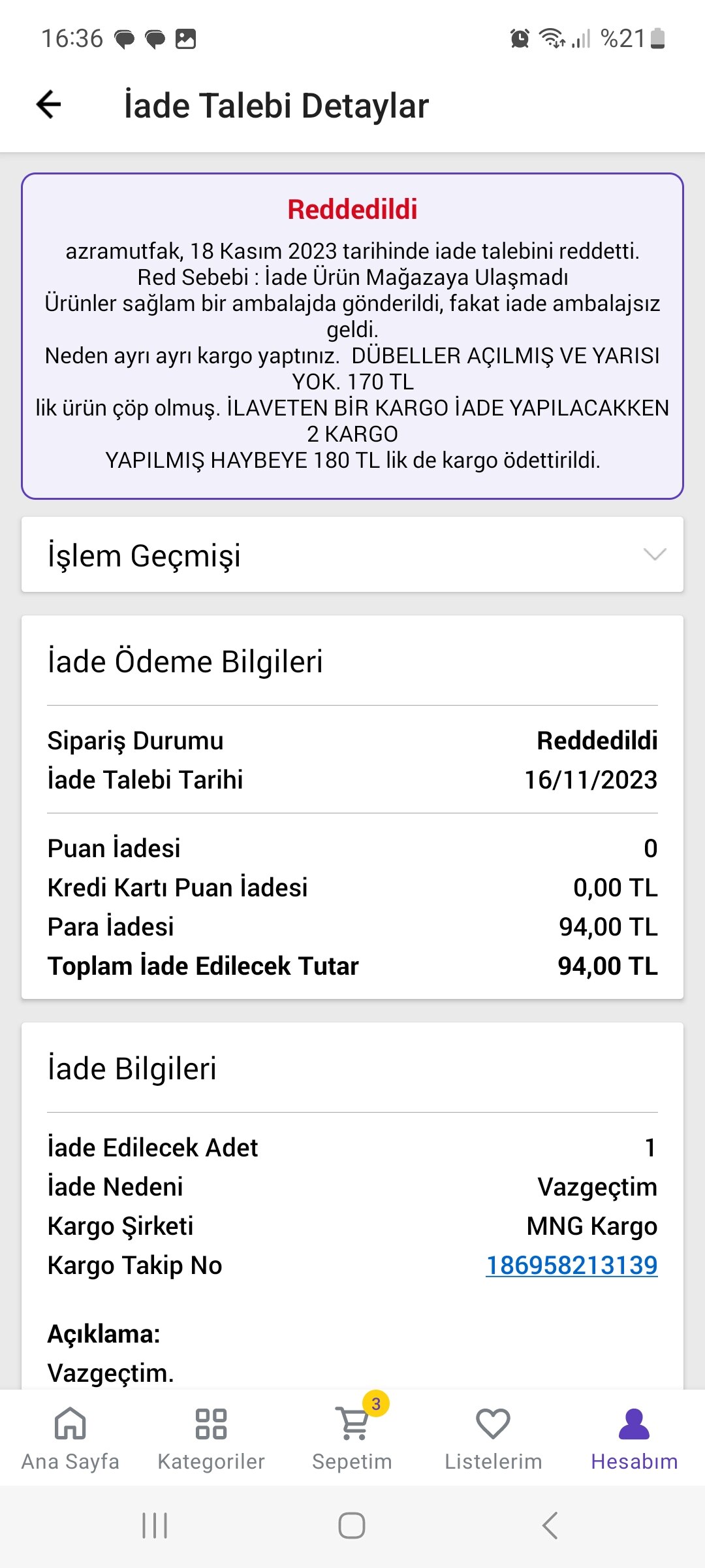 Ölcüler yanlış, mobilyaya uymadi. iki ürün almistim, toplu iade etmek istedim. sistem iki ayri iade kodu verdi ve kargo tek pakette iadeyi kabul etmedi, ayri ayri paket olacak dedi. Güzelce paketleyip patpata bile sardim, Neden iki ayri kargo yaptınız diye satici bana bir de fırça atti. Kargoda ürünler zarar gördü diye satıcı iadeyi reddetti. Kargonun kusurunu bana fatura etmeye çalışıyor. Doksan liraya sattigi bu dübelllerin tanesi piyasada en fazla iki lira. Yazik...