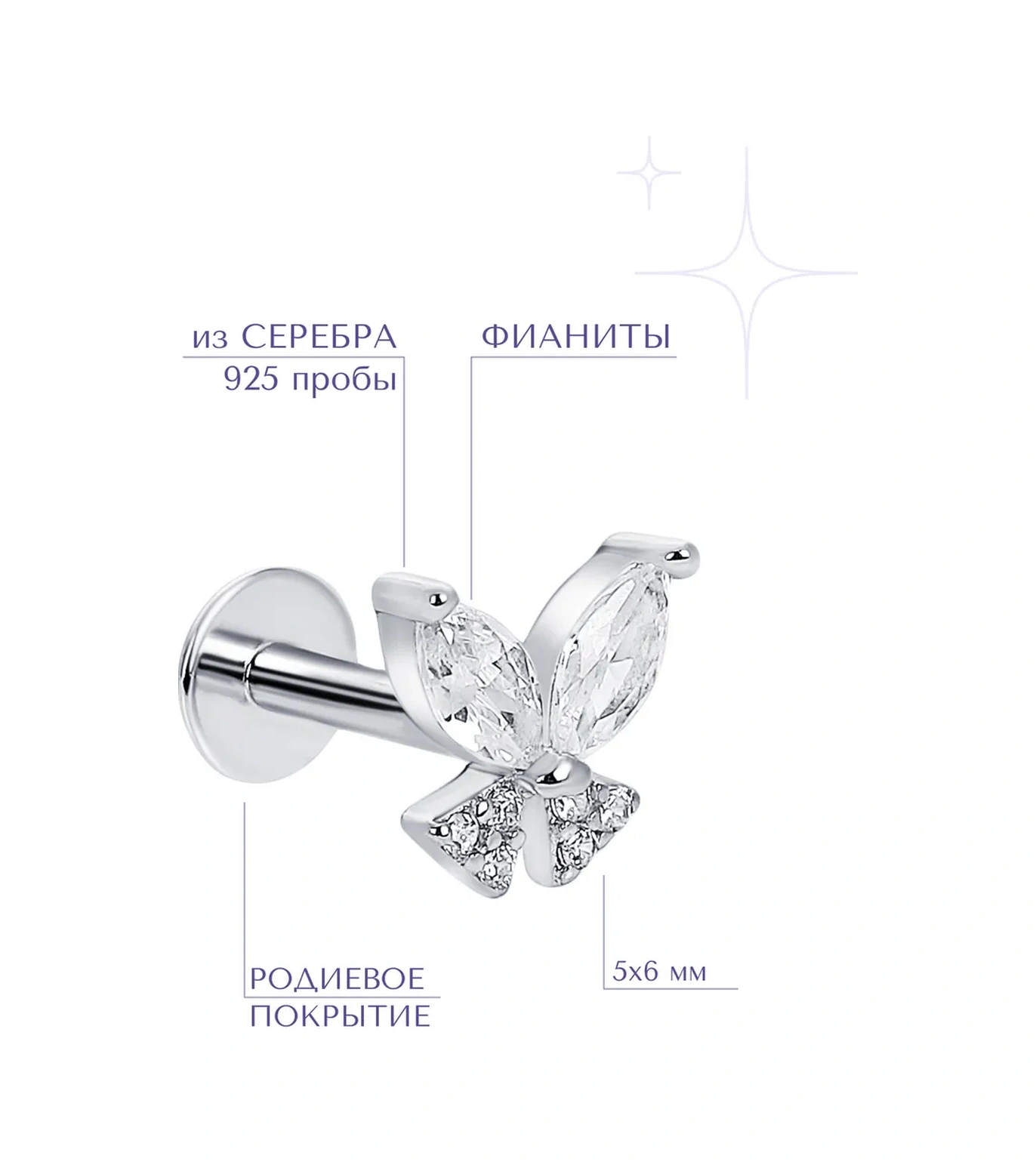 316l Çelik Gümüş Renk Zirkon Taşlı Kelebek Model Sallantı Detay Tragus Piercing Gümüş
