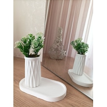Mini Desenli Beton Saksı Tekli Ve Oval Tabak - Yapay Çiçek Hediyeli - Beyaz Tomurcuk