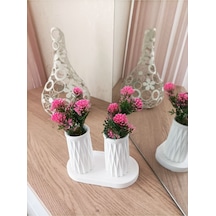 Mini Desenli İkili Beton Saksı Ve Oval Tabak - Yapay Çiçek Hediyeli - Pembe Tomurcuk