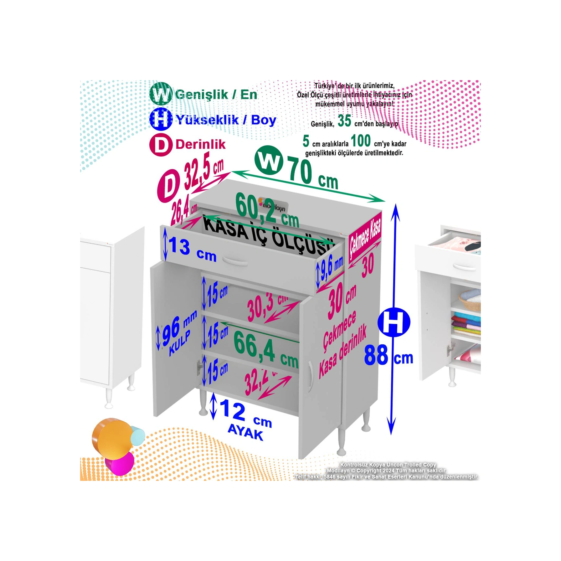 Mira Banyo Ve Mutfak Dolabı Çok Amaçlı Dolap Tek Çekmece 2 Kapak 3 Raf 4 Bölme 70x88x32,5 Cm Beyaz