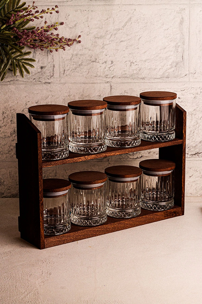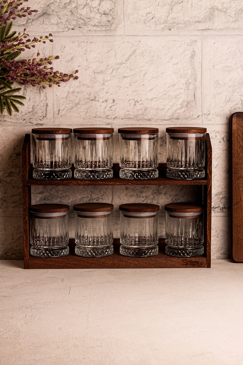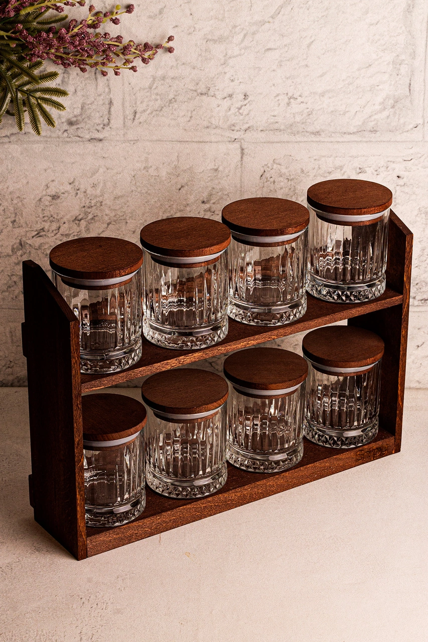 Mira Küçük - Standlı 8'li Vakumlu Ahşap Kapaklı Cam Baharatlık Takımı Saklama Kabı Seti 210 Ml Ahşap